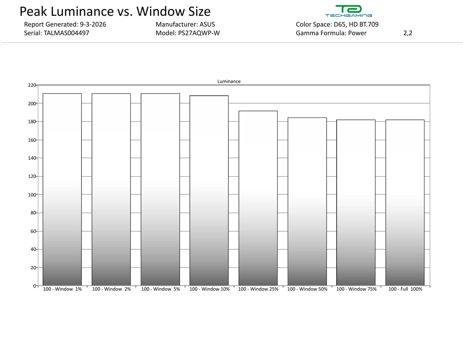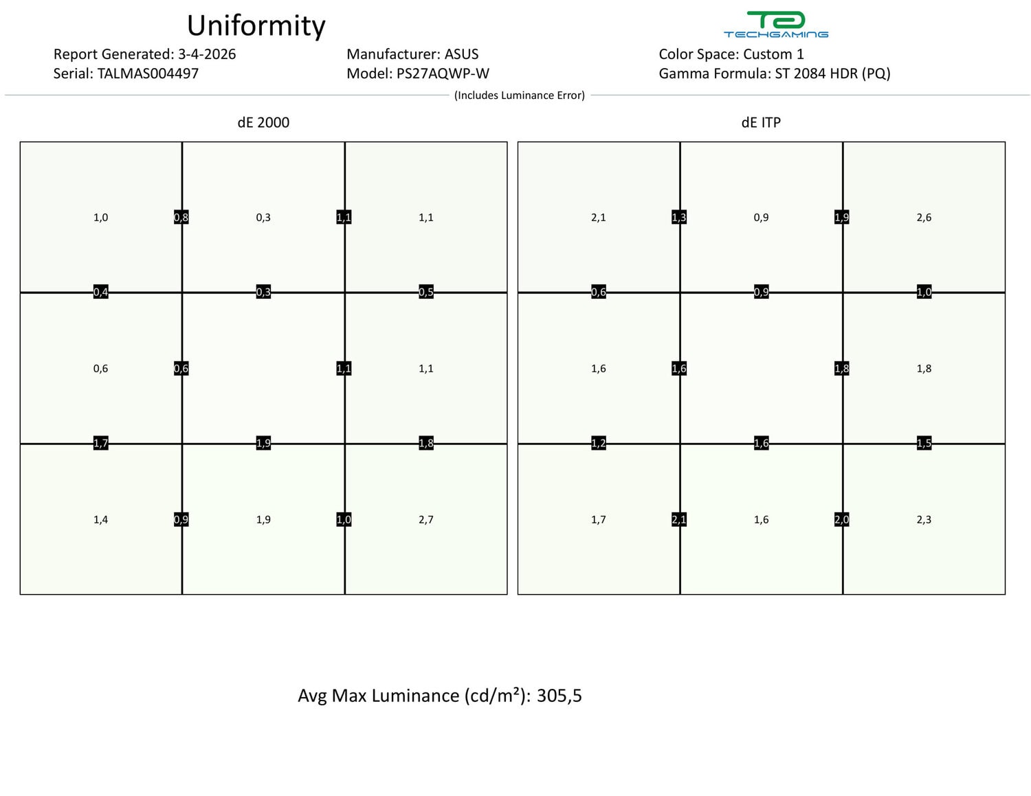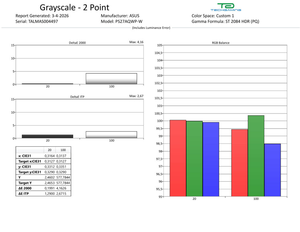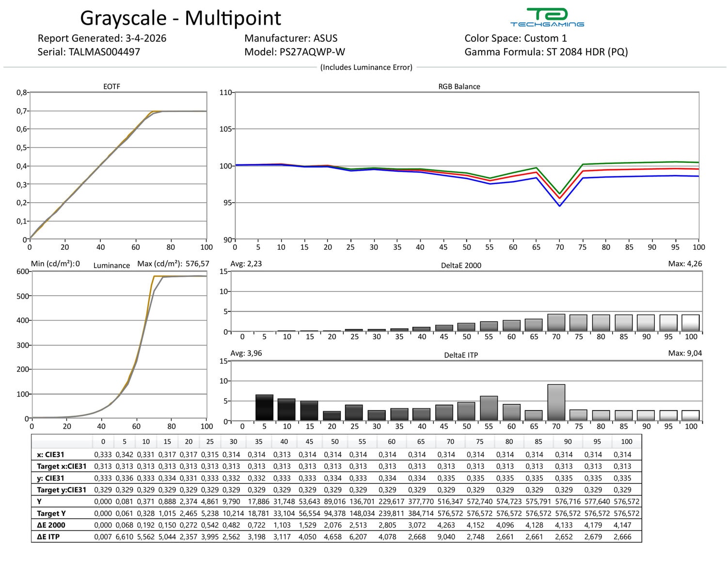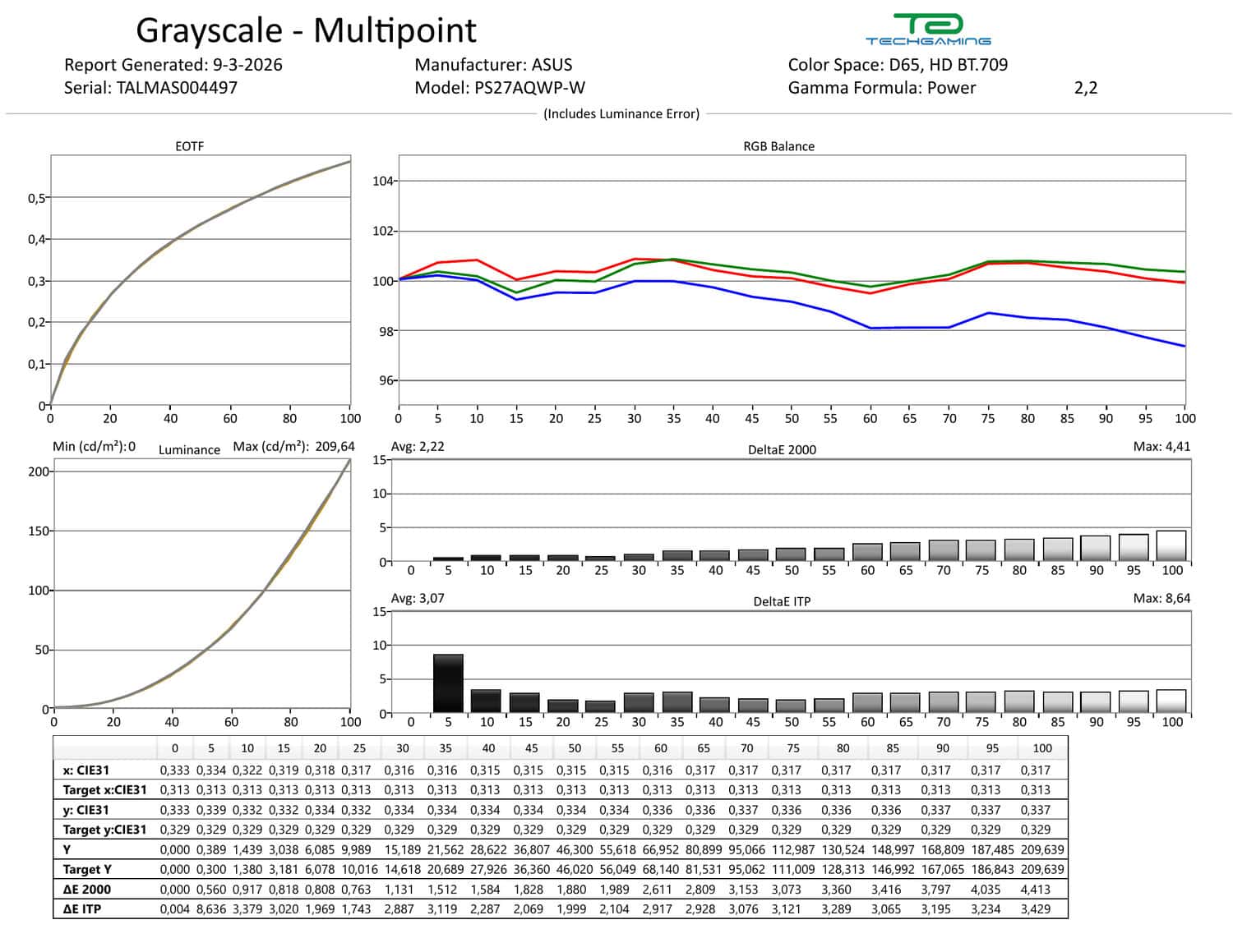 In combinatie met de maximale luminantie resulteert dit in een praktisch oneindige contrastverhouding. De maximale luminantie ligt binnen het bereik dat geschikt is voor SDR-gebruik. Dit zorgt voor een voldoende helder beeld voor gebruik in standaard binnenomgevingen. De gammaweergave volgt over het algemeen de beoogde 2.2-curve. De grijsbalans toont dat de RGB-kanalen grotendeels in lijn liggen met beperkte afwijkingen over het gehele bereik.
