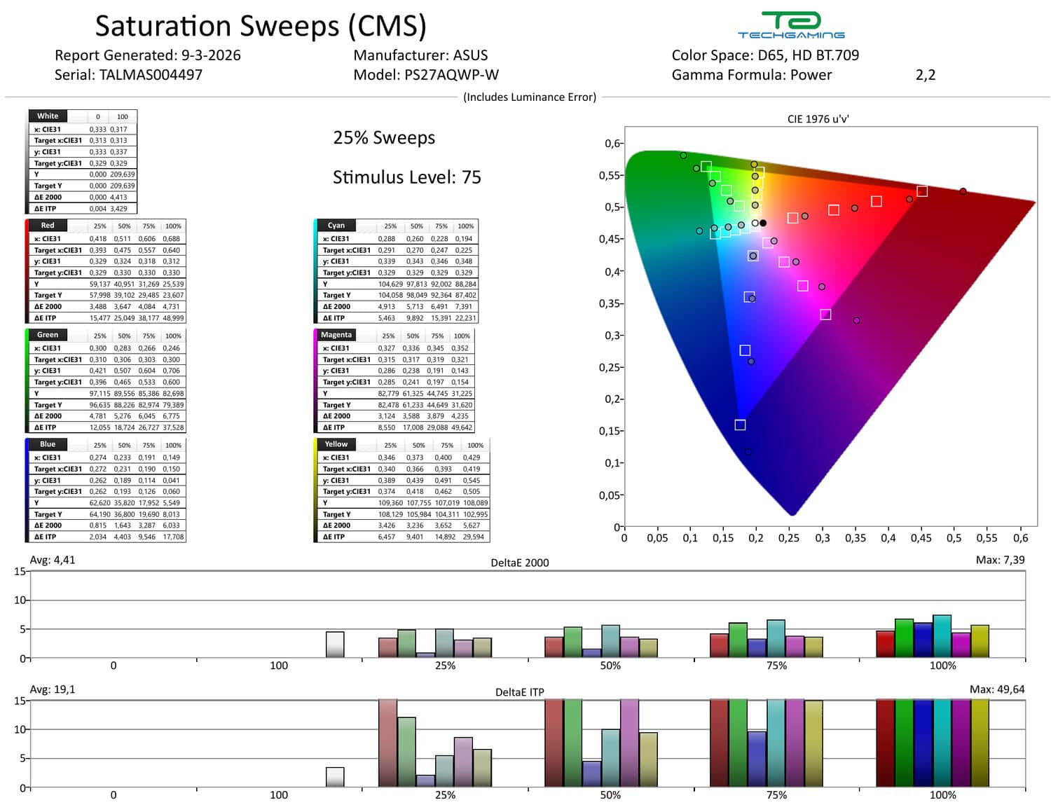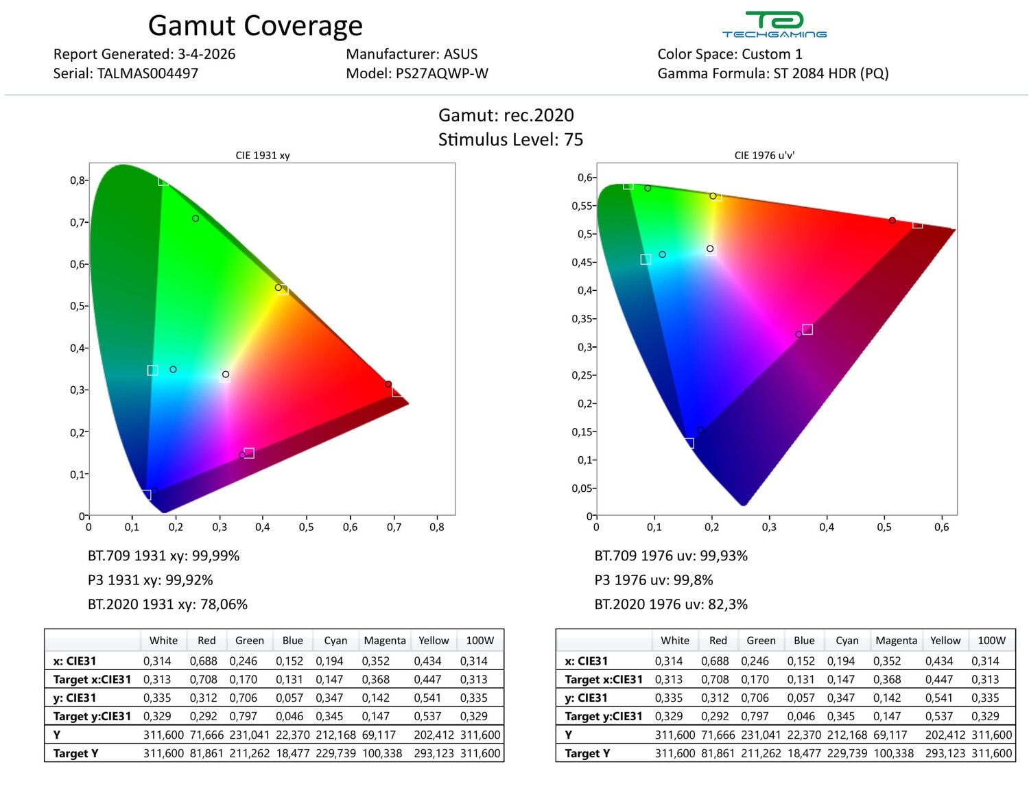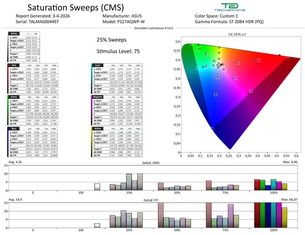 Het gemeten kleurvolume ligt boven de referentiewaarden, wat aangeeft dat het paneel in staat is om kleuren met een hogere intensiteit weer te geven. De CMS-metingen laten zien dat de primaire en secundaire kleuren overwegend dicht bij de doelwaarden liggen, met kleine afwijkingen in positie en saturatie.