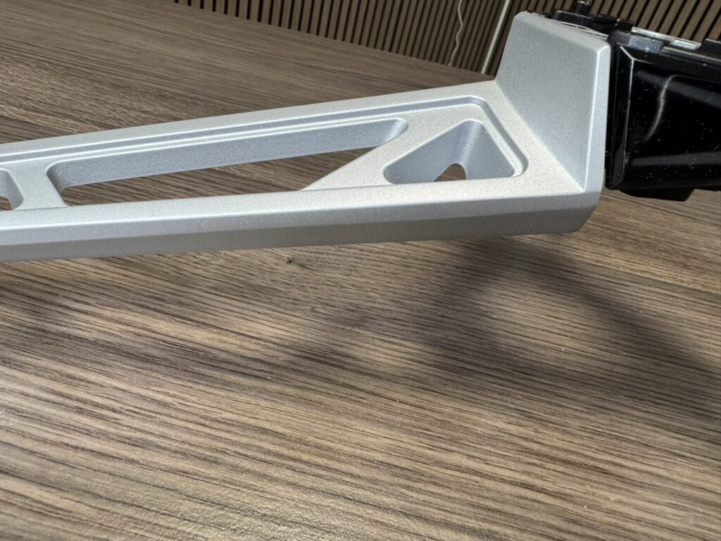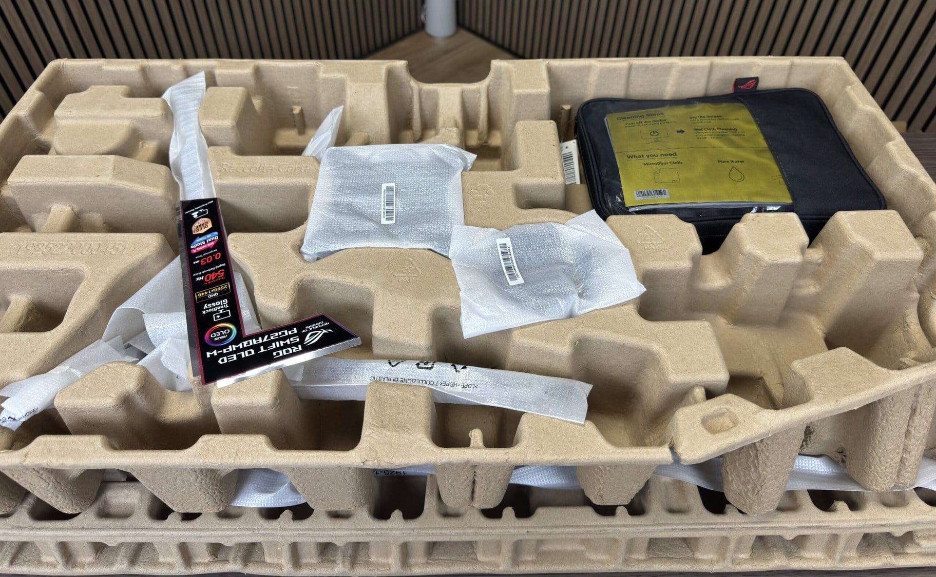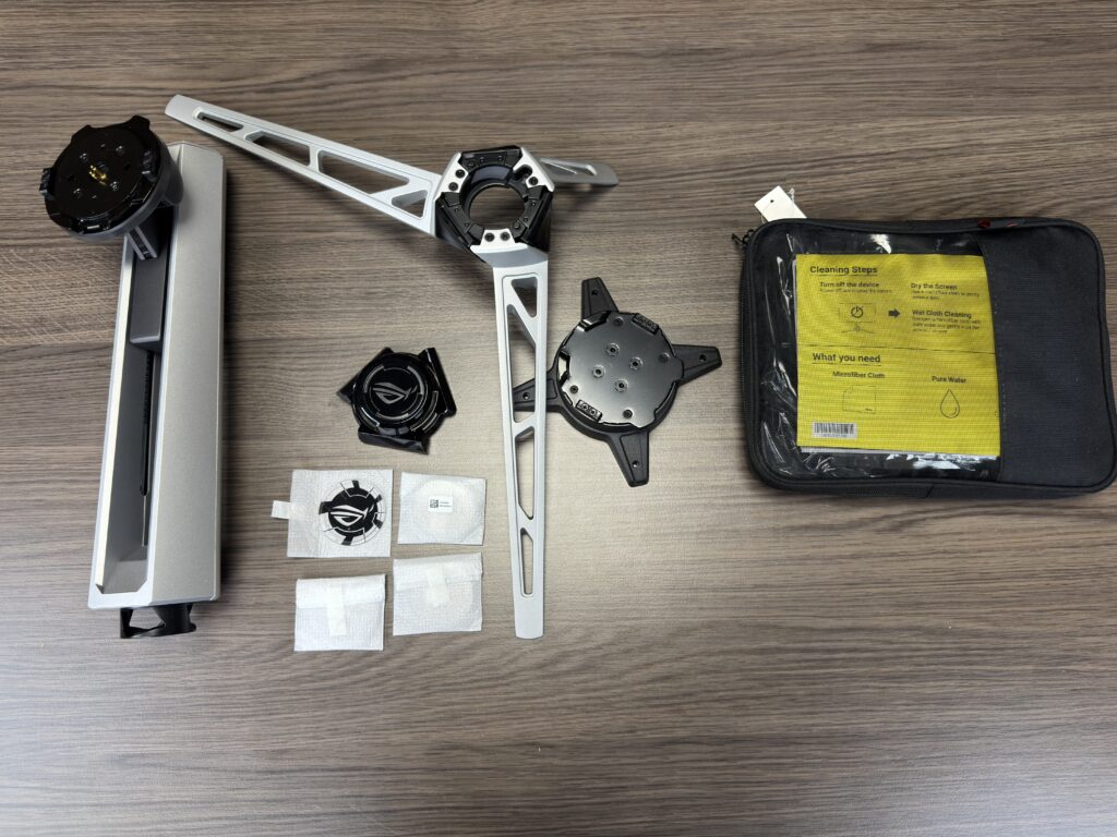 We leggen de monitor even opzij en richten ons op de overige inhoud van de verpakking. Hier zien we de verschillende onderdelen die nodig zijn om de standaard te monteren, waaronder de voet en de arm. Daarnaast vallen de transparante elementen op, die onderaan de standaard bevestigd kunnen worden en zorgen voor de kenmerkende ROG-projectie. Verder zien we een zwart opbergtasje, waarin de bekabeling en documentatie netjes zijn opgeborgen. Op basis van de inhoud lijkt hier onder andere een DisplayPort- en/of HDMI-kabel bijgeleverd te zijn, samen met de benodigde handleidingen en accessoires. Ook is er een schoonmaakdoekje aanwezig, wat een nette toevoeging is bij een OLED-paneel.
