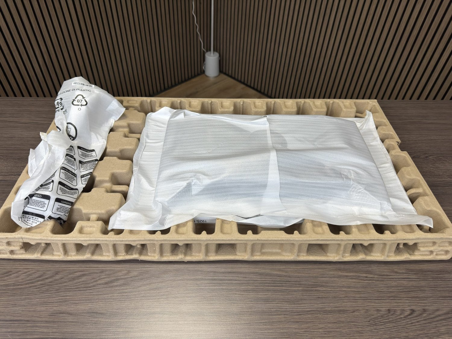 Halen we de inhoud uit de verpakking, dan zien we dat deze is opgebouwd uit twee lagen. Op de bovenste laag bevinden zich de verschillende onderdelen voor de montage van de standaard. Rechtsboven zien we het kenmerkende tasje met daarin de bekabeling en overige accessoires. Onder deze laag bevindt zich het paneel zelf, dat volledig beschermd is met folie en stevig is verpakt in de doos. Links daarvan ligt een extra onderdeel van de standaard, waarmee de montage compleet kan worden gemaakt.