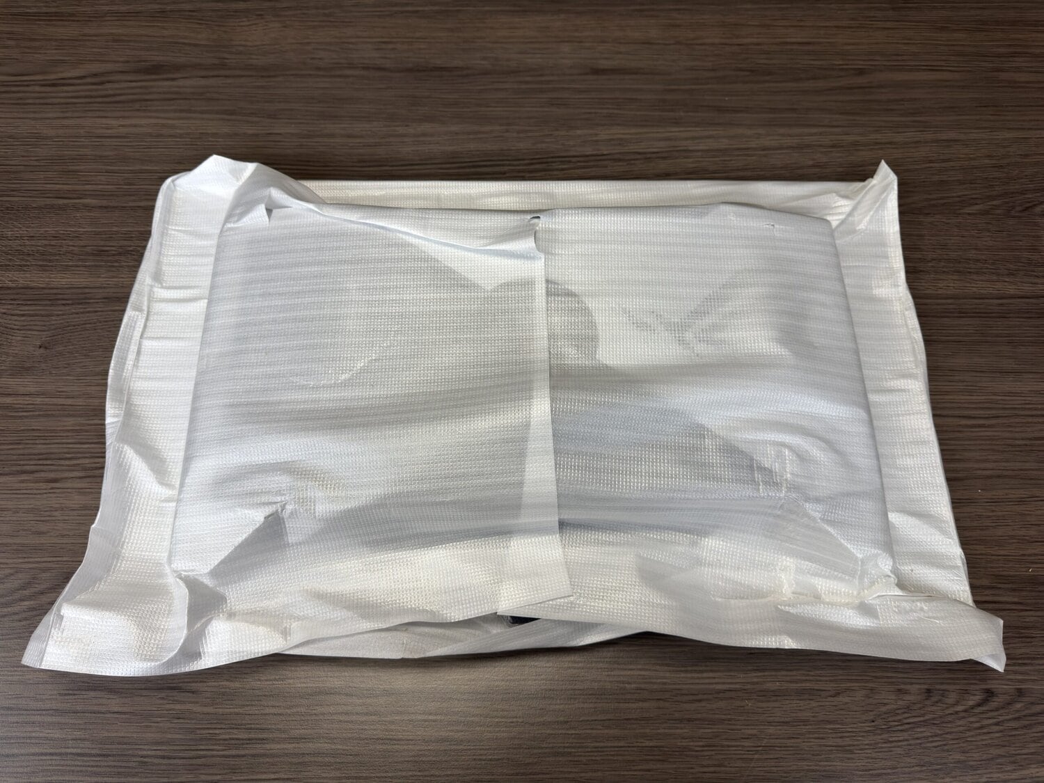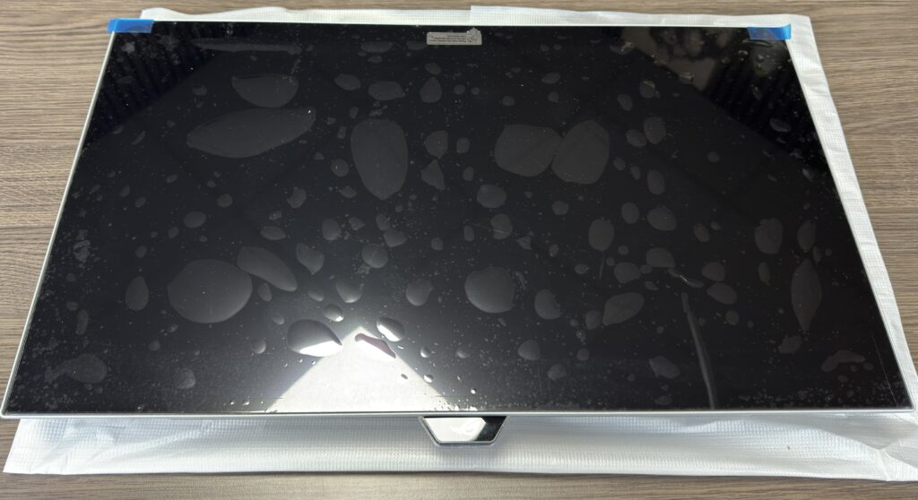 We draaien de monitor voorzichtig om en zien de voorkant van het paneel. Deze is voorzien van een beschermende, antistatische folie om het scherm te beschermen tegen krassen en beschadigingen tijdens transport. Op de foto is goed te zien dat deze folie nog aanwezig is, inclusief de typische vlekkenstructuur die hierbij hoort. Onderaan, in het midden van de display, zien we de voorkant van de navigatieknop terugkomen. Hier is subtiel het ROG-logo verwerkt. Daarnaast valt op dat de schermranden relatief dun zijn, wat bijdraagt aan een moderne en strakke uitstraling.
