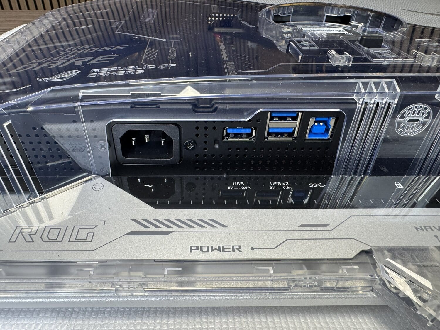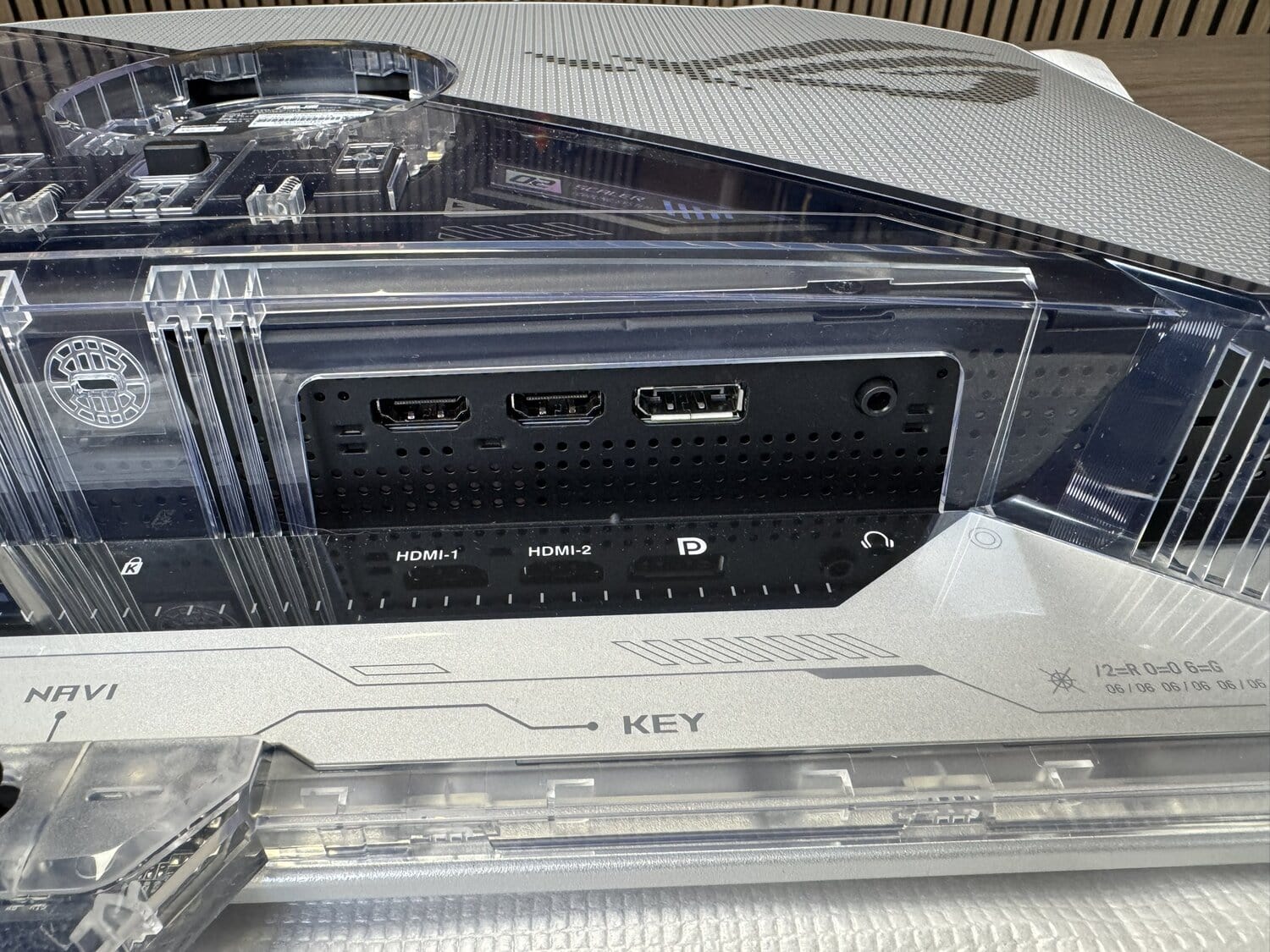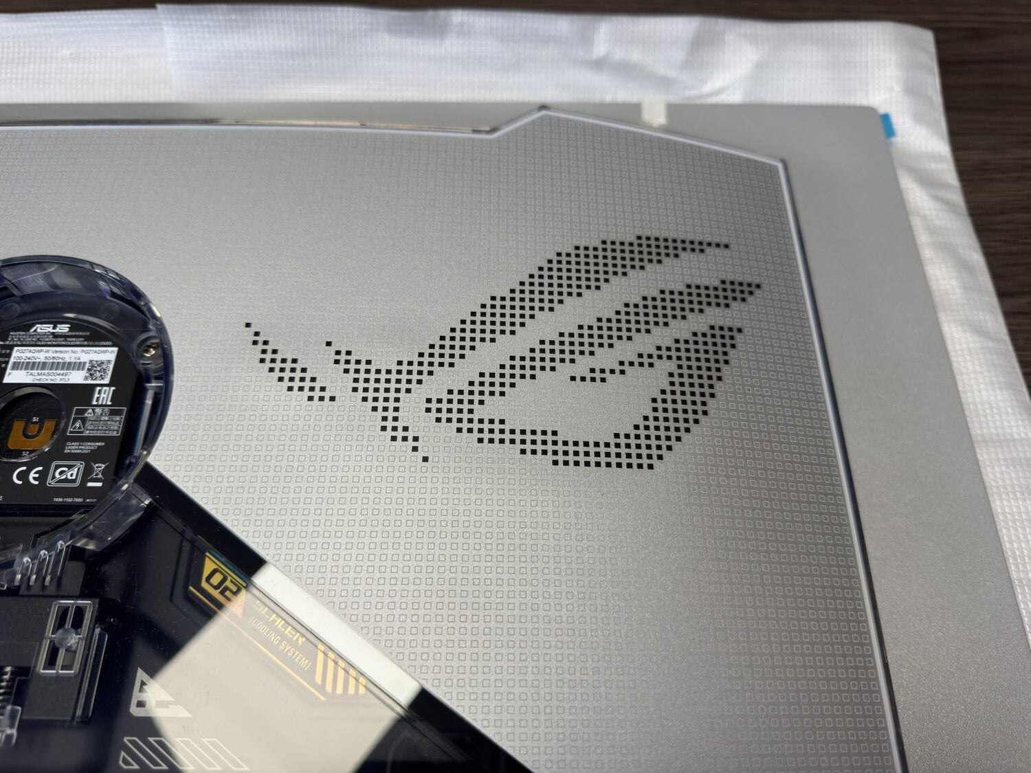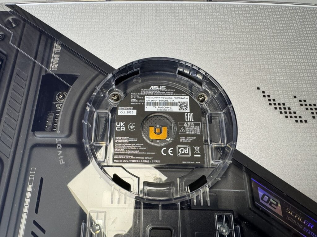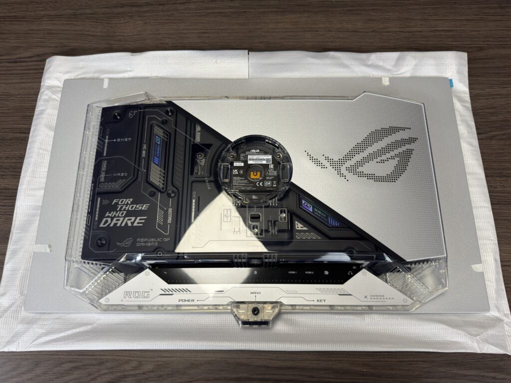 We halen de monitor uit de beschermende folie en leggen deze voorzichtig op de folie zelf. Op de eerste foto zien we een duidelijk totaaloverzicht van de achterkant van de monitor. Wat direct opvalt, is dat de achterkant deels transparant is uitgevoerd, waardoor de interne structuur van de monitor zichtbaar wordt. Rechtsboven zien we het kenmerkende ROG-logo subtiel verwerkt in het ontwerp. Wanneer we verder inzoomen op het ronde middengedeelte van de achterzijde, zien we het bevestigingspunt voor de standaard. Dit centrale punt vormt de basis voor de montage.