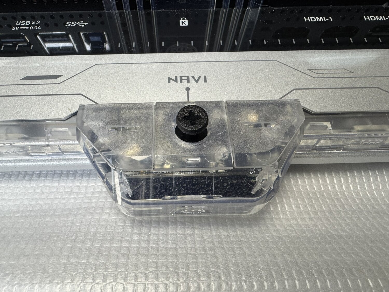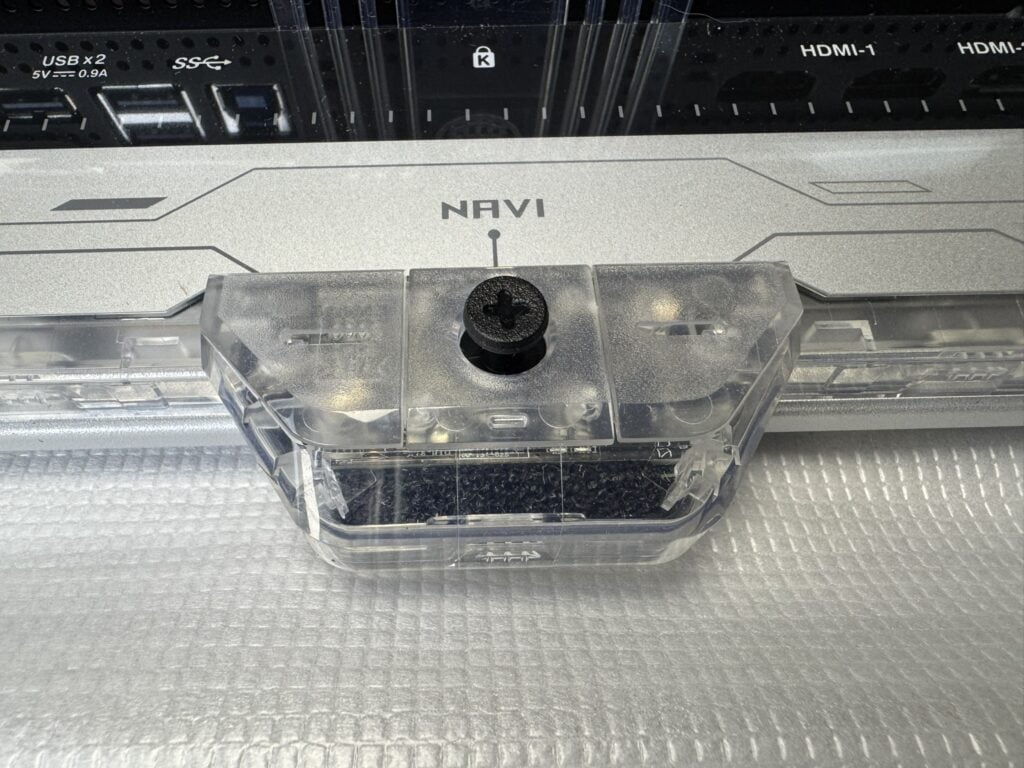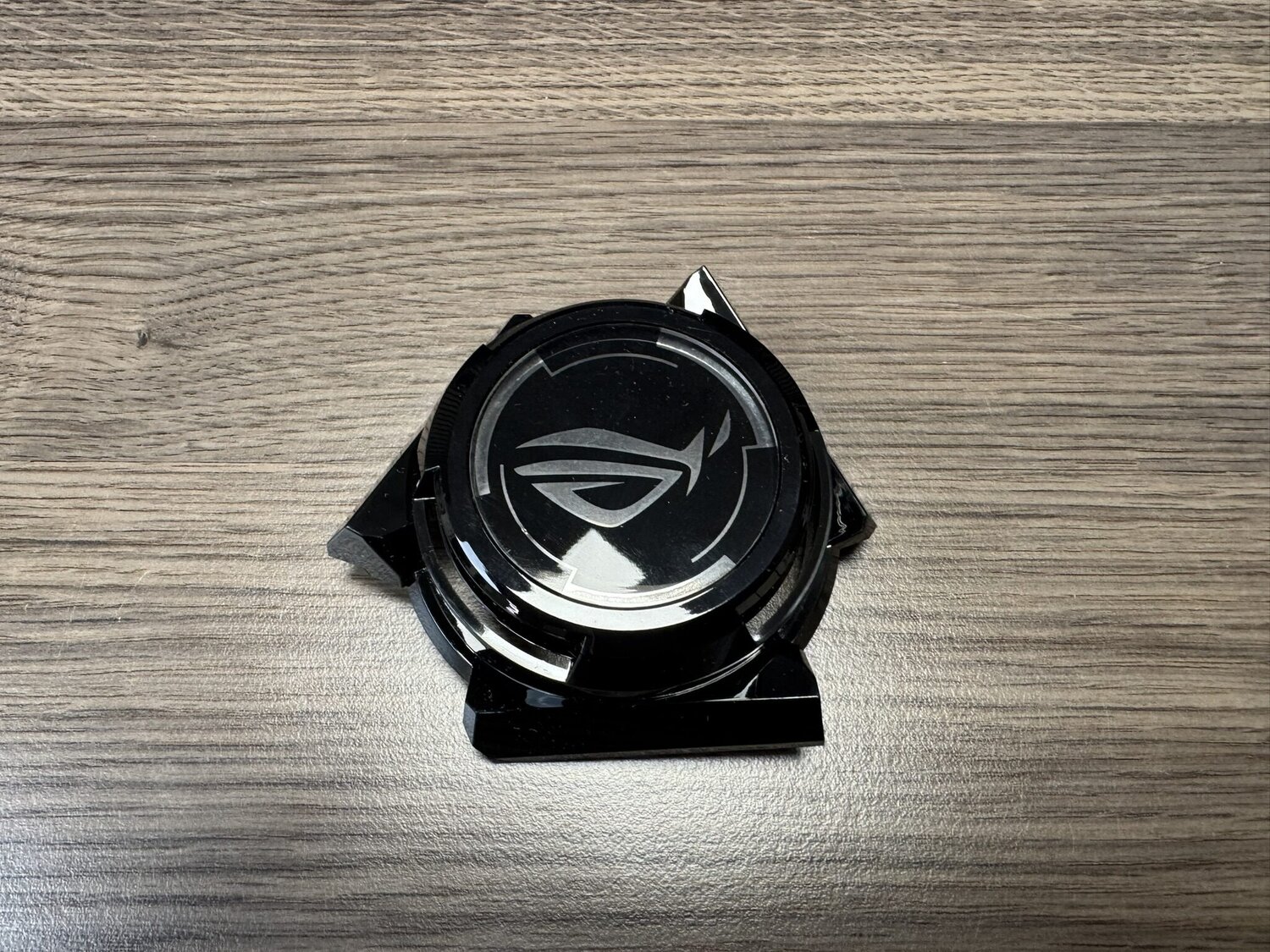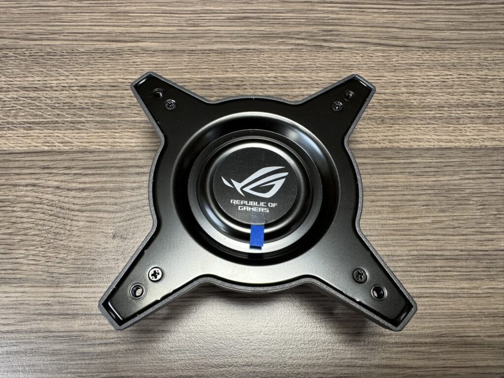 We halen de monitor uit de beschermende folie en leggen deze voorzichtig op de folie zelf. Op de eerste foto zien we een duidelijk totaaloverzicht van de achterkant van de monitor. Wat direct opvalt, is dat de achterkant deels transparant is uitgevoerd, waardoor de interne structuur van de monitor zichtbaar wordt. Rechtsboven zien we het kenmerkende ROG-logo subtiel verwerkt in het ontwerp. Wanneer we verder inzoomen op het ronde middengedeelte van de achterzijde, zien we het bevestigingspunt voor de standaard. Dit centrale punt vormt de basis voor de montage.