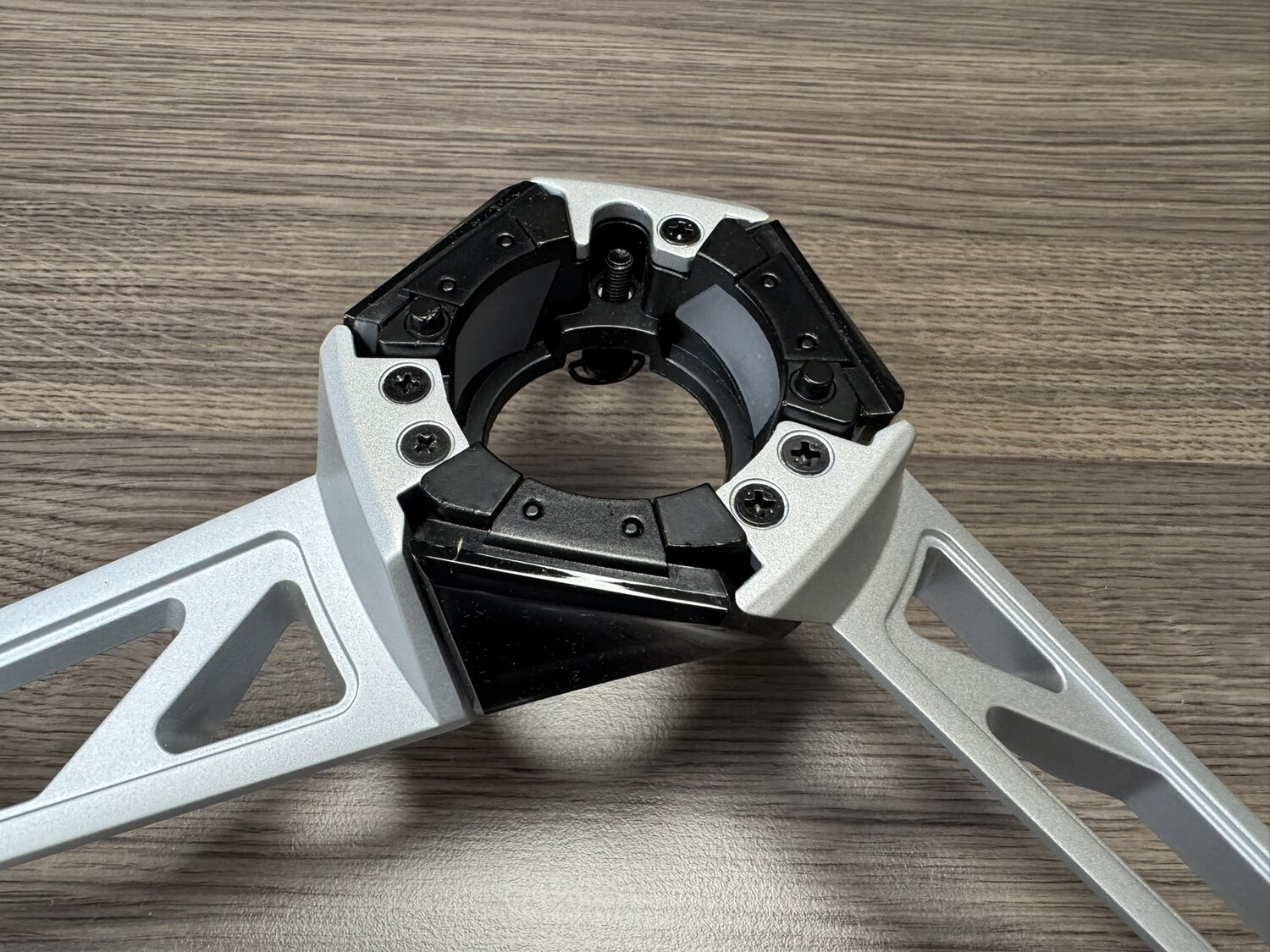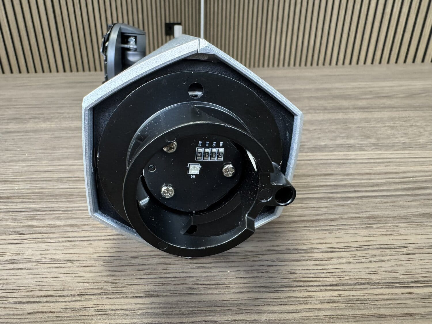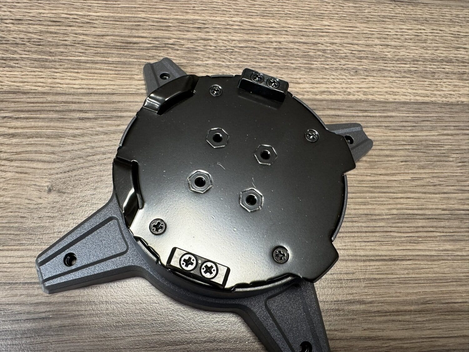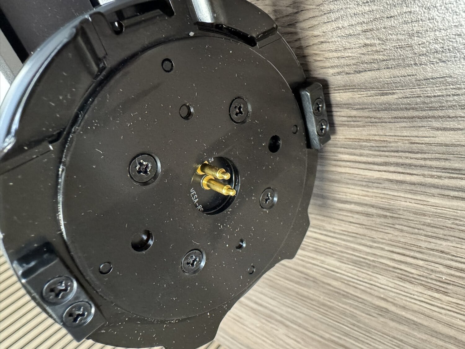 We halen de monitor uit de beschermende folie en leggen deze voorzichtig op de folie zelf. Op de eerste foto zien we een duidelijk totaaloverzicht van de achterkant van de monitor. Wat direct opvalt, is dat de achterkant deels transparant is uitgevoerd, waardoor de interne structuur van de monitor zichtbaar wordt. Rechtsboven zien we het kenmerkende ROG-logo subtiel verwerkt in het ontwerp. Wanneer we verder inzoomen op het ronde middengedeelte van de achterzijde, zien we het bevestigingspunt voor de standaard. Dit centrale punt vormt de basis voor de montage.