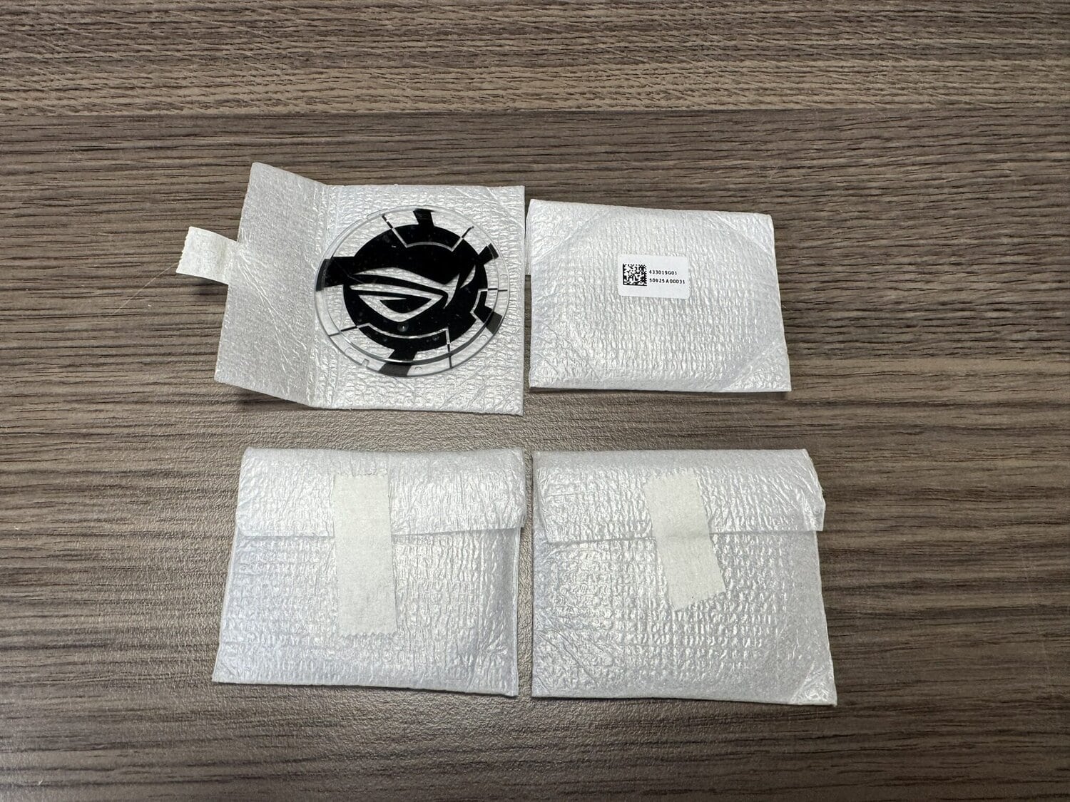 We focussen ons nu op het zwarte opbergtasje en halen de inhoud eruit. Hier treffen we een uitgebreide set aan accessoires. Er zijn meerdere kabels meegeleverd, waaronder een HDMI-kabel, een DisplayPort-kabel en een voedingskabel. Daarnaast zien we diverse documentatie, zoals een handleiding voor het monteren van de standaard en een garantiekaart van ASUS. Er zijn energielabels aanwezig, evenals een stickervel met verschillende ROG-logo’s. Tot slot wordt er een schoonmaakdoekje meegeleverd.