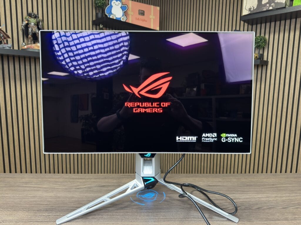 Na het volgen van de stappen van de handleiding van de standaard zien we nu voor het eerst de ASUS ROG - Swift OLED PG27AQWP-W in volle glorie schitteren.