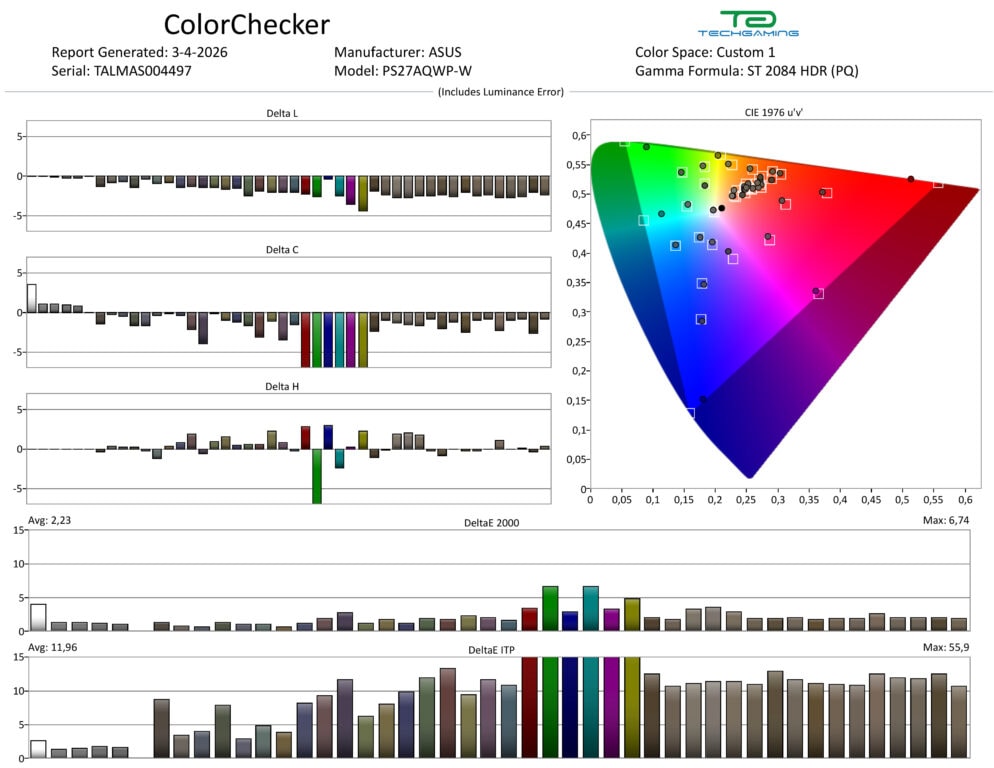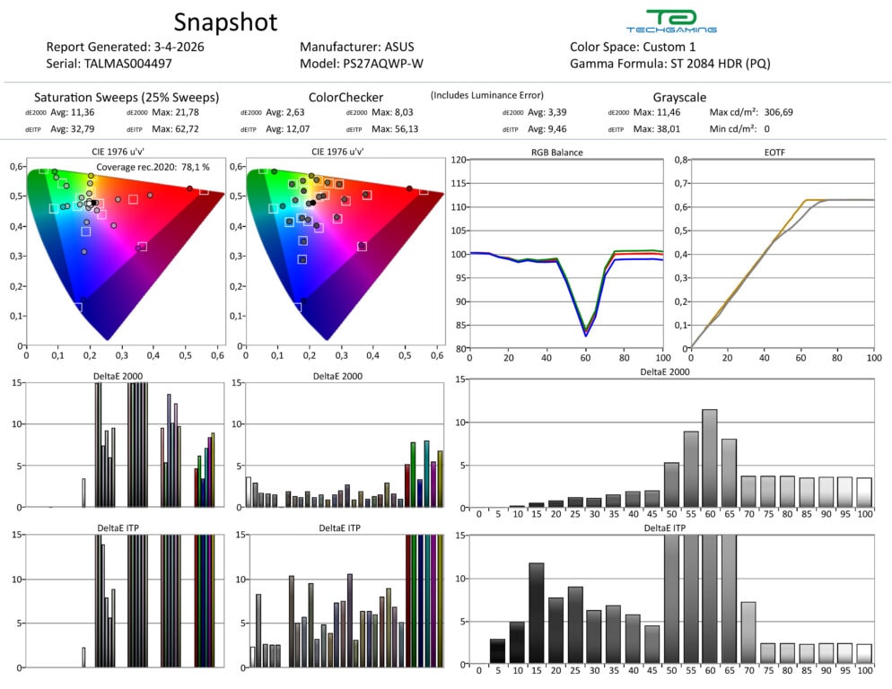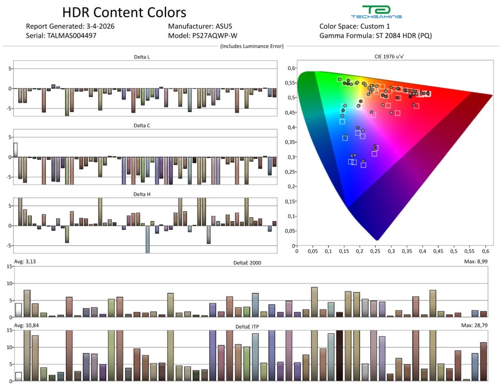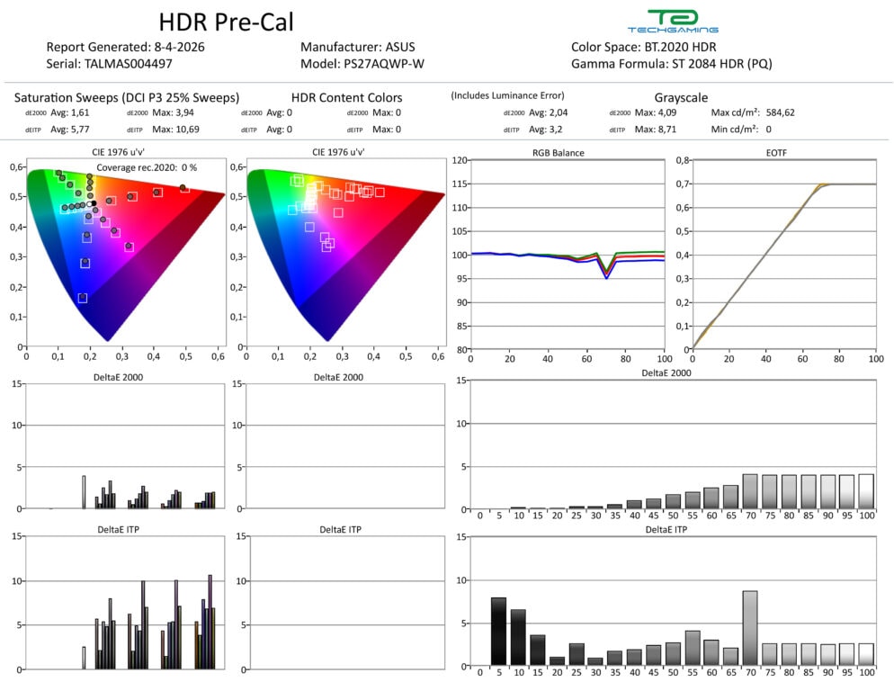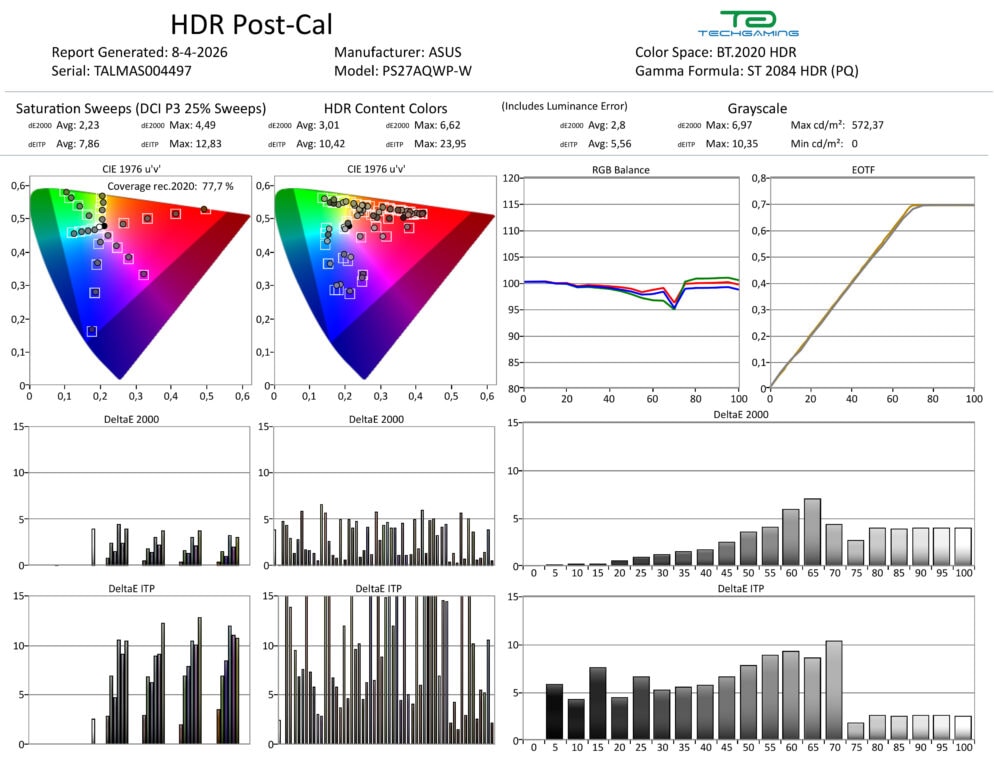 De HDR-kalibratie laat zien dat de monitor in de praktijk beperkt beïnvloedbaar is. Hoewel het kleurbereik na kalibratie correcter wordt weergegeven, nemen de meetbare afwijkingen in kleur en grayscale juist toe. De helderheid en EOTF blijven vrijwel onveranderd. Dit geeft aan dat deze parameters worden bepaald door de interne HDR-verwerking van het paneel.