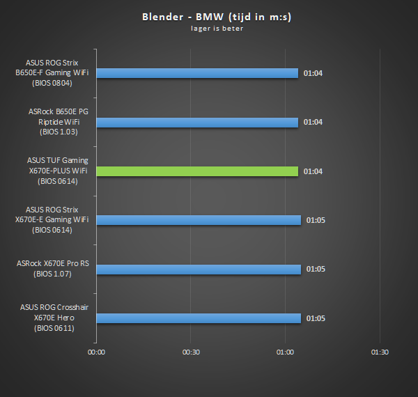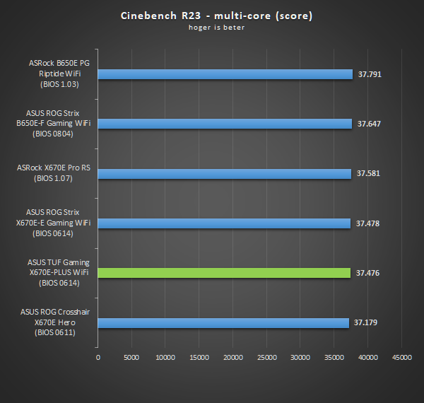 Hieronder zijn resultaten te vinden van de ASUS TUF Gaming X670E-Plus WiFi i.c.m. de AMD Ryzen 9 7950X. Het doel is om in dit hoofdstuk een algemene indruk van prestaties te geven. Prestatieverschillen tussen moederborden zijn veelal marginaal en niet te herleiden in de praktijk, kortom: het verschil is niet significant. Belangrijker gespreksonderwerp bij moederborden zijn zaken zoals de prijs, features en algemene kenmerken.
