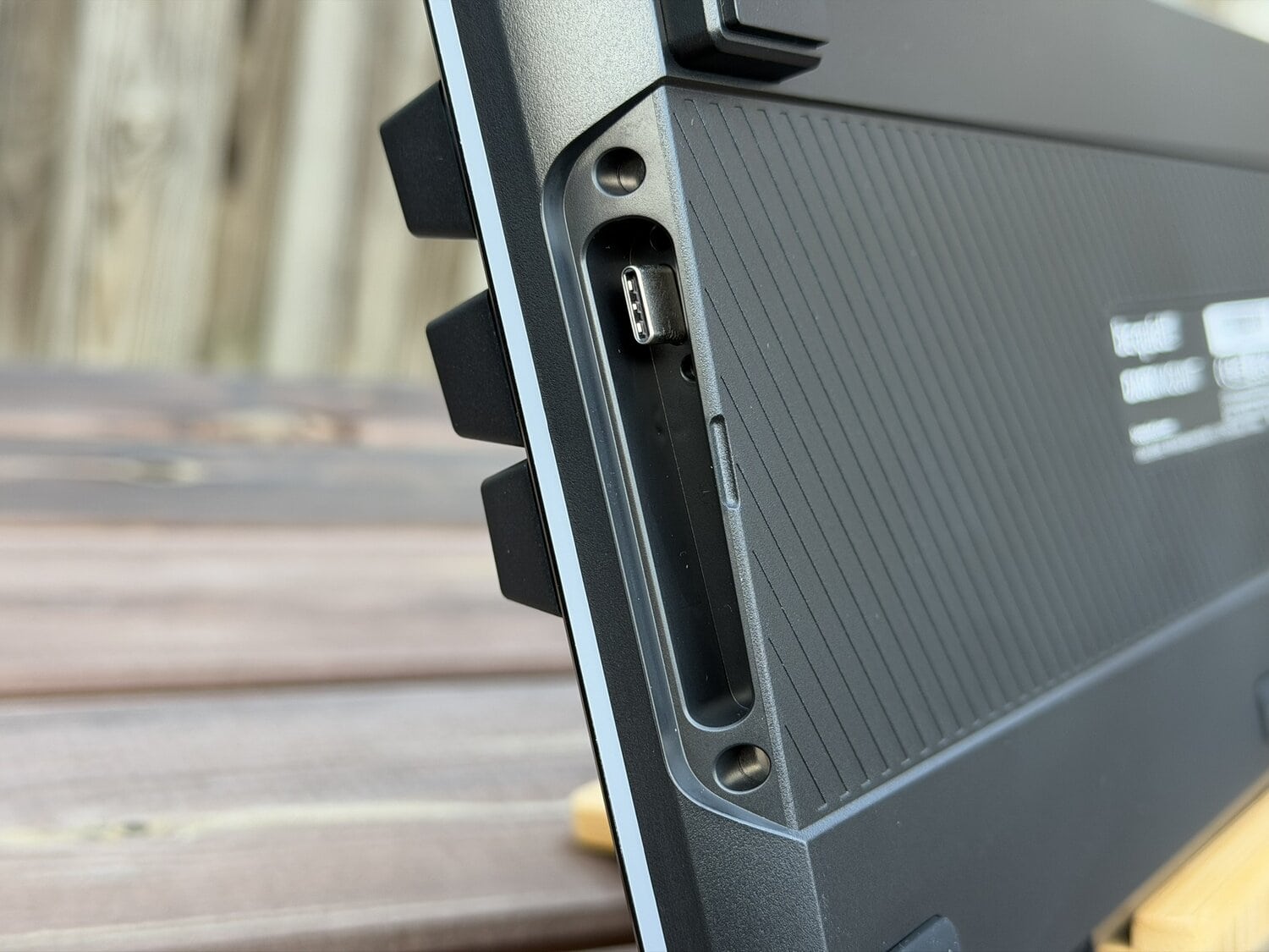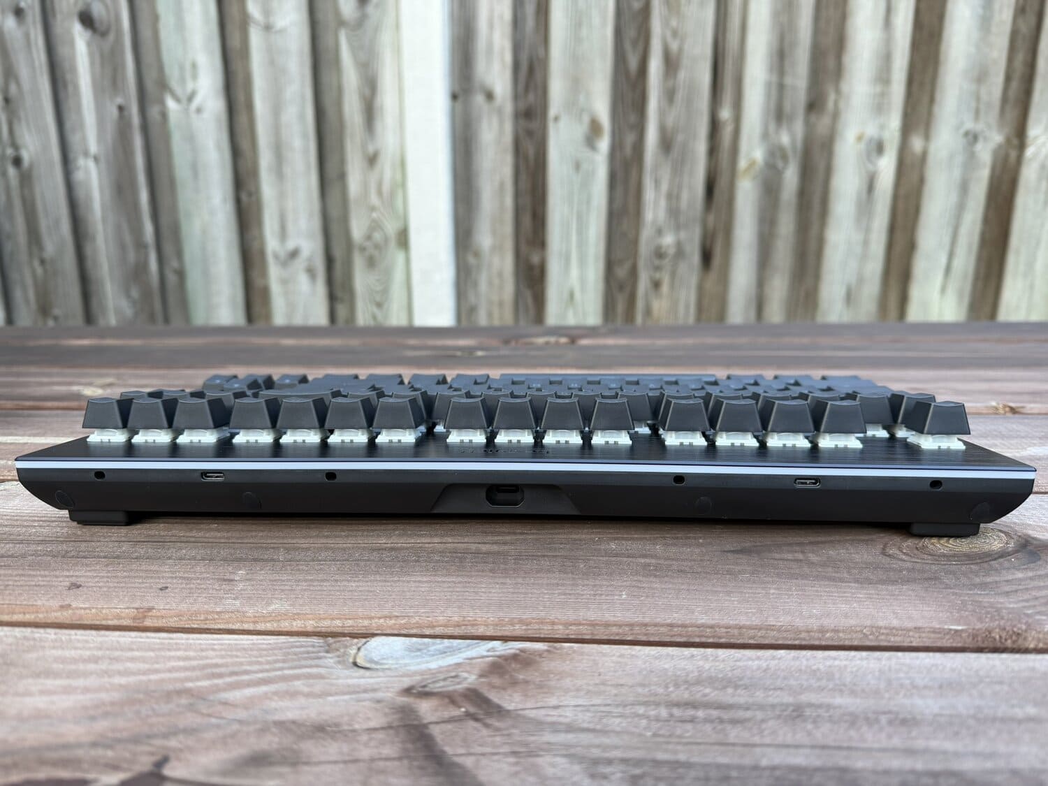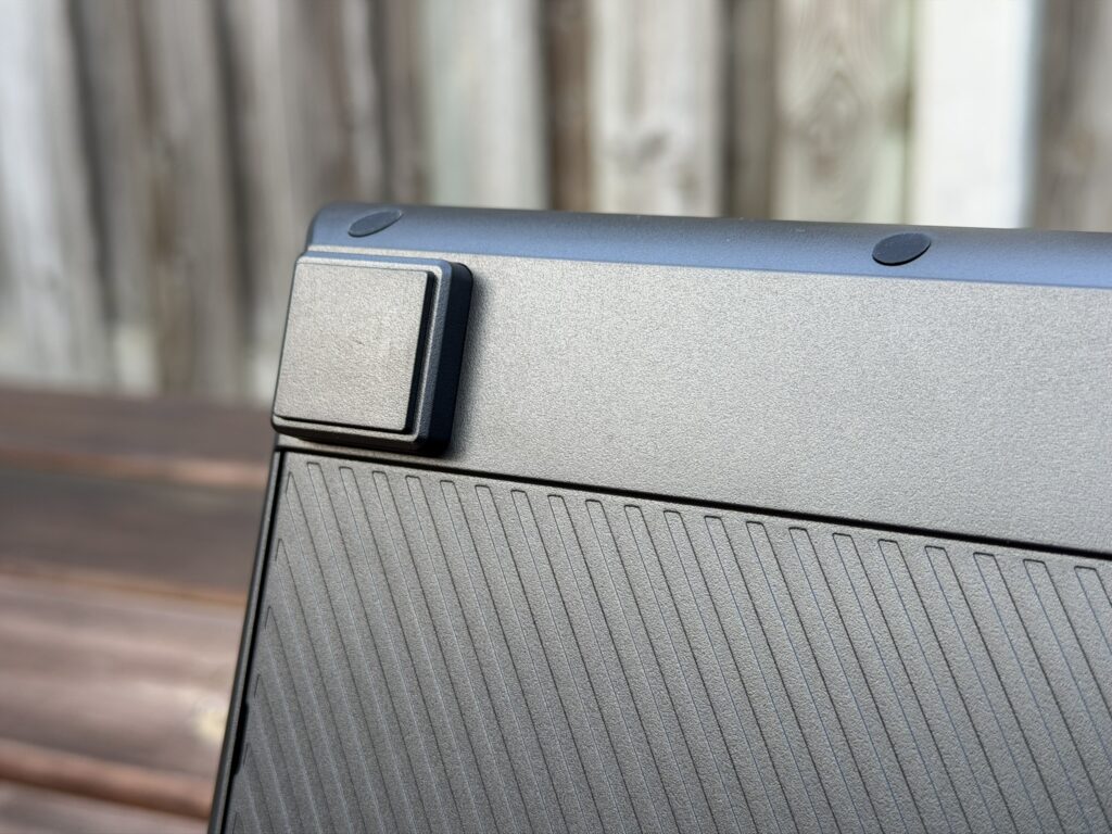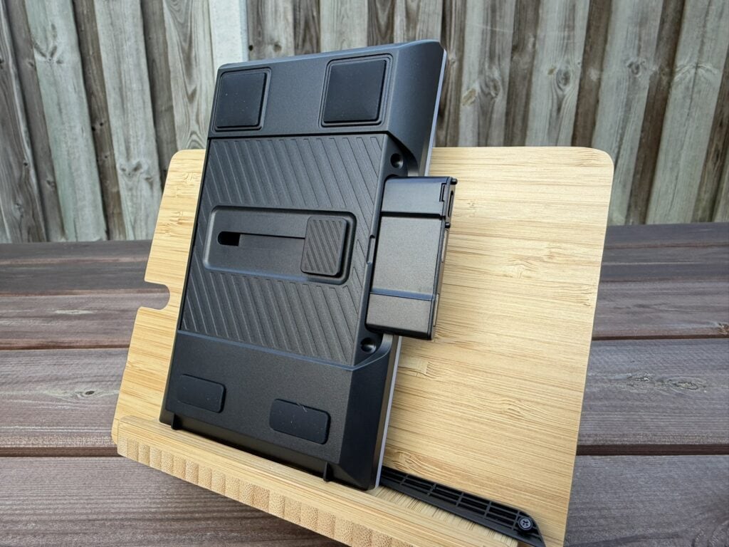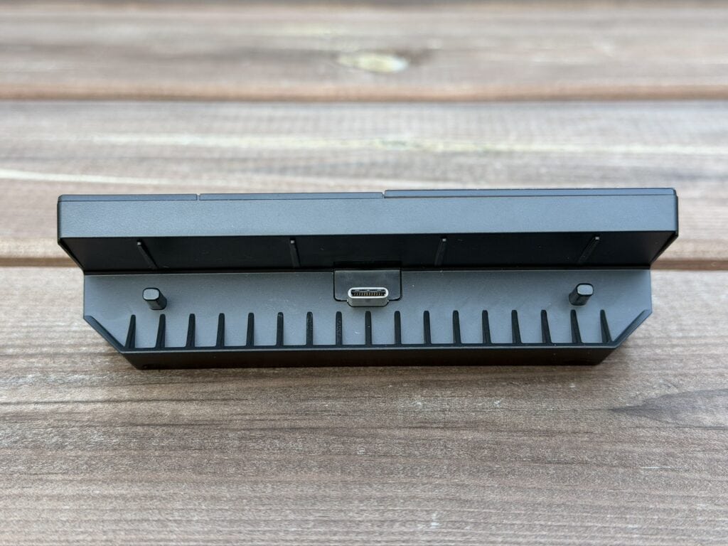 Op de lange zijde achterop zien we natuurlijk de USB-C-poort zitten die we verbinden met de computer, maar ook de twee USB-C-poorten die gebruikt kunnen worden voor de Mediadock. Onderop zien we ook verschillende rubbers zitten om het toetsenbord op zijn plek te houden, waaronder twee grotere vierkante rubbers in de hoeken waar je dus de pootjes op kunt klikken, zoals je op de foto kan zien.