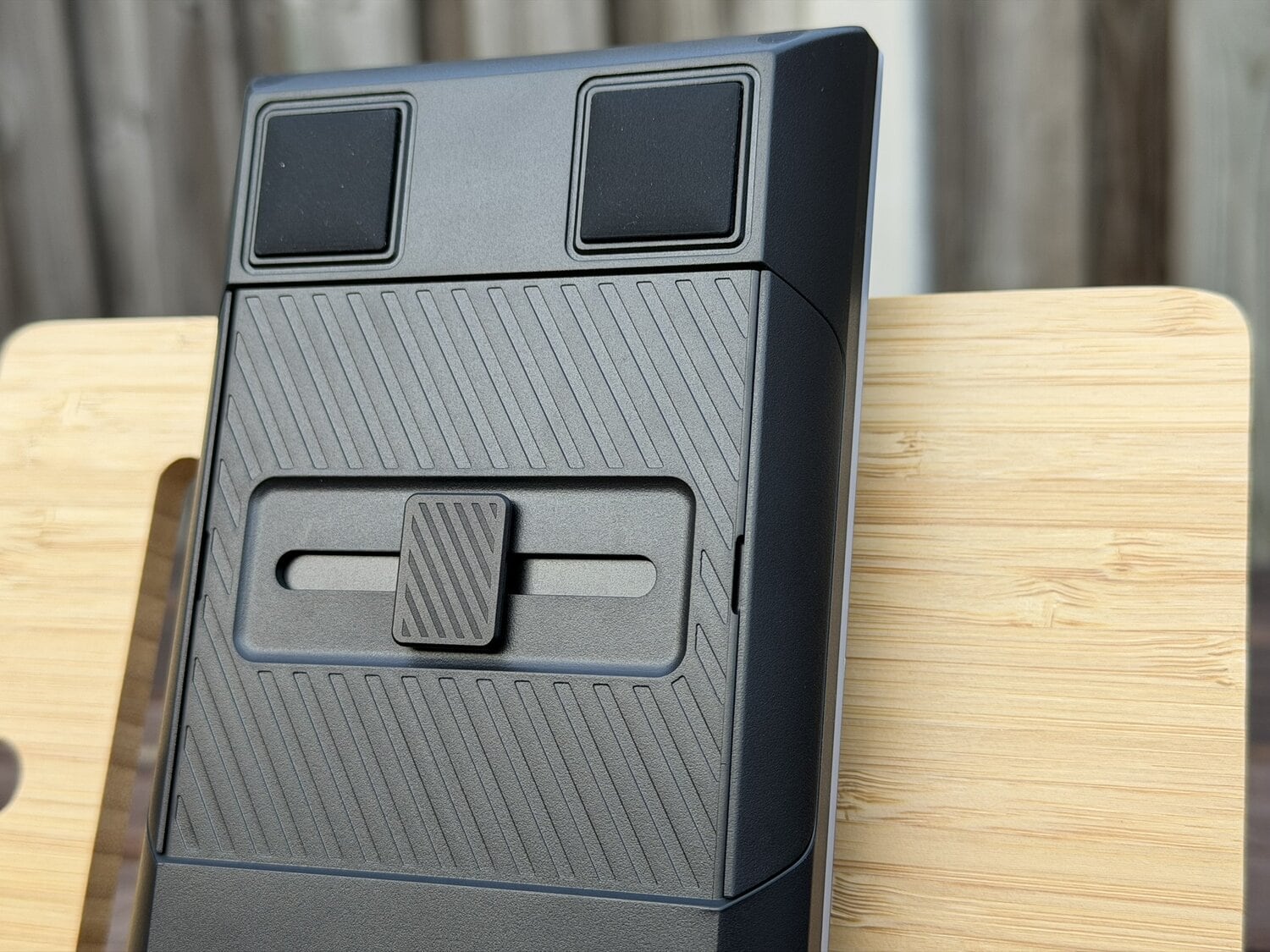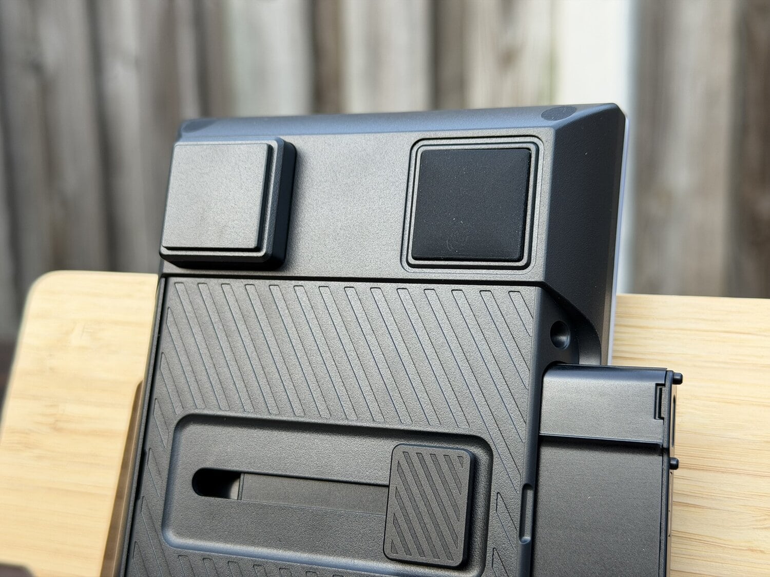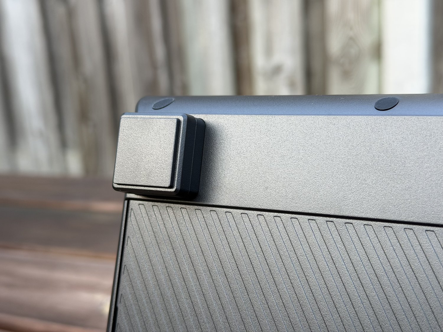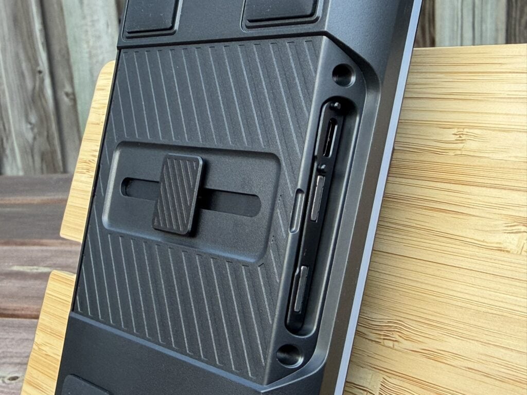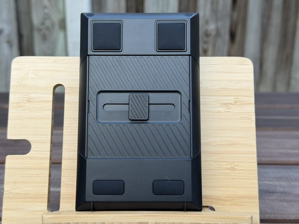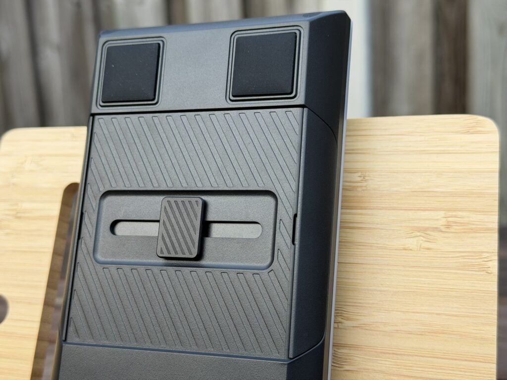 Onderop het numerieke gedeelte zien we dezelfde magnetische pootjes zitten, zodat je deze ook makkelijk kunt verhogen, maar we zien ook een groot schuifpaneel zitten dat zowel naar links als naar rechts geschoven kan worden. Aan de zijkant zien we ook weer de magnetische panelen zitten die je los kunt halen, zodat je een verbindingspaneel links of rechts eruit kan laten schuiven. De bedoeling is uiteraard om dit verbindingspaneel op het toetsenbord te klikken, zodat je een full-size keyboard krijgt.