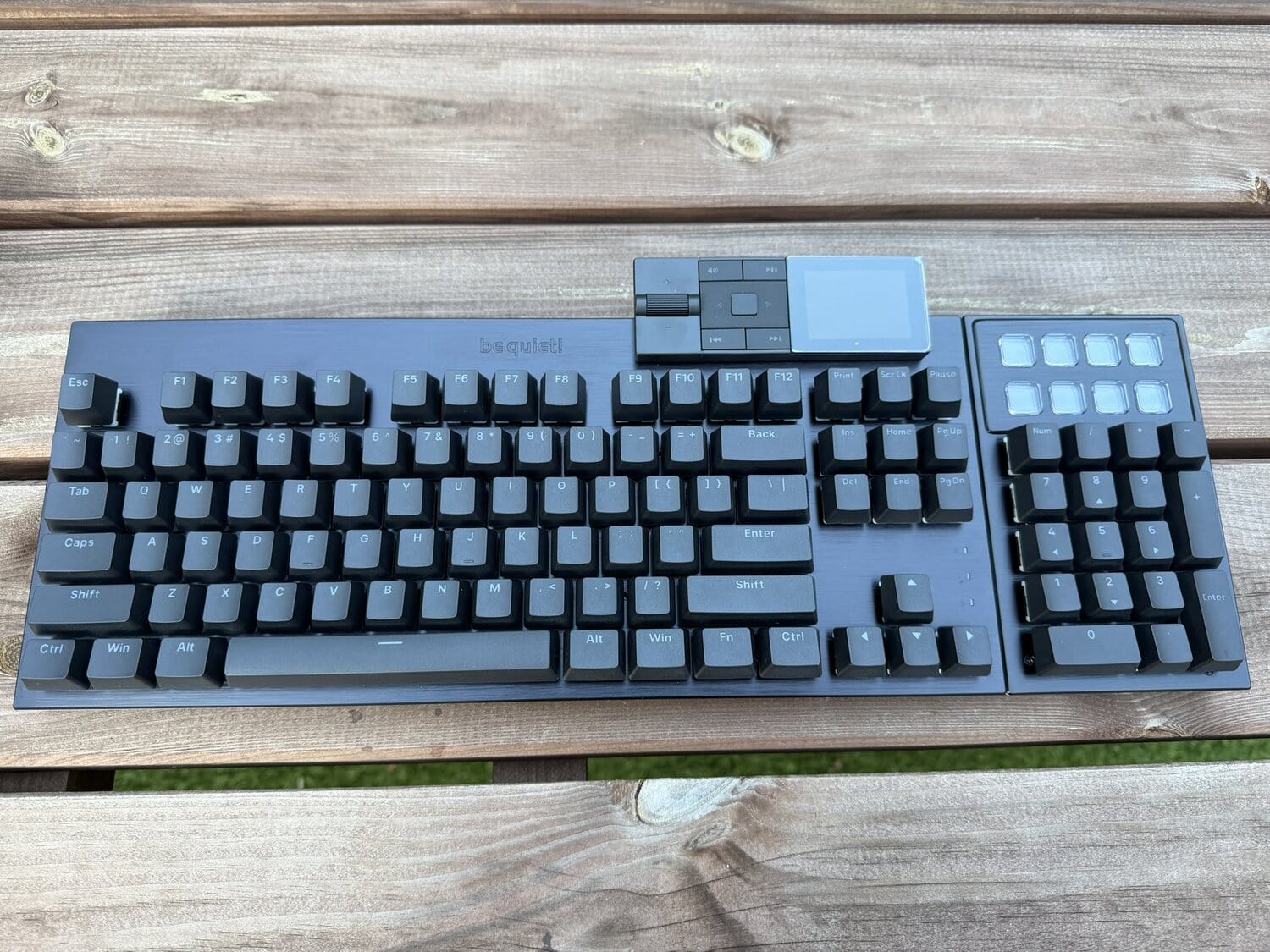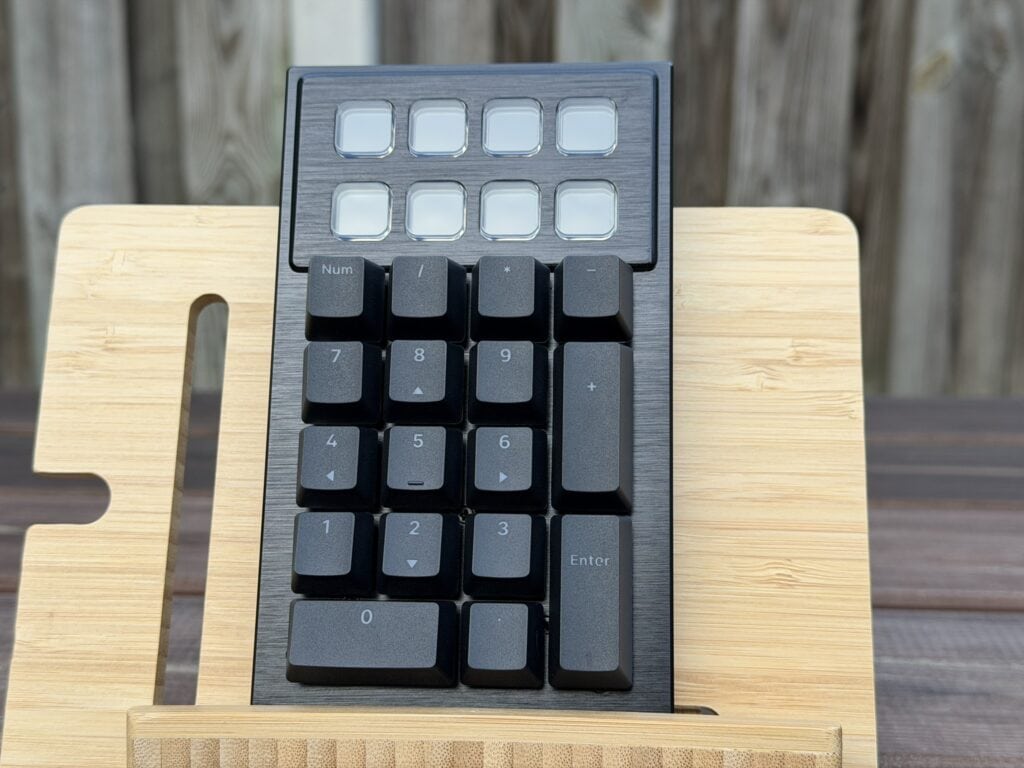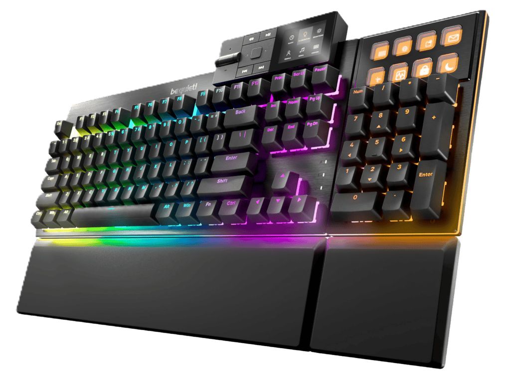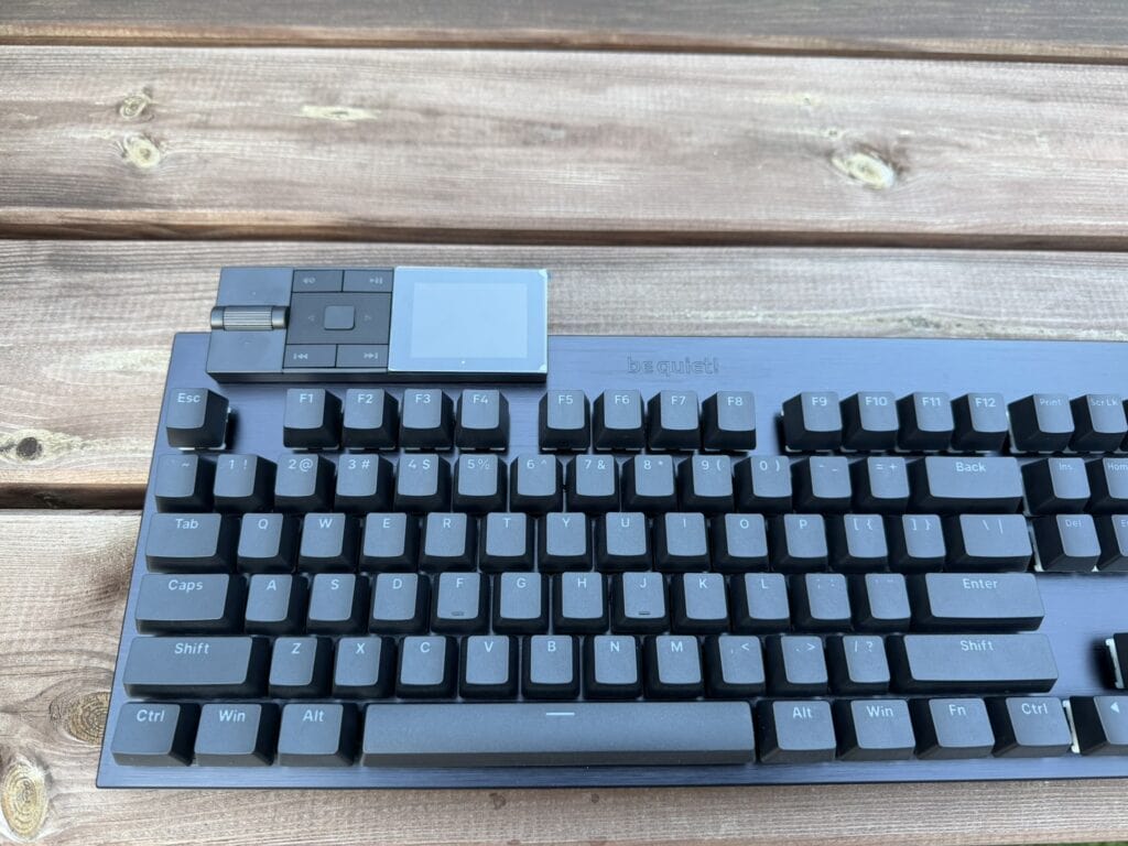 Het numerieke gedeelte zelf is van dezelfde bouwkwaliteit en hetzelfde materiaal als het toetsenbord zelf, maar qua uiterlijk zitten er natuurlijk wel wat verschillen. Om te beginnen zitten bovenop in totaal acht functietoetsen met een (IPS) scherm van 140×140 pixels die je met de software volledig kunt instellen. Dit werkt eigenlijk hetzelfde als een Stream Deck en daarmee is be quiet! zelfs eerder dan Corsair zelf, die onlangs een toetsenbord met ingebouwde Stream Deck hebben aangekondigd.