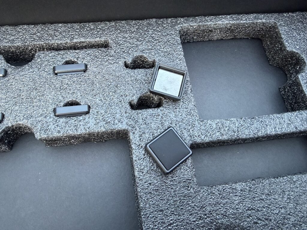 Gelukkig zitten er in totaal drie lagen aan beschermschuim in de verpakking, want zodra we het toetsenbord en de eerste schuimlaag (inclusief handleiding) hebben weggehaald, zien we verschillende losse elementen van het toetsenbord zitten.