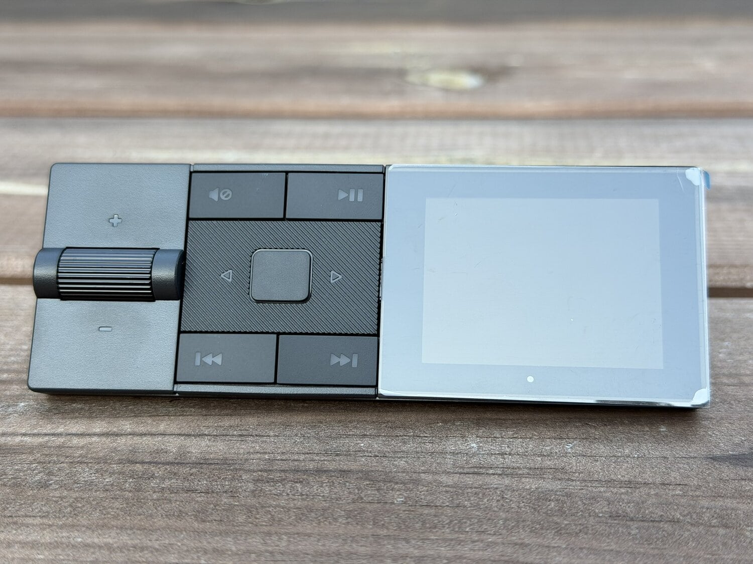 Naast het display zitten ook verschillende knoppen, namelijk play/pauze, skip forward en skip backward, mute-knop en een draaiknop om het volume in te stellen. In het midden zitten knoppen om het display mee te bedienen, zodat je snel door de verschillende functies heen kunt bladeren.