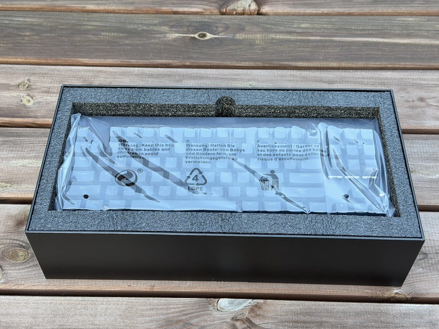 Zodra we de doos openmaken, zien we waarom de doos dus relatief smal is, want we zien een behoorlijk klein toetsenbord verpakt in op maat gesneden beschermschuim. Op het eerste gezicht dachten we dat we te maken hadden met een TKL-toetsenbord.