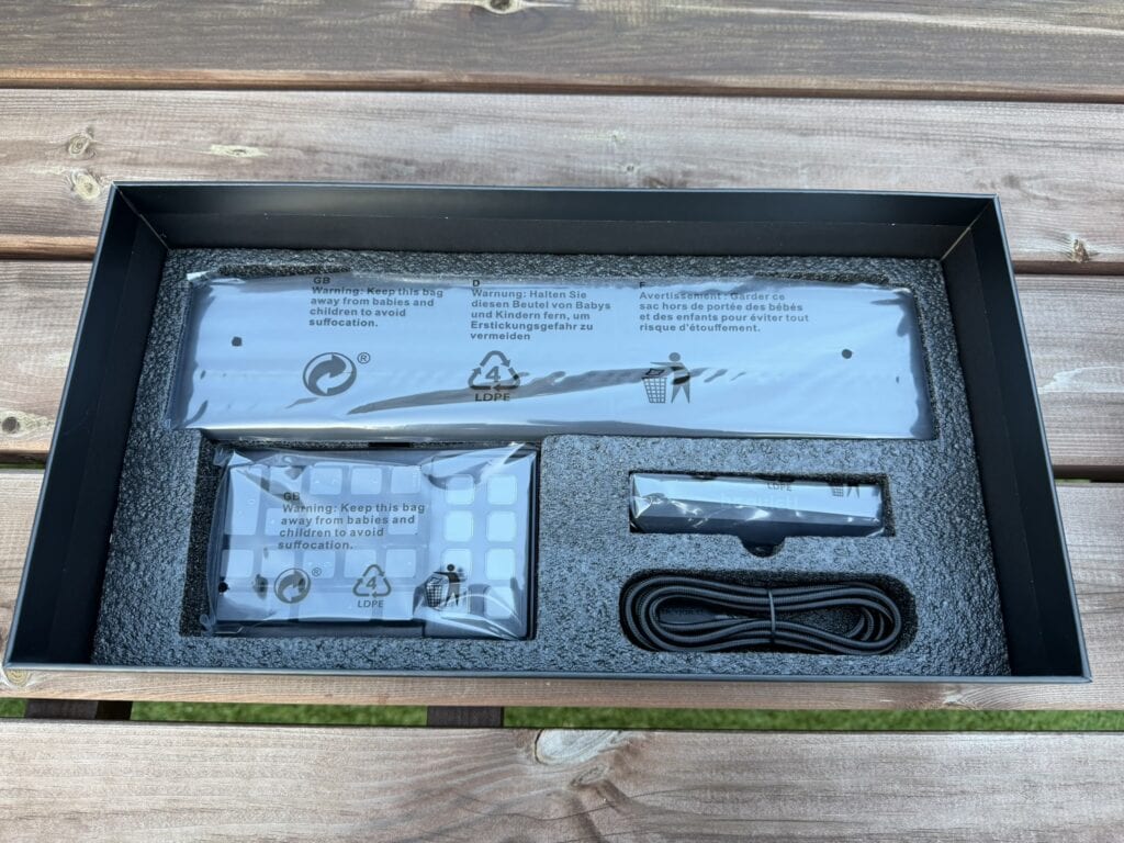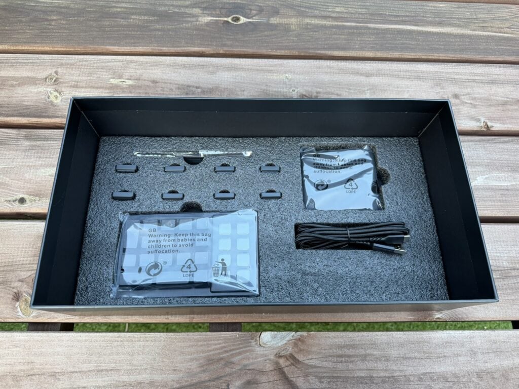 We zien een magnetische polshouder, een los numeriek gedeelte, het beeldscherm, een mooie gevlochten USB-kabel en een achttal kleine vierkante blokjes. Wat we met die losse blokjes moeten/kunnen doen, komen we straks op terug, maar bijzonder zijn ze wel!