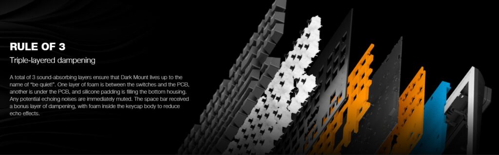 Behalve de toetsen zelf heeft be quiet! onder de toetsen zelf in totaal drie lagen aan dempingsmateriaal aangebracht. In totaal zijn twee lagen van schuimmateriaal aangebracht en zijn de ruimtes in de behuizing opgevuld met siliconen vulling om de Dark Mount een van de stilste toetsenborden op de markt te maken. Of dit daadwerkelijk ook gelukt is, gaan we verder op in tijdens de praktijkervaring, maar feit is wel dat we tot dusver nog nooit zo’n aanpak zijn tegengekomen.
