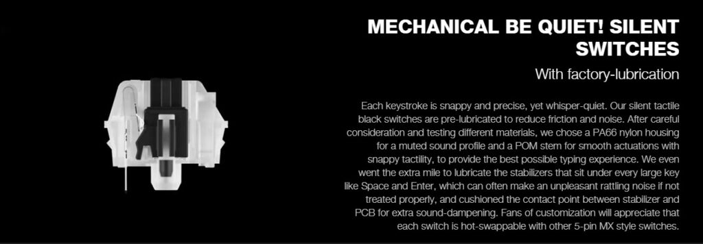 De tactile variant wordt geleverd met zwarte switches die vooraf gesmeerd zijn om zo min mogelijk frictie en geluid te produceren. Ook de stabilisatoren onderin elke toets zijn gesmeerd, terwijl de behuizing van elke toets is gemaakt van een geluidsarm materiaal, namelijk PA66 nylon.