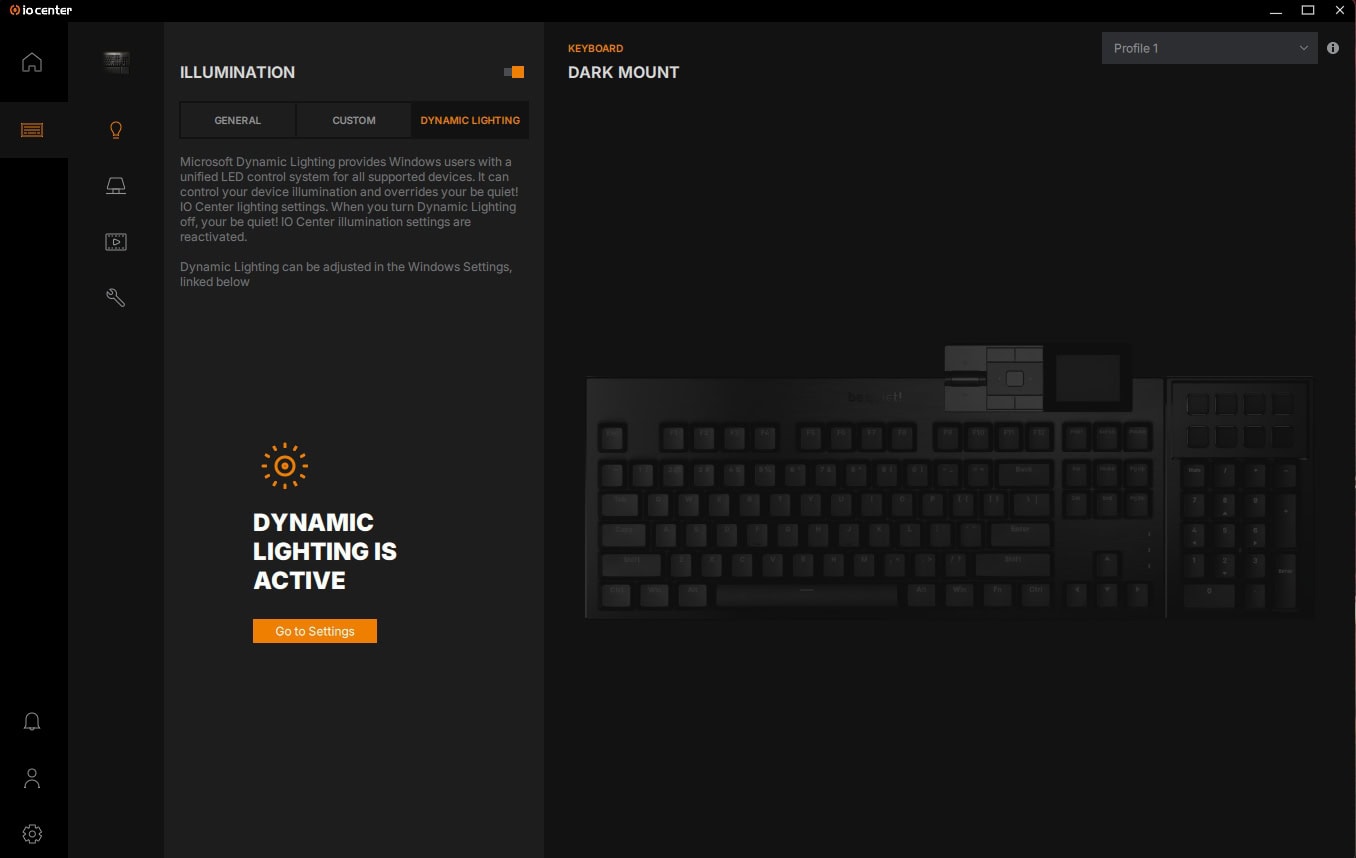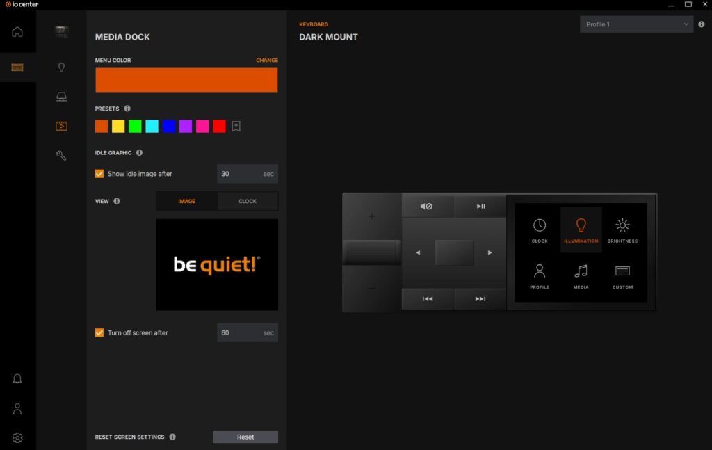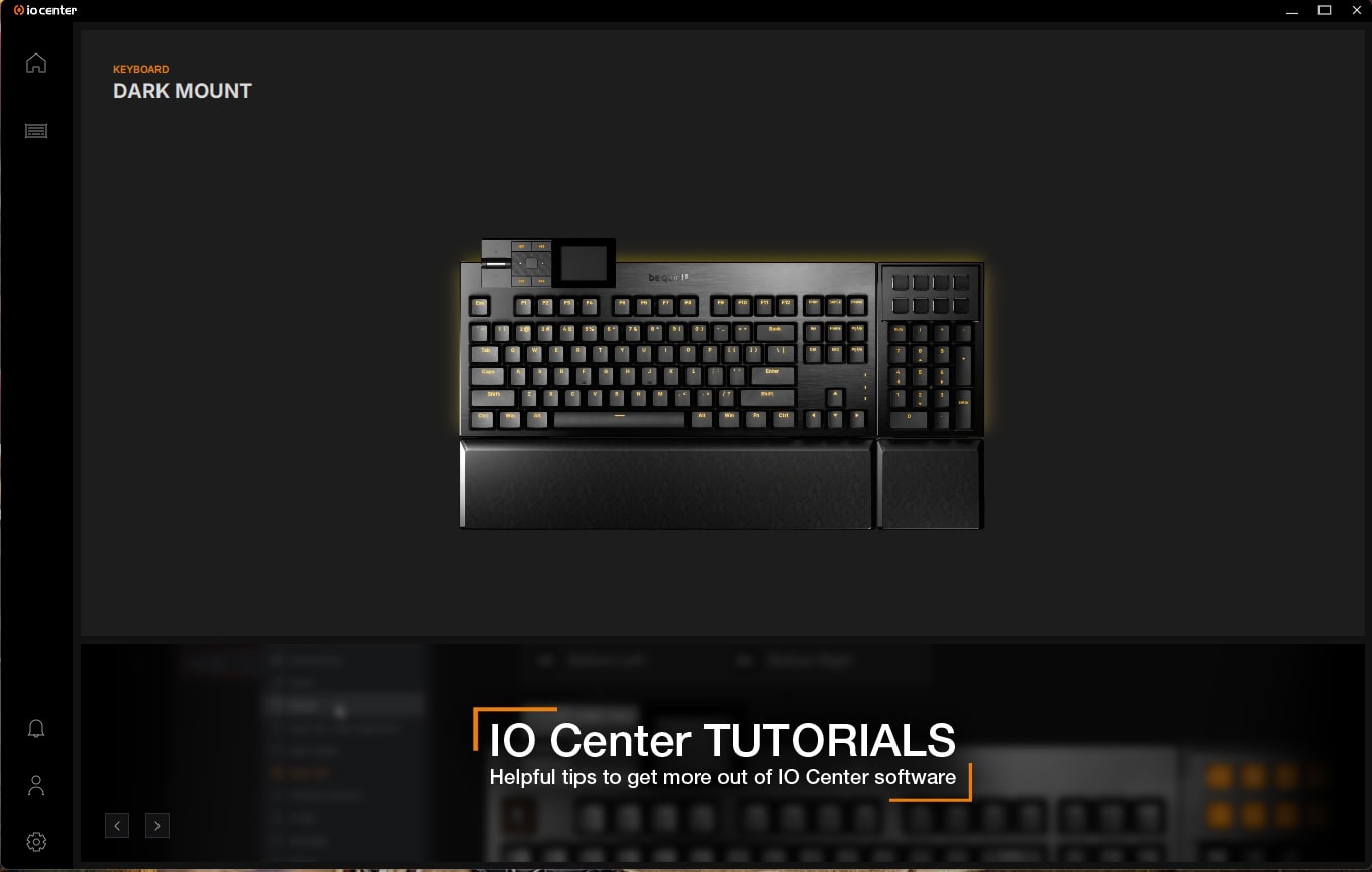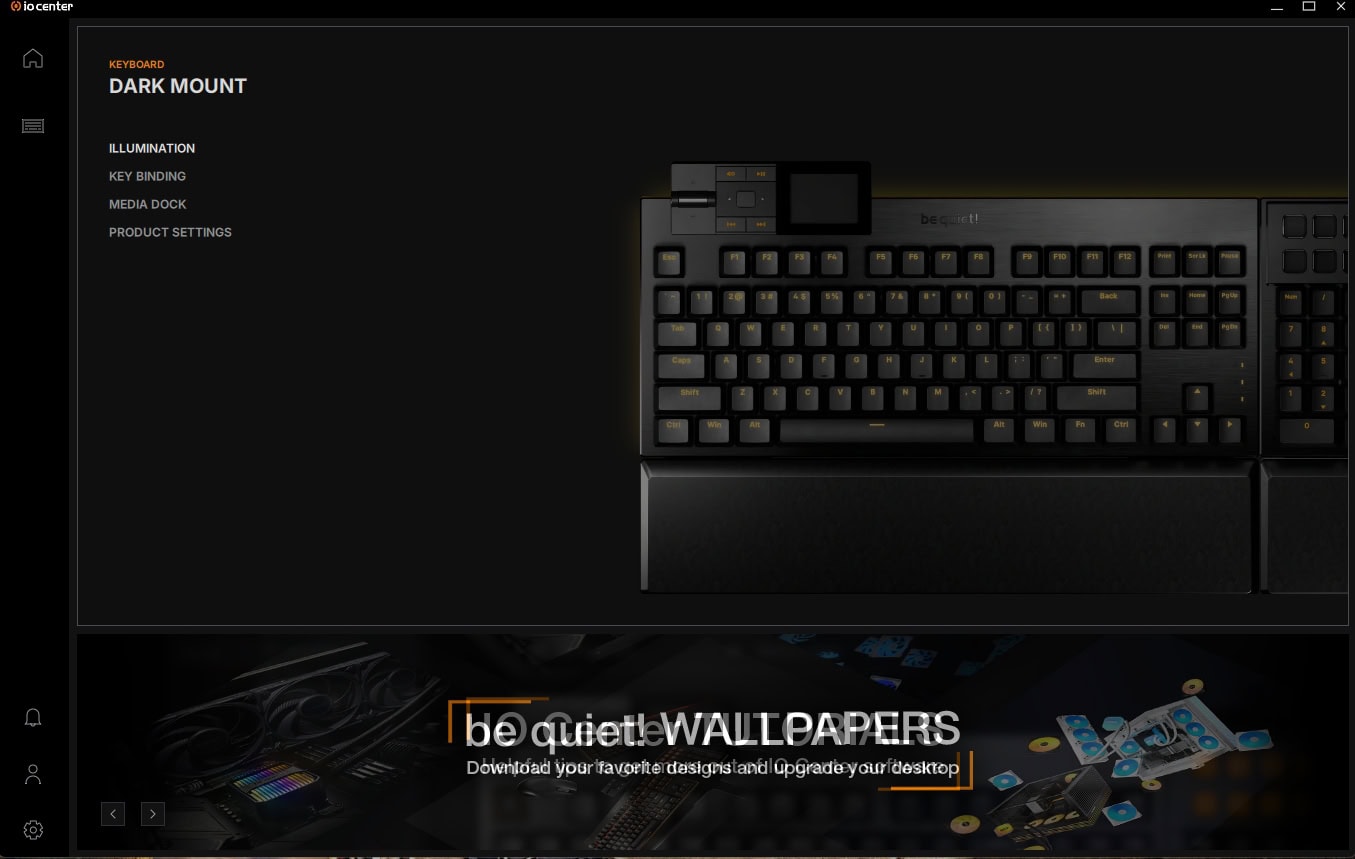 Om de Dark Mount in te stellen, kan je gebruikmaken van de be quiet! IO Center-software, die zowel als desktopsoftware te downloaden is als online via een webpagina bereikbaar is. De online versie is daarbij wel beperkter in zijn functionaliteiten en kan je onder andere geen updates zoeken en installeren voor de be quiet! randapparatuur zoals de Dark Mount.