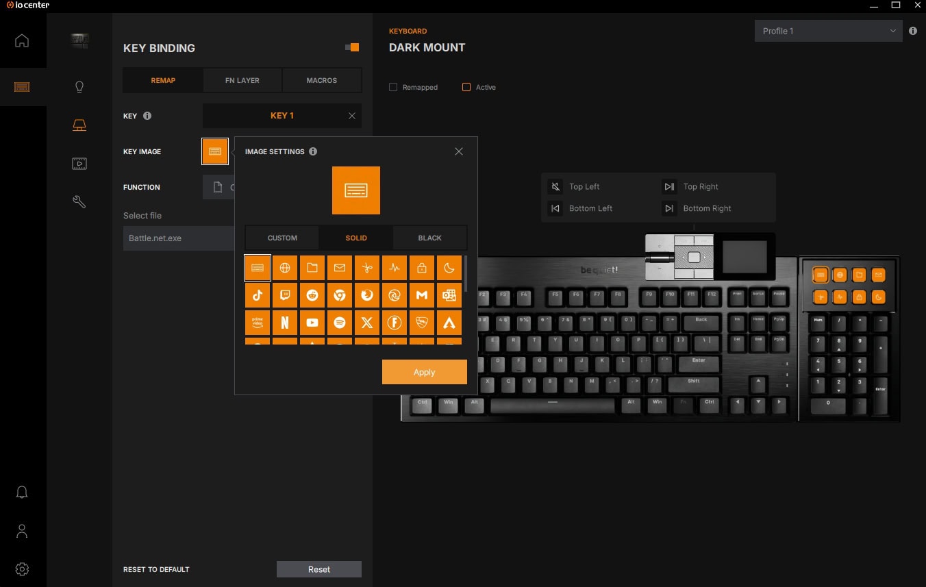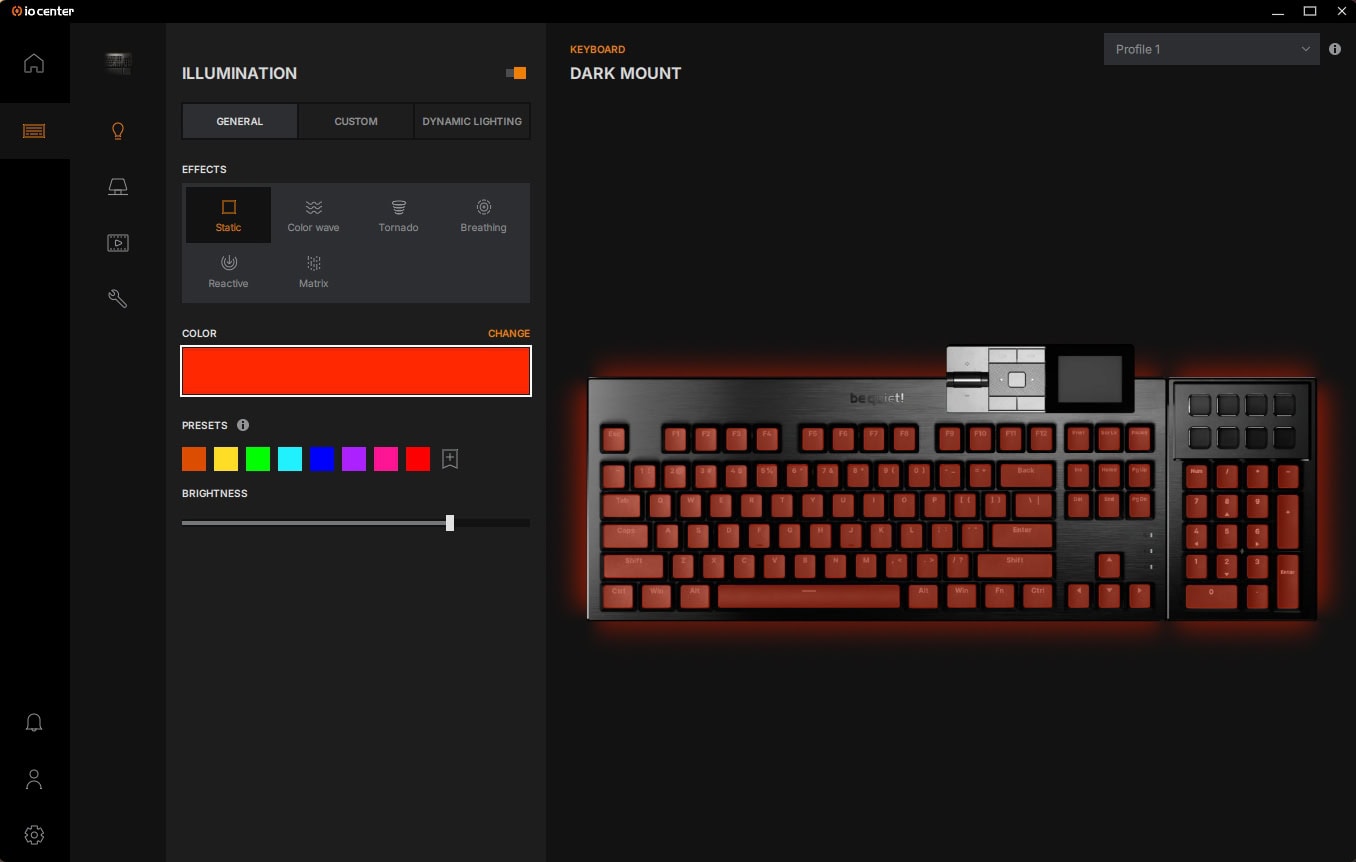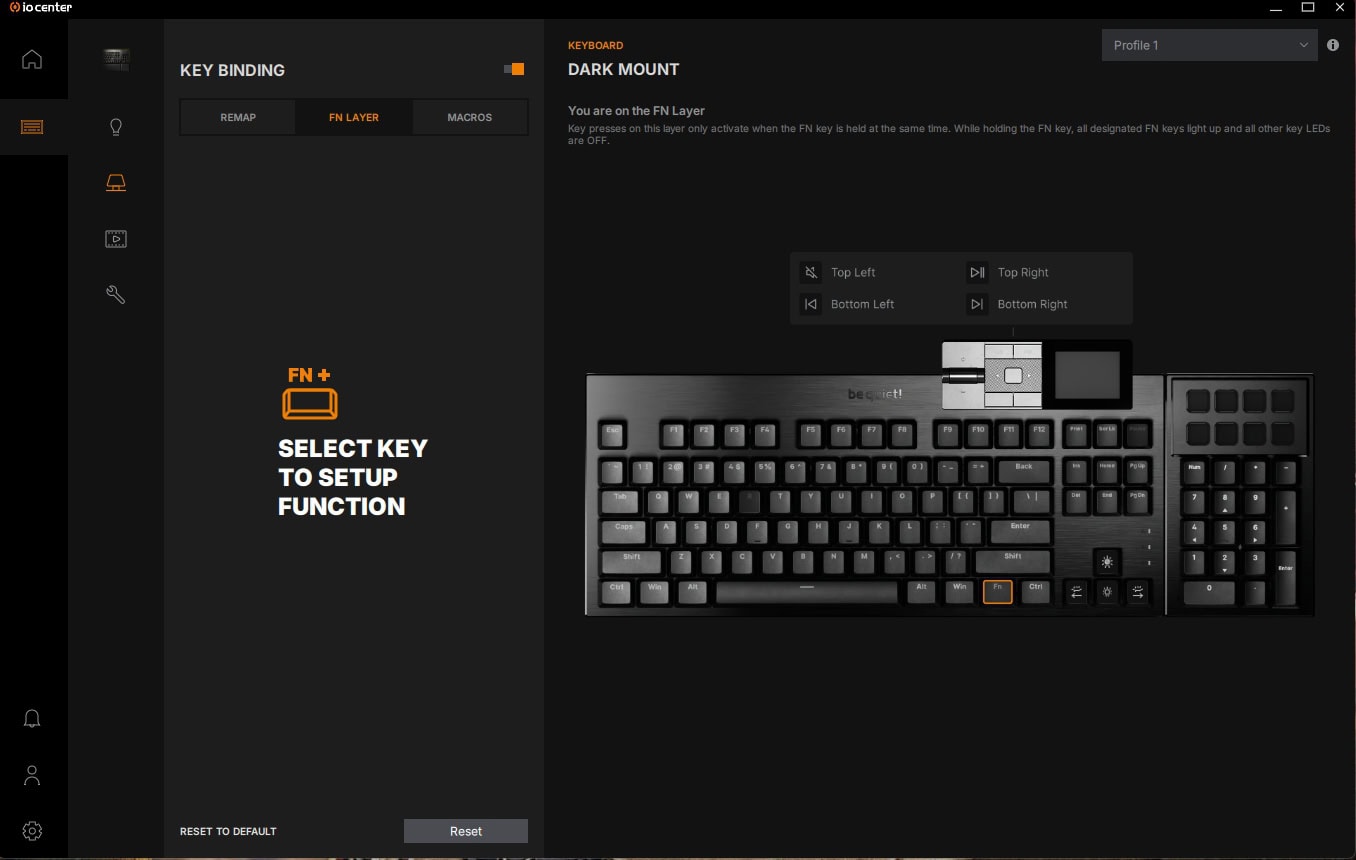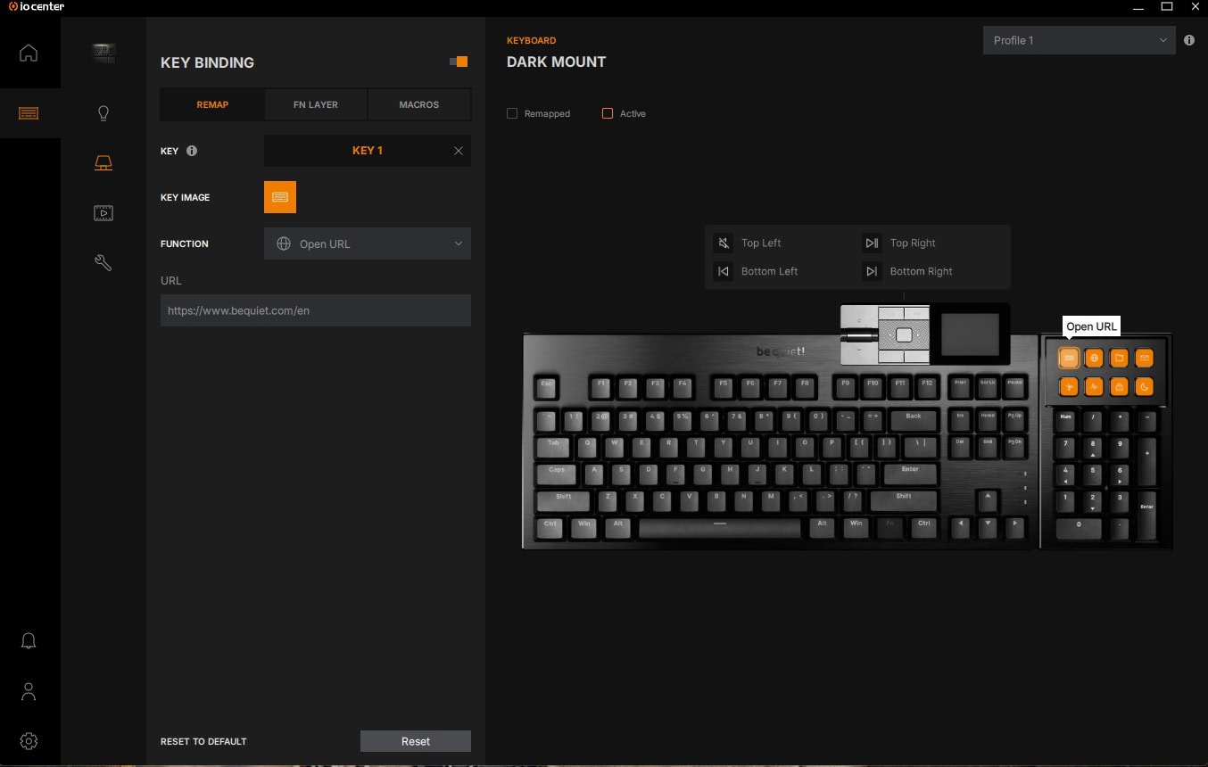 Om de Dark Mount in te stellen, kan je gebruikmaken van de be quiet! IO Center-software, die zowel als desktopsoftware te downloaden is als online via een webpagina bereikbaar is. De online versie is daarbij wel beperkter in zijn functionaliteiten en kan je onder andere geen updates zoeken en installeren voor de be quiet! randapparatuur zoals de Dark Mount.