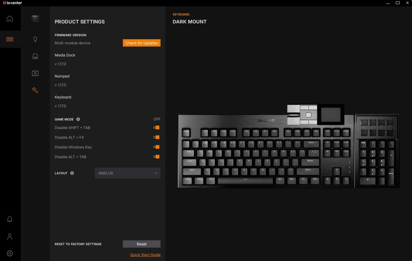Op het laatste tabblad kan je de productinstellingen aanpassen en onder andere ook dus kijken of er firmware-updates beschikbaar zijn voor jouw producten. In dit tabblad heeft be quiet! ook wat ‘gaming’-functies toegevoegd, zodat je softwarematig onder andere de Windows-toets kunt uitschakelen, zodat je deze niet per ongeluk indrukt tijdens het gamen.