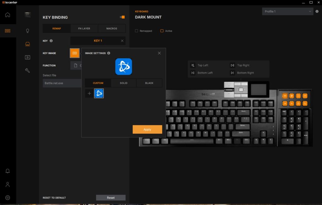 Als we verder kijken, zien we een tabblad waarbij we dus de verschillende mediatoetsen op het numerieke gedeelte kunnen instellen. Dit werkt eigenlijk grotendeels zoals je wellicht gewend bent bij Elgato met hun Stream Deck en je kan dus naast een actie ook een afbeelding toewijzen per knop. De acties zijn duidelijk en over het algemeen werken ze allemaal prima, maar het enige wat we wel jammer vinden is dat als je applicaties wil toewijzen om te openen, je zelf het .exe-bestand moet opzoeken en toewijzen.