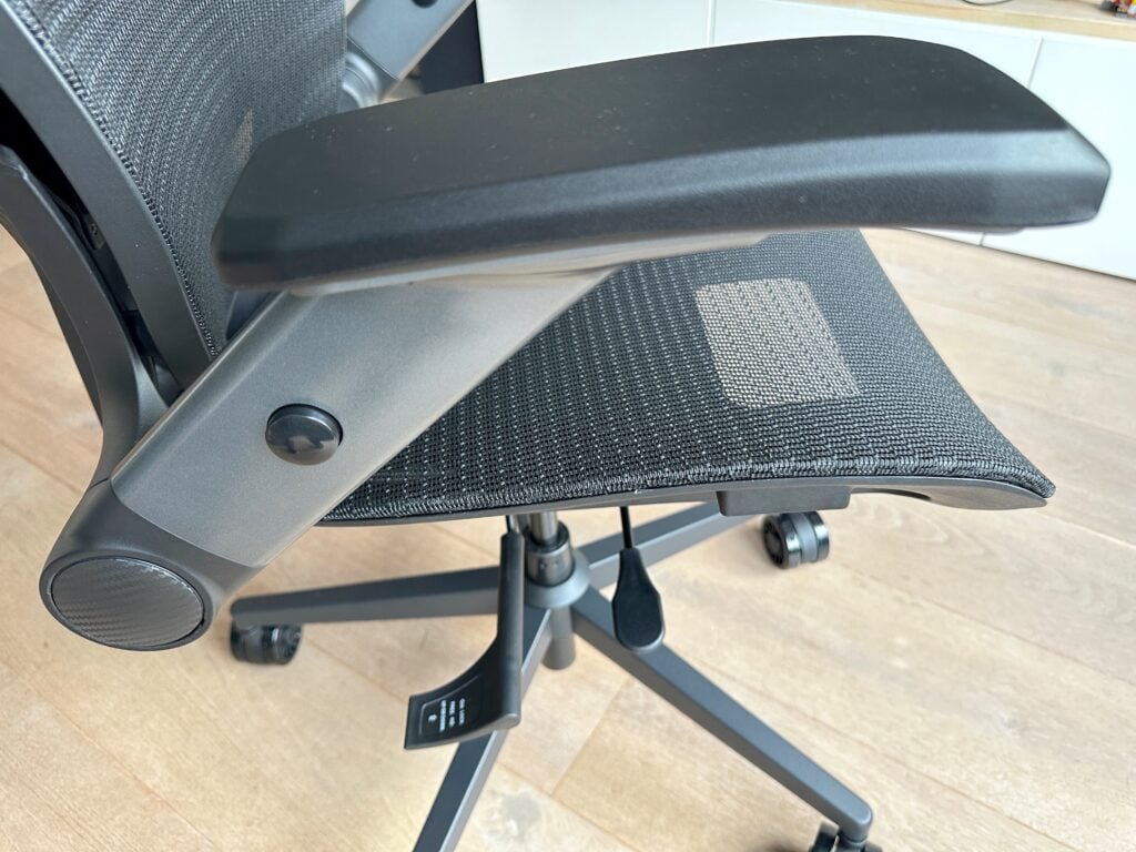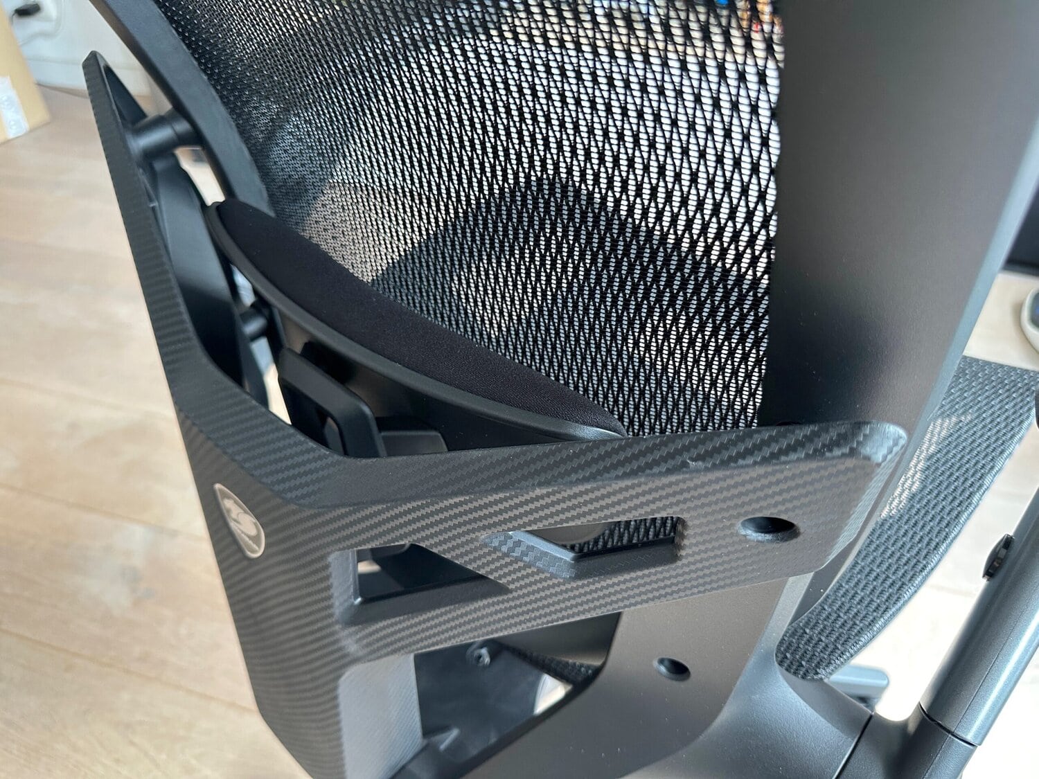 De carbonfiber printjes zitten vooral in het frame en in de armsteunen en dat steekt mooi af ten op zichten van de meshzitting en meshrugleuning.