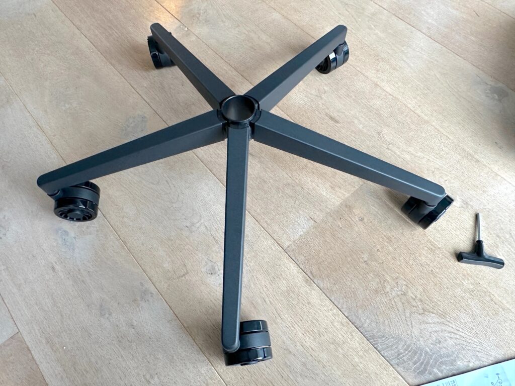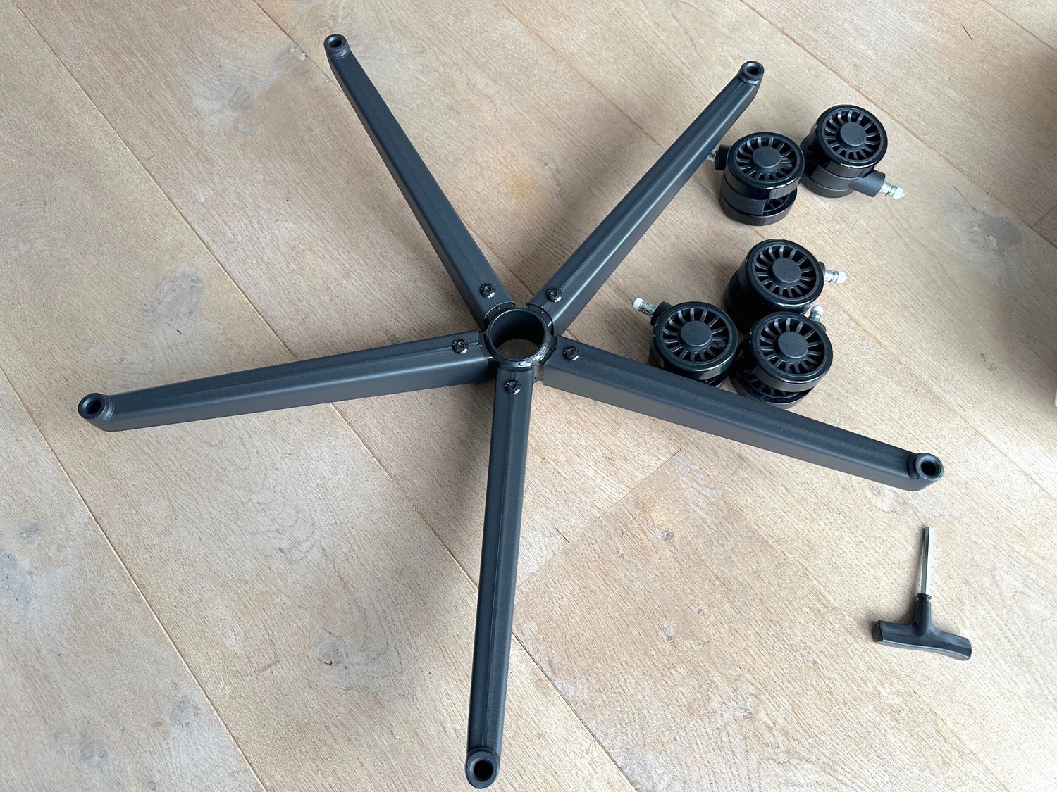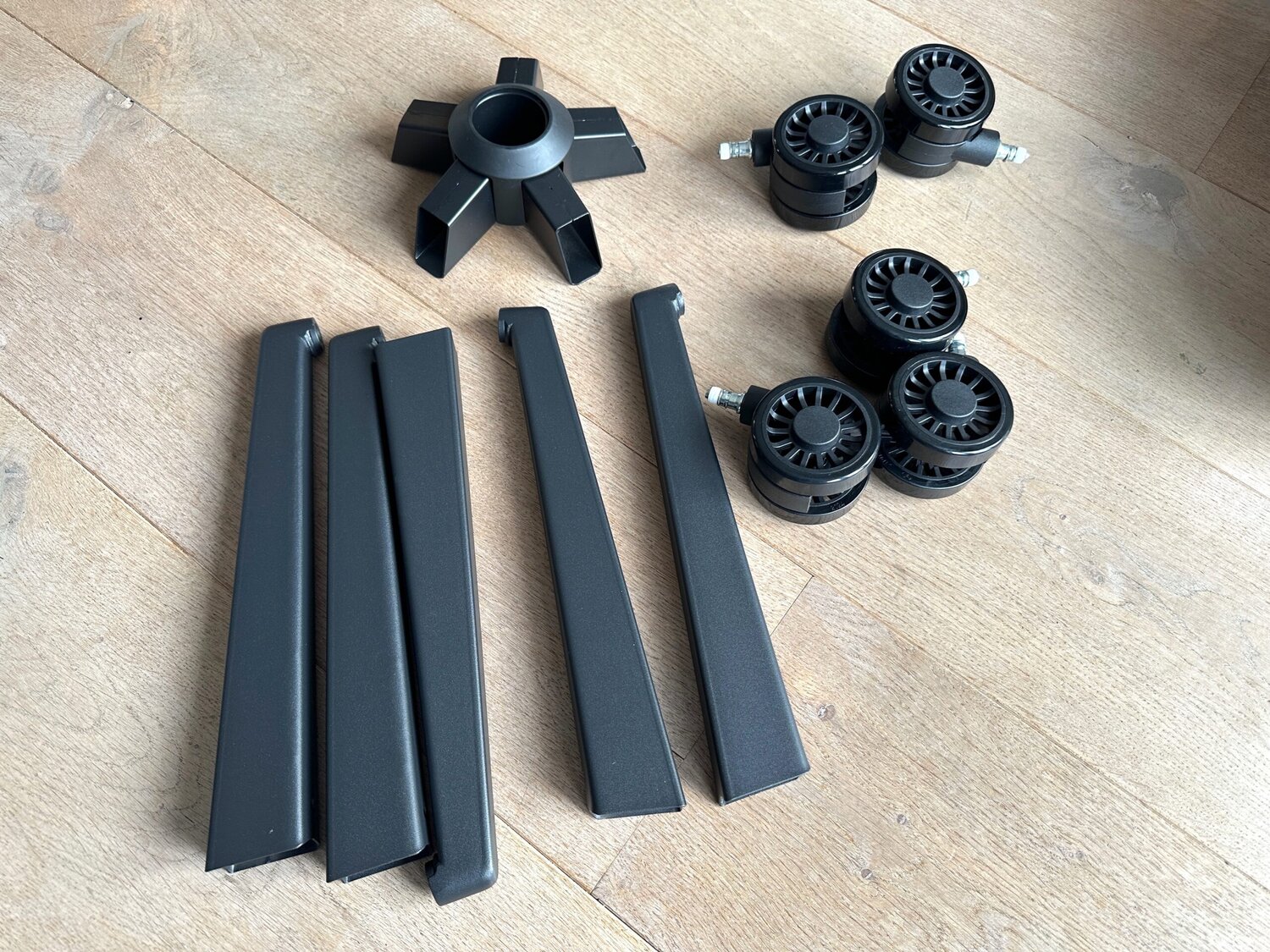 Het onderstel wordt volledig uit elkaar geleverd en samen met de gasveer, het kantelmechanisme en de zitting zelf zal hier tijdens de montage het meeste werk in gaan zitten. Het onderstel is een simpele stervariant met 5 poten en je kunt uiteindelijk de wieltjes er simpelweg inklikken, so hard can’t it be?
