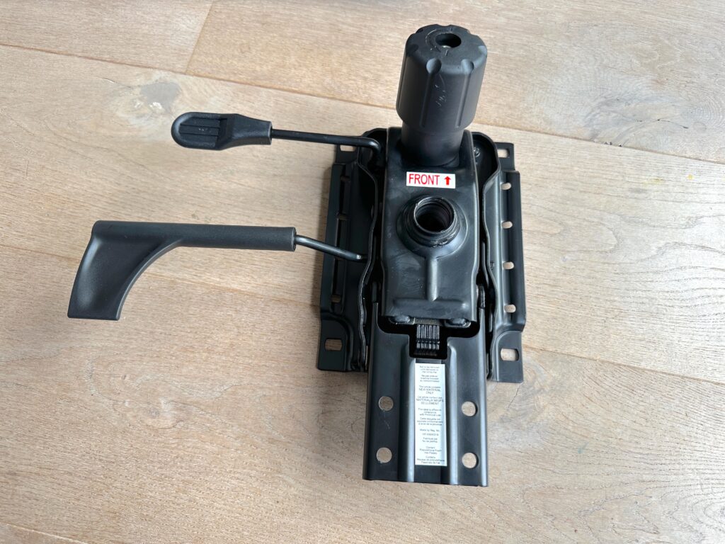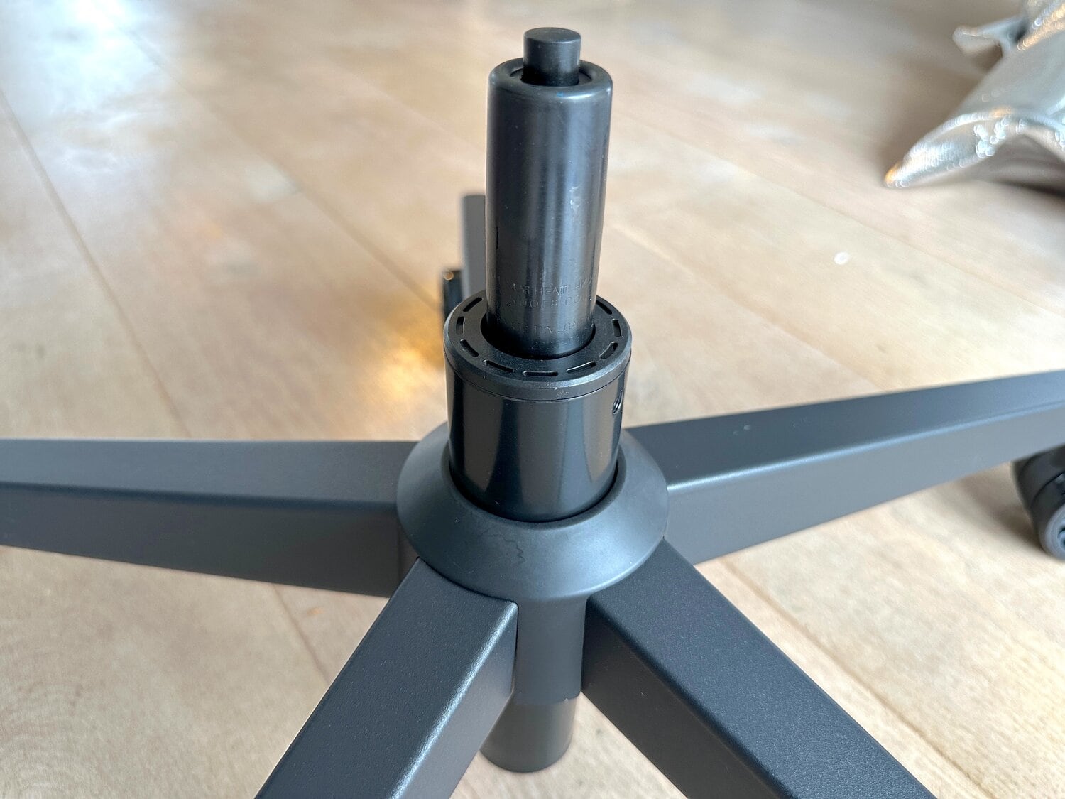 Zodra de basis staat, kunnen we overgaan op de volgende stap: de gasveer (een level vier-gasveer trouwens, waardoor de kwaliteit en het toelaatbaar gewicht goed moeten zitten) in het midden van de basis duwen. Dit kost wel wat kracht, maar dat is normaal en ook goed, want je wil natuurlijk niet dat je stoel er vandoor vliegt als je de stoel omhoog laat gaan.