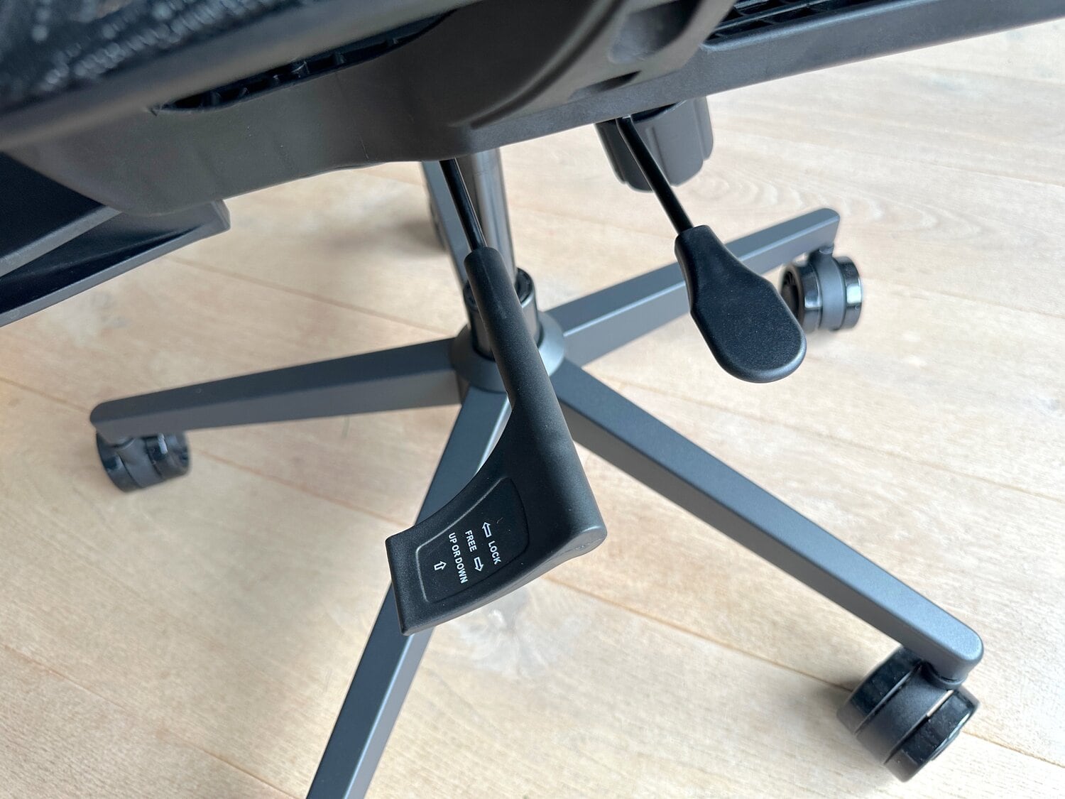 Een andere standaard luxe mag natuurlijk niet ontbreken en dat zijn de welbekende pedaaltjes aan de zijkant van de stoel waarmee je de stoel naar boven/beneden kan laten gaan en de hoek van de rugleuning kan verstellen. Een fijne toevoeging is dat je hiermee de zitting zelf ook naar voren of naar achteren kan verstellen, zodat je de ideale zithouding kunt creëren.