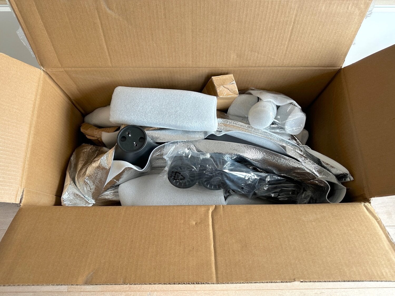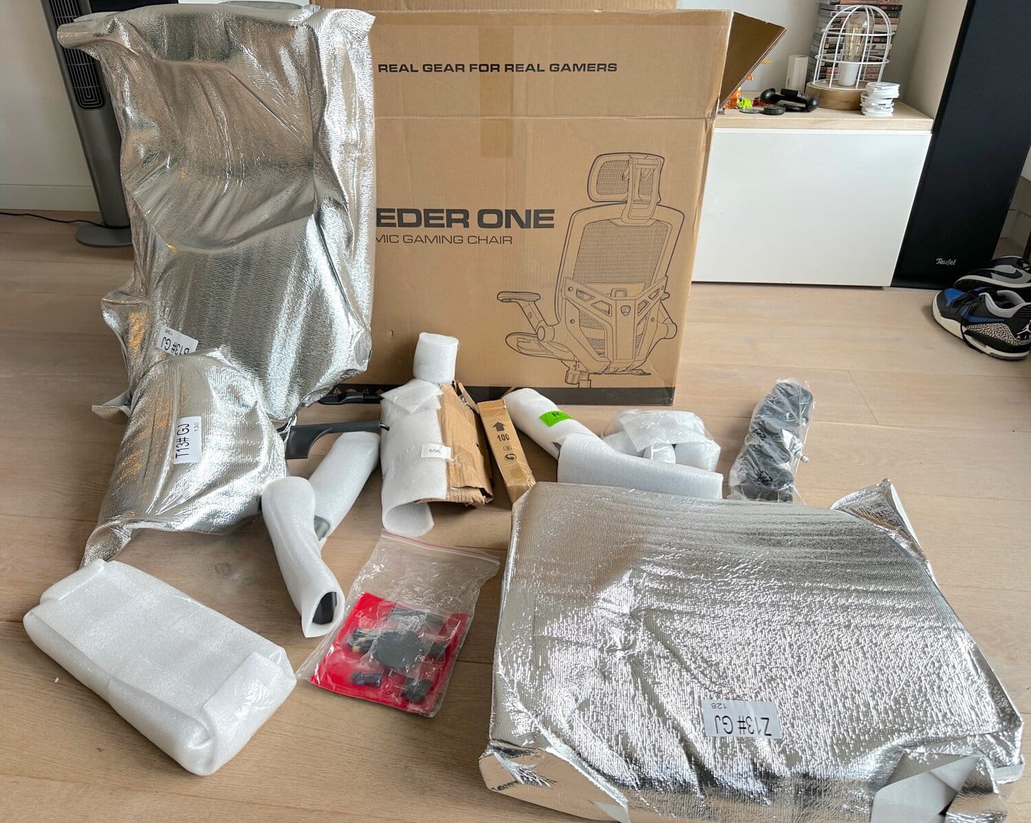 Als we de doos openmaken, zien we dat alle onderdelen los in de doos zitten, maar wel allemaal voorzien zijn van een beschermfolie eromheen, zodat het niet snel beschadigt tijdens transport. We raden wel aan om een beetje de ruimte te nemen als je zo’n stoel in elkaar gaat zetten, want het zijn behoorlijk wat onderdelen als je ze uit de doos haalt.