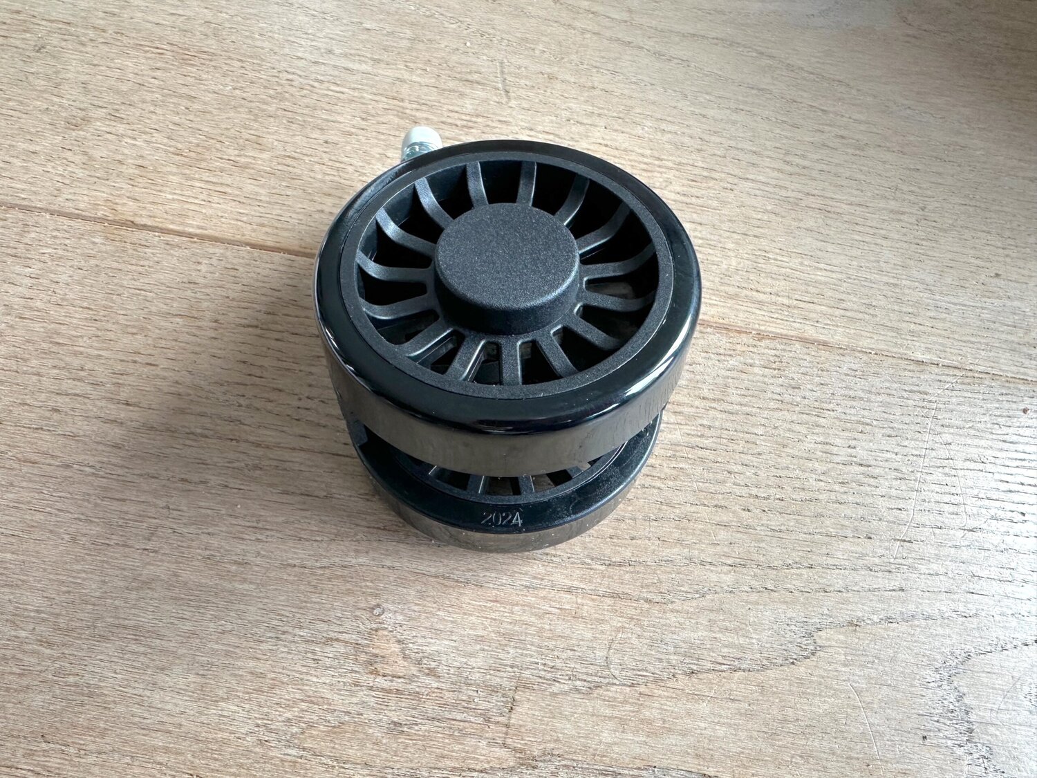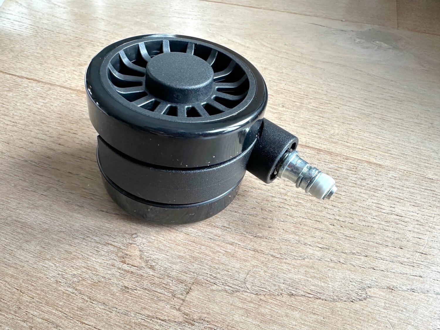 Kijken we naar de wielen, dan zijn deze redelijk standaard en zal je ze ook op meer gamestoelen tegenkomen. Elk wiel bestaat uit 2 dunne wieltjes die voorzien zijn van een zachte, glimmende coating die ervoor moet zorgen dat het bewegen/rollen van de stoel redelijk stil verloopt. Of dit ook echt zo is, zullen we in de praktijkervaring dieper op ingaan, maar we hadden graag gezien dat fabrikanten vaker van die wieltjes gebruiken die je ook bij skeelers tegenkomt, want die zijn over het algemeen nog een stuk stiller en rollen nog makkelijker.