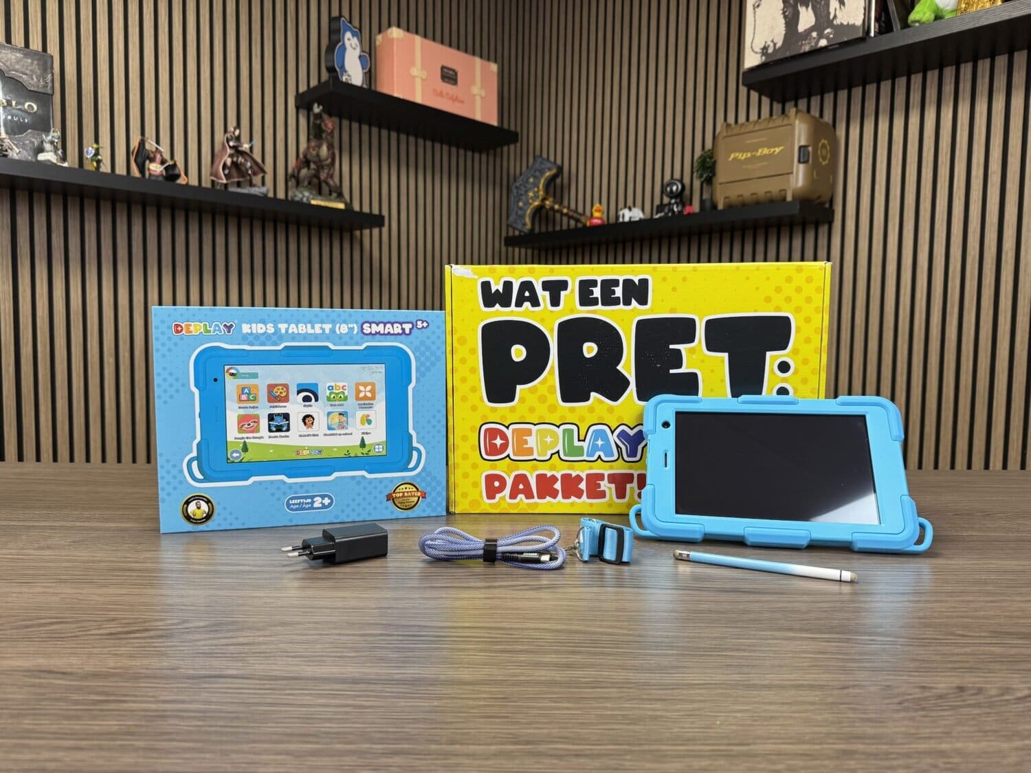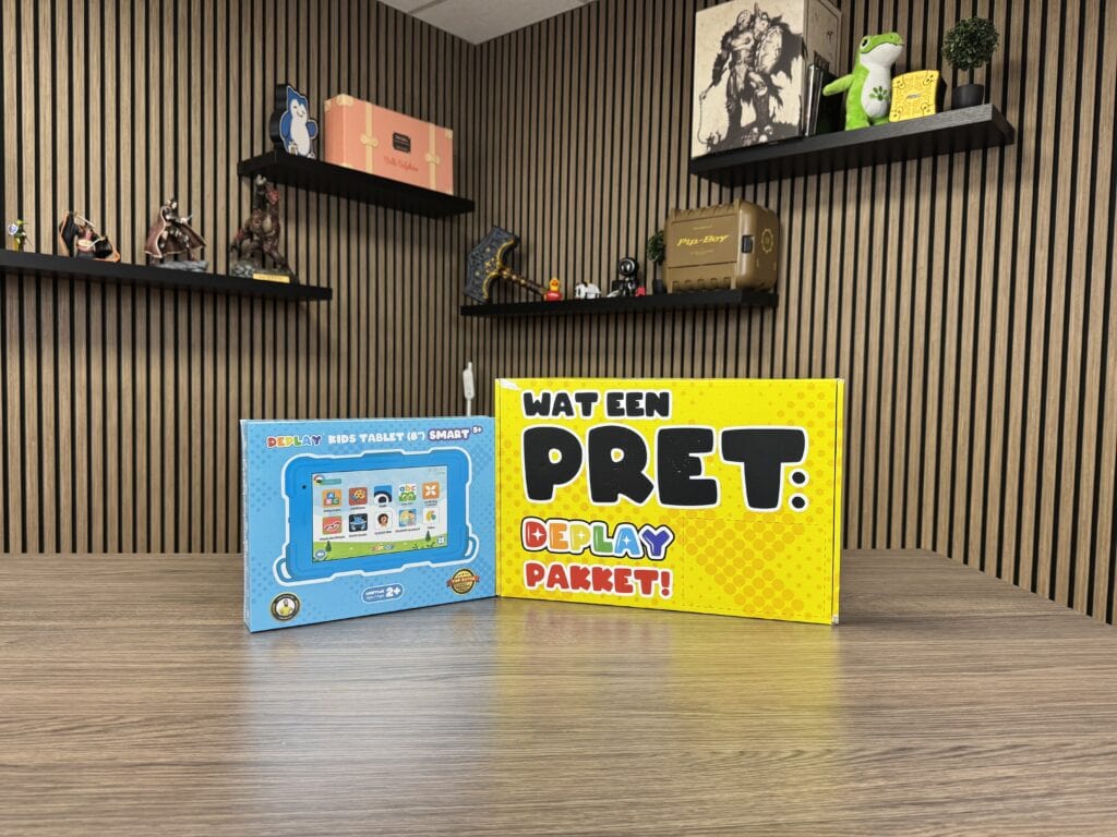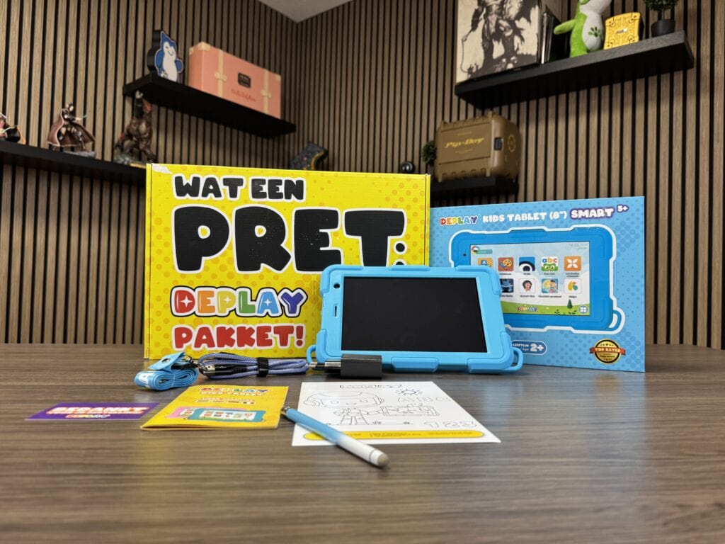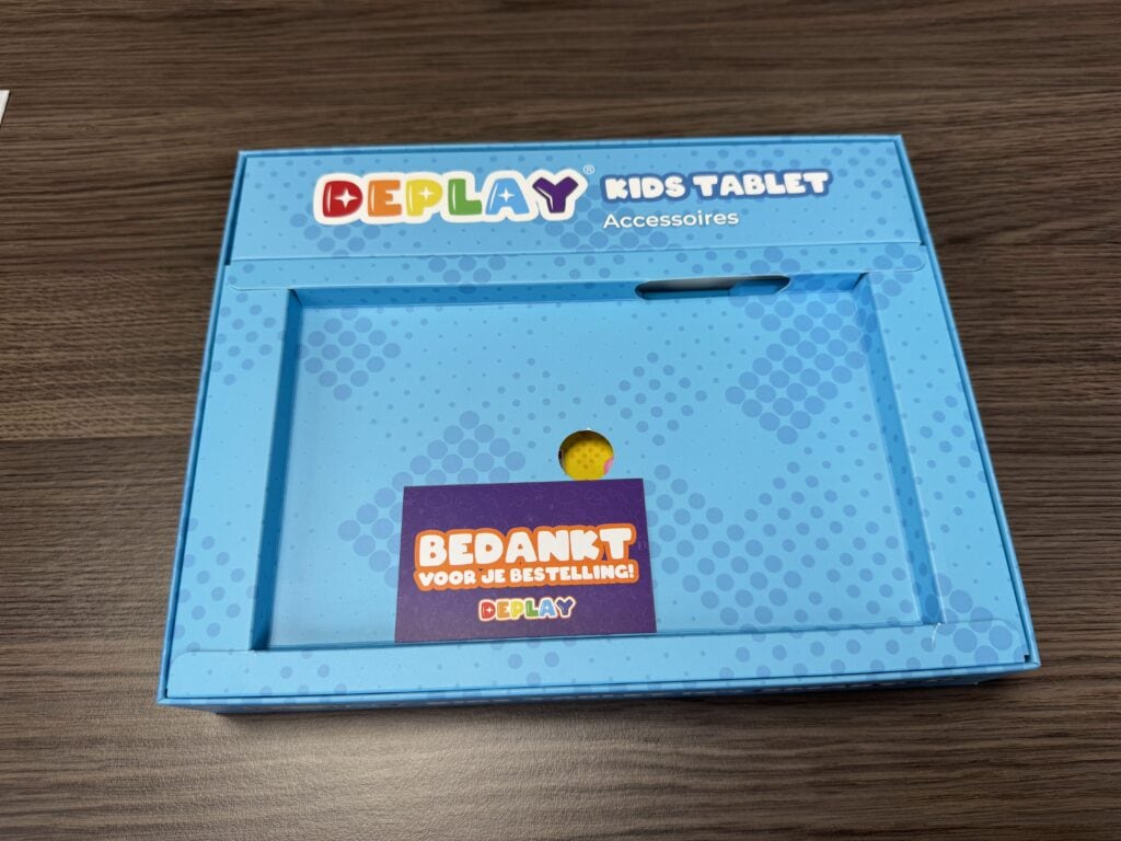 De pret begint al met de vrolijke gele doos waarin de tablet wordt opgestuurd. Op de gele doos staat de tekst: ‘Wat een Pret: DEPLAY-pakket!’. Wanneer je deze openmaakt, zie je de daadwerkelijke verpakking waarin de tablet zit. In ons geval is dit de blauwe uitvoering, die wordt geleverd in een bijpassende blauwe doos.