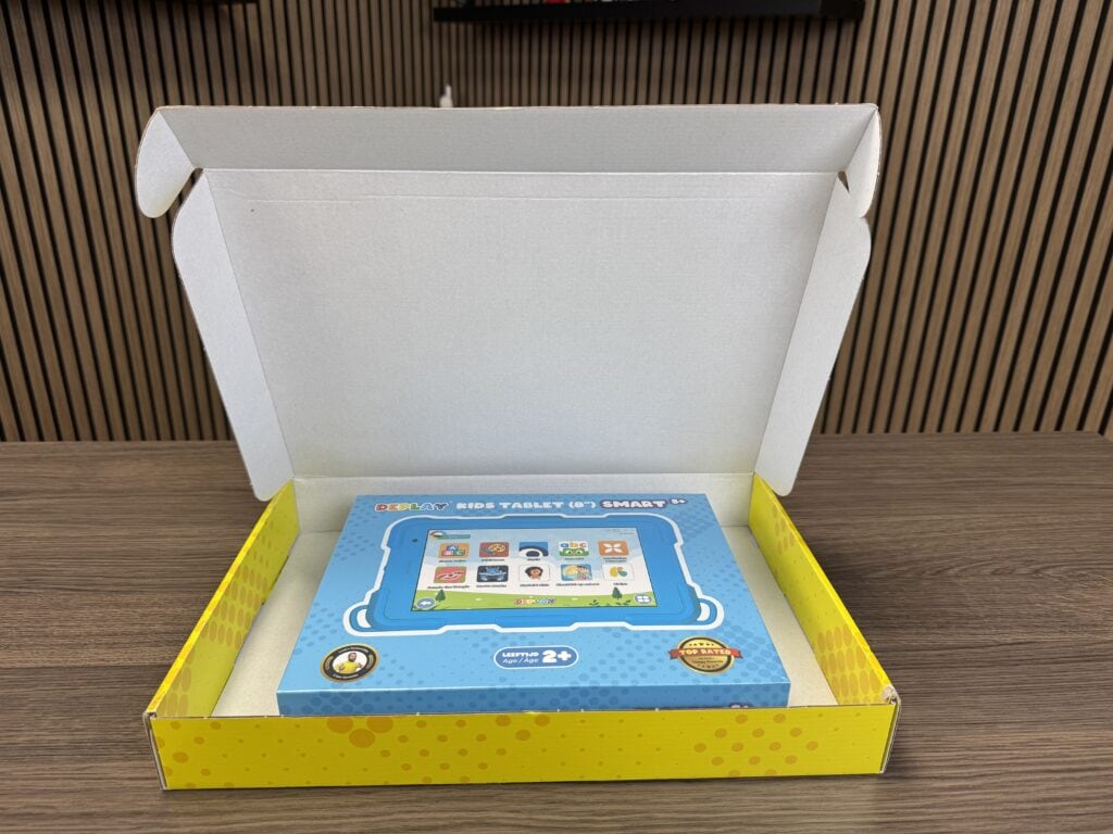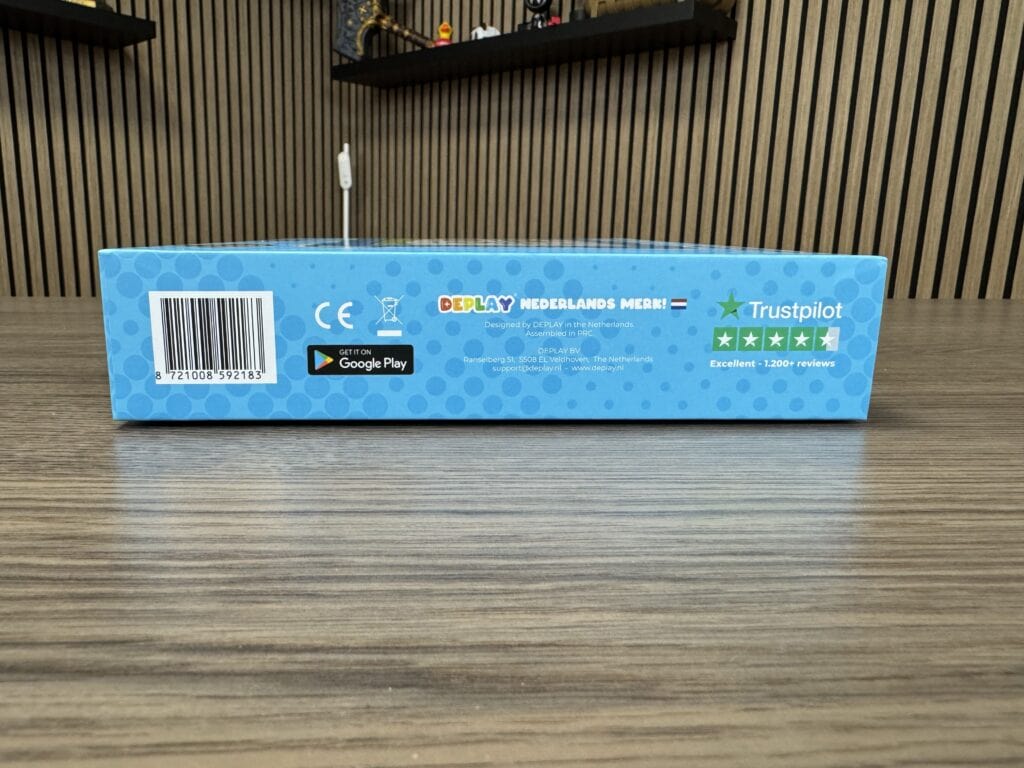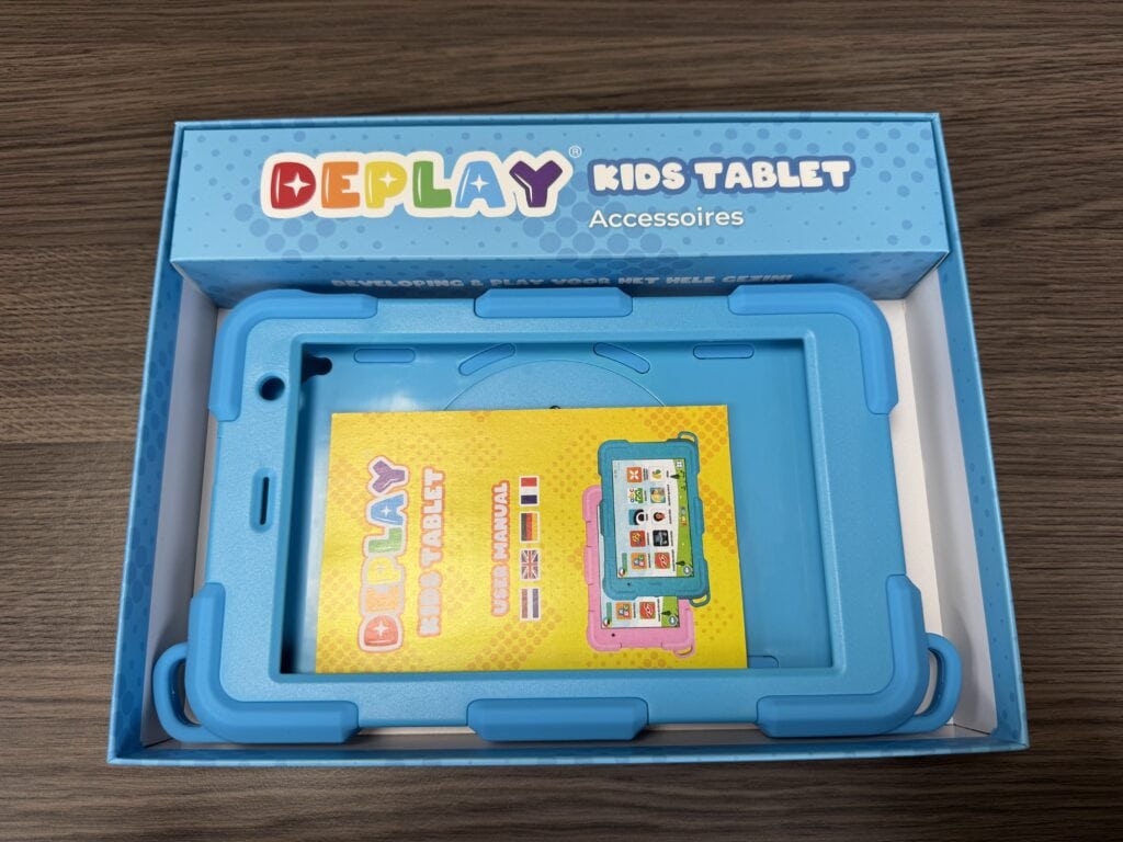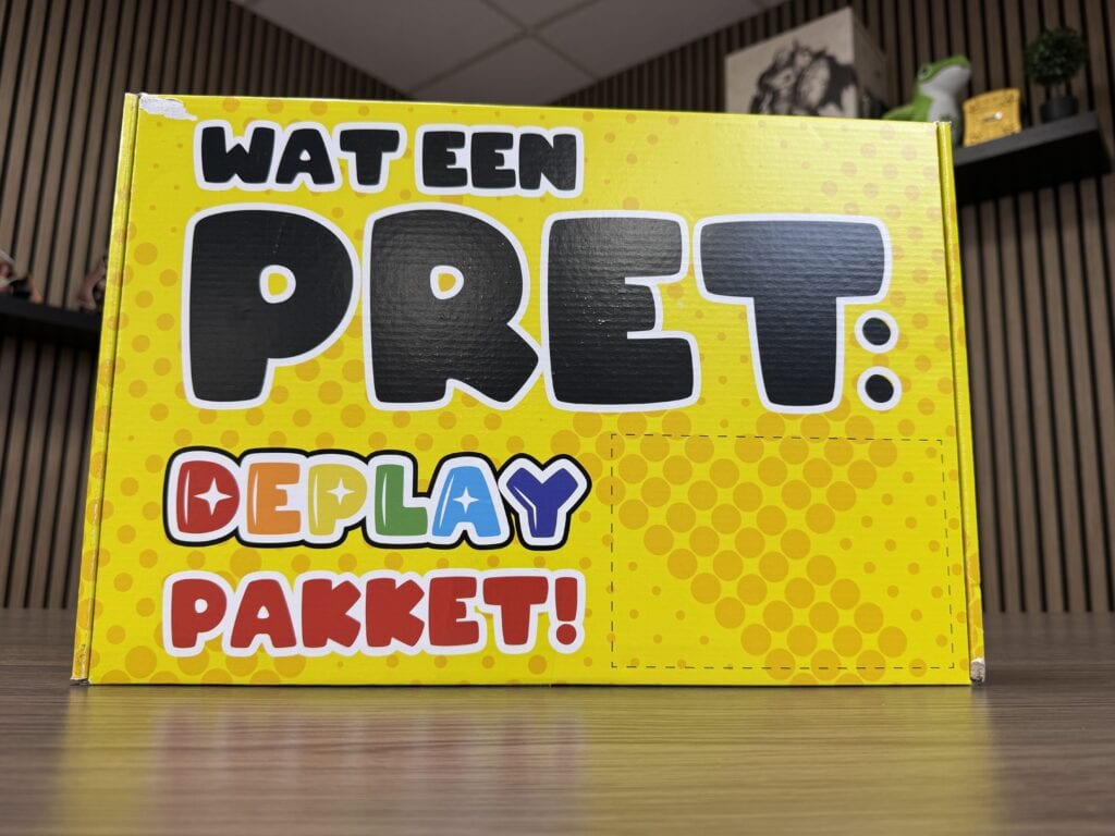 De pret begint al met de vrolijke gele doos waarin de tablet wordt opgestuurd. Op de gele doos staat de tekst: ‘Wat een Pret: DEPLAY-pakket!’. Wanneer je deze openmaakt, zie je de daadwerkelijke verpakking waarin de tablet zit. In ons geval is dit de blauwe uitvoering, die wordt geleverd in een bijpassende blauwe doos.