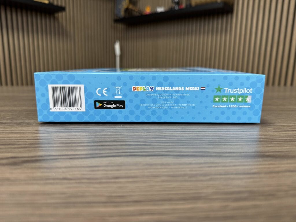 Aan de voorkant van de doos zie je een afbeelding van de tablet met hoes en de naam van de tablet. Aan de boven- en onderkant vind je de naam van de tablet: ‘DEPLAY Kids Tablet (8") Smart 5+’. Aan de linkerkant zie je wat specificaties. Rechts staat de barcode, het aantal sterren gegeven door Trustpilot en nog wat extra informatie over de fabrikant.