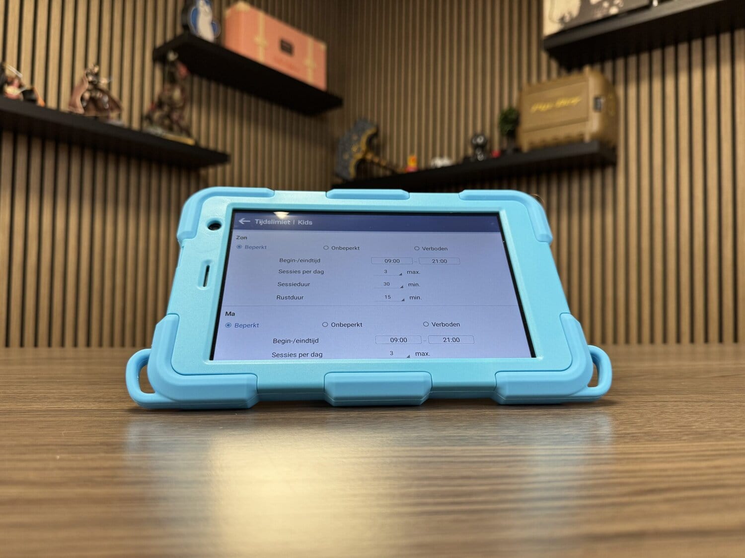 Als er meerdere kinderen gebruikmaken van de app, kan je ook meerdere kinderen hierin zetten. Ieder kind kan zijn eigen wachtwoord krijgen, waardoor ze niet zomaar op het account van de ander kunnen. Je kan alles per kind apart instellen, ideaal! Zo kan je een tijdslimiet instellen; dit kan je voor de hele week doen, maar ook per dag instellen. In het weekend kan je dan je kindje bijvoorbeeld iets meer tijd geven dan doordeweeks. De tijdslimiet heeft verschillende aspecten die je kan instellen: binnen welke tijden je kindje de tablet mag gebruiken (bijvoorbeeld van 9:00 t/m 17:00), maar ook het aantal sessies en de duur van een sessie.