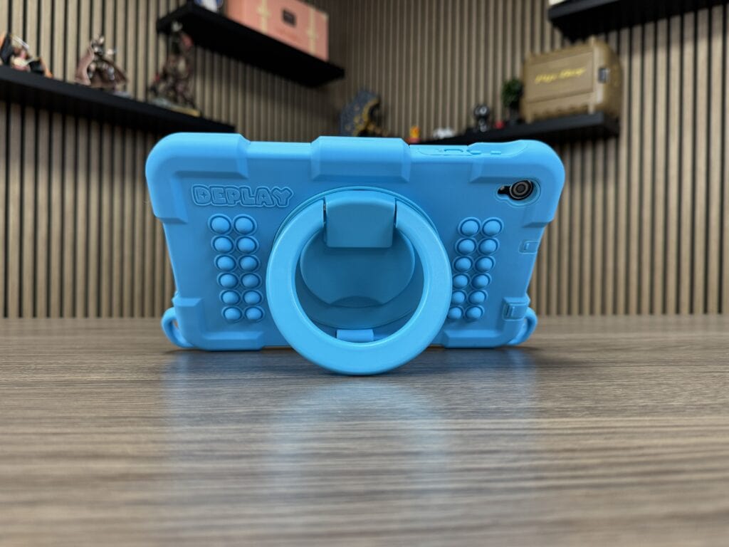 Naast de brede rand van de beschermhoes heeft deze ook een stevige ring achterop zitten waarmee je de tablet rechtop kunt zetten, ideaal dus voor het kijken van een filmpje. Ook heeft de hoes van de DEPLAY Kids Tablet (8") SMART 5+ twee brede ogen aan de hoes, waarmee je de tablet om je nek kan hangen of aan de hoofdsteunen van de auto.