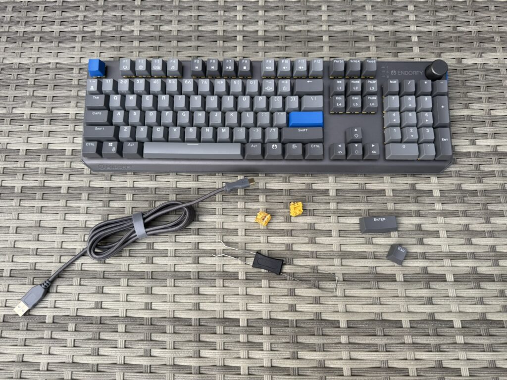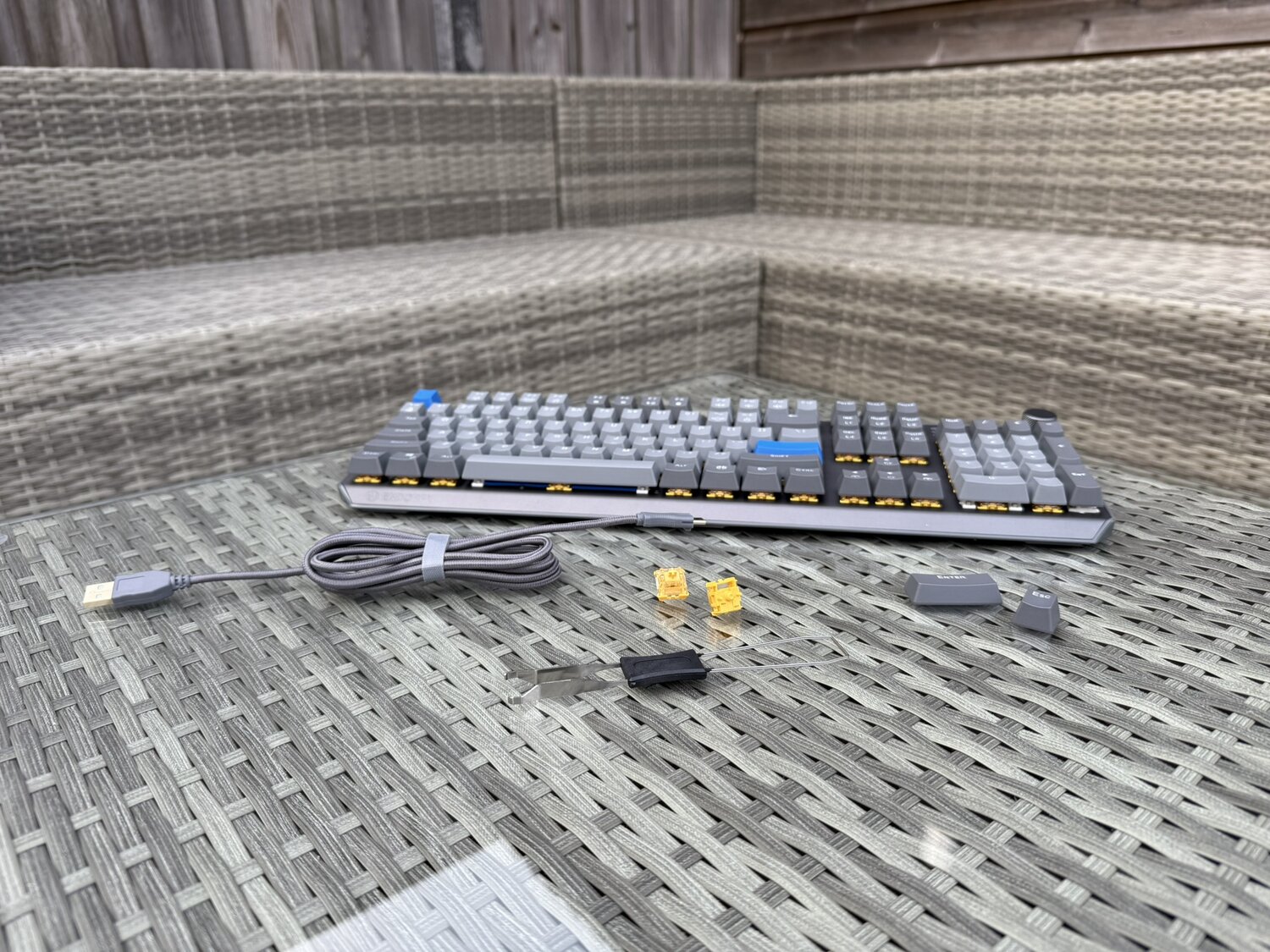 De doos is rijk gevuld met accessoires die je meteen het idee geven dat je alles in handen hebt om te starten: extra switches, vervangende keycaps voor de blauwe escapetoets en enter-toets, een keycap- en switchpuller en een stevige gevlochten USB-kabel. Het bord zelf oogt en voelt door het materiaal en door het gewicht robuust en de fullsize lay-out met numpad maakt het ook goed geschikt voor werk.