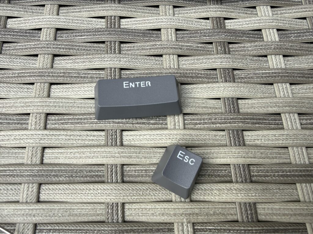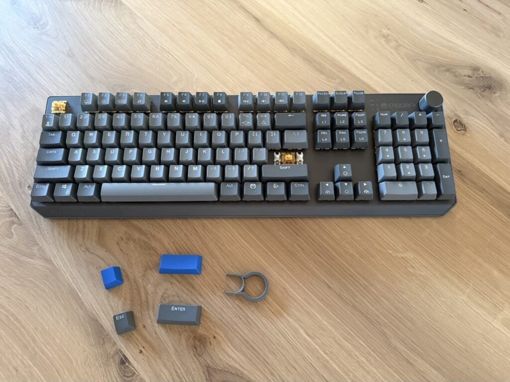 Als laatste nog de aanpasbaarheid van de Endorfy Thock V2 Wireless. Met de bijgeleverde keycap pullers is het verwijderen van de toetsen een fluitje van een cent. Het verwijderen van de keycaps en het terugplaatsen kost geen enkele moeite en de blauwe keycaps zijn binnen een klein ogenblik vervangen door de grijze “normale" toetsen.