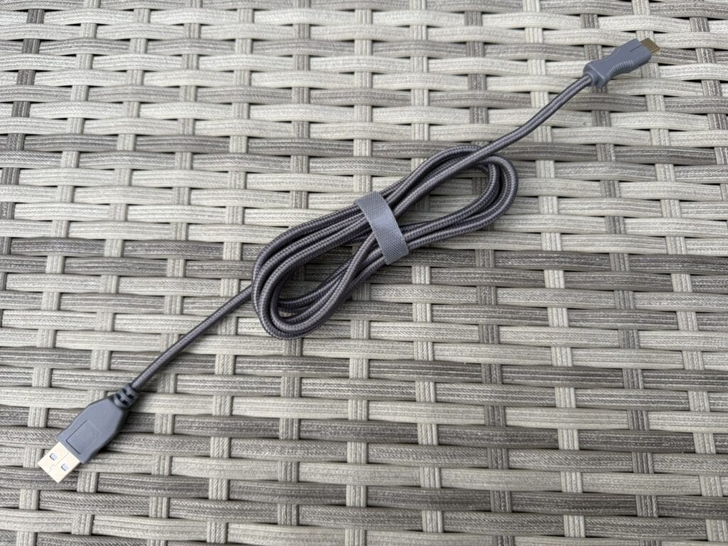 Zoals we al in de inleiding hebben verklapt, bulkt het in deze doos van de extra’s. Zo zijn er vervangende keycaps meegeleverd voor wie liever een escape- of entertoets in dezelfde kleurstelling wil als de rest van de toetsen, namelijk grijs. Er is een switch- en keycappuller meegeleverd om ook de switches uit het toetsenbord te kunnen trekken. En natuurlijk de USB-A-naar-USB-C-kabel. Deze voelt stevig aan en is voorzien van een gevlochten mantel, precies zoals we het graag zien. En toch mis ik iets…