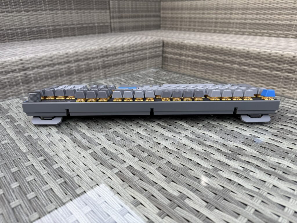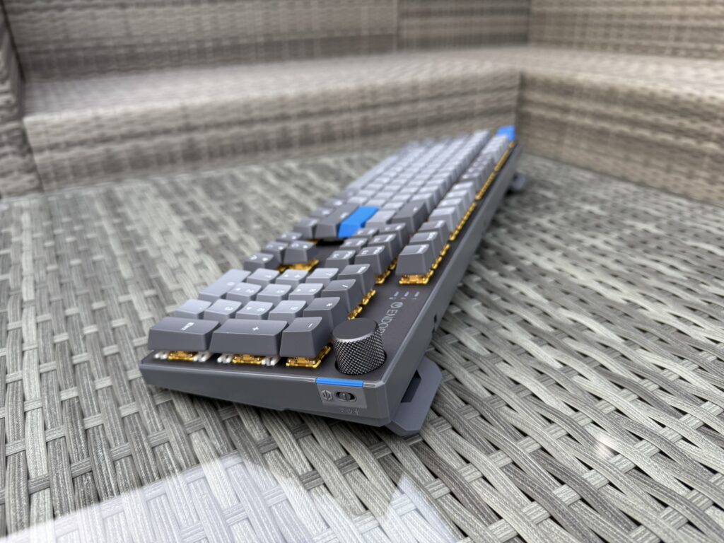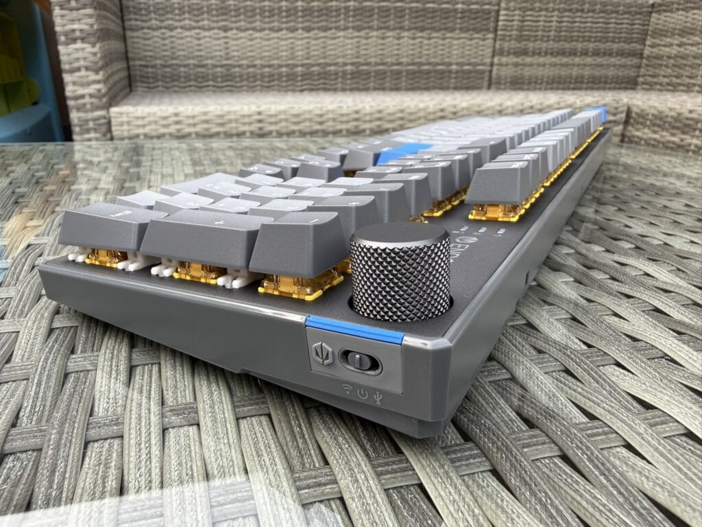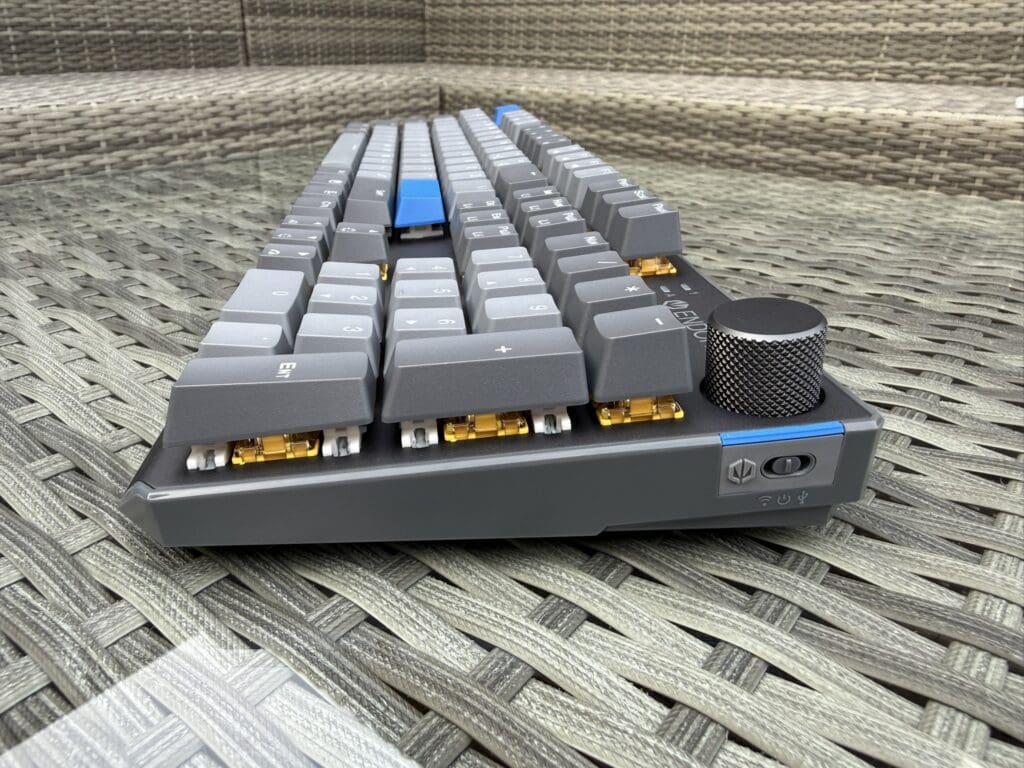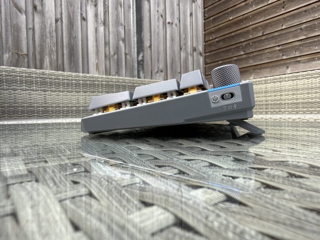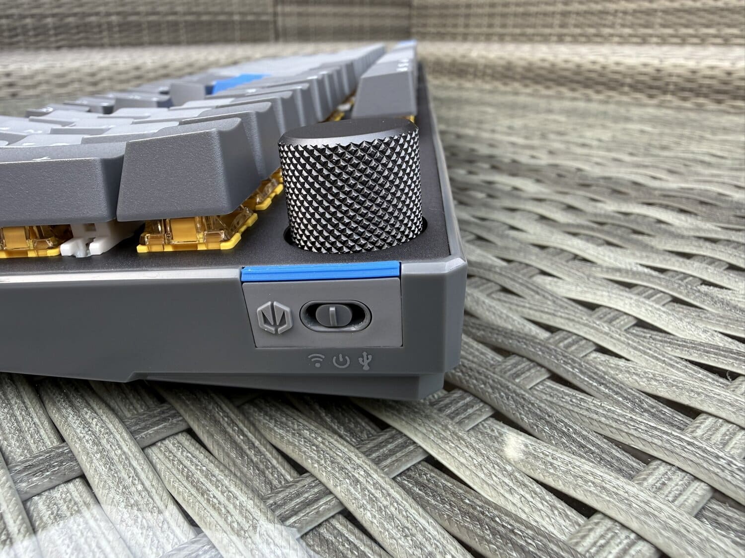 De keycaps zijn vervaardigd uit double shot PBT, hebben een matte afwerking en een lichte textuur. Rechtsboven bevindt zich een draai- en drukknop voor de volumeregeling, eveneens van metaal, die met dezelfde kleur als de bovenplaat netjes in het ontwerp is geïntegreerd. De behuizing zelf is grotendeels van kunststof, maar voelt solide en zorgvuldig afgewerkt aan.