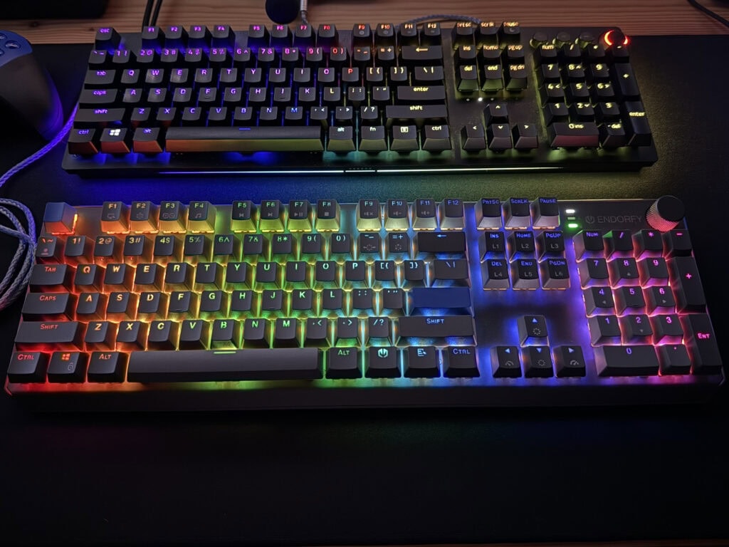 De Endorfy Thock V2 Wireless beschikt over ARGB-verlichting onder iedere toets en is met de software volledig naar wens in te stellen. Door de hot-swappable switches die op het toetsenbord liggen en de grijze bovenplaat is de verlichting erg goed te zien. Anders dan bij een zwarte bovenplaat, waar de verlichting met name door de symbolen op het toetsenbord komt, komt de verlichting rond de toetsen ook goed tot zijn recht. Dit verschil is op onderstaande foto, waar een ander toetsenbord boven staat, goed te zien.