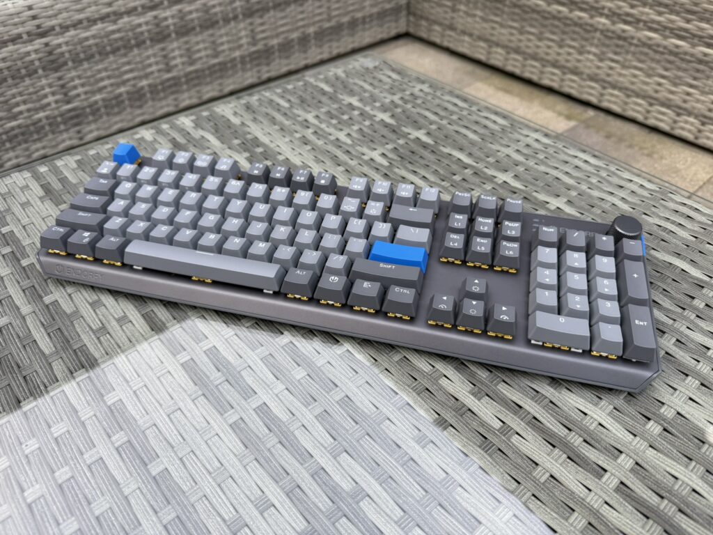 Bij het oppakken van het toetsenbord valt direct op dat het stevig aanvoelt en het een kwalitatief hoge mate van afwerking heeft. De bovenplaat is uitgevoerd in donkergrijs aluminium, wat het geheel een degelijke en robuuste uitstraling geeft. Het diepe grijs van de bovenplaat wordt aangevuld door keycaps in twee lichtere grijstinten, waardoor er een sierlijk, maar ook stoer contrast ontstaat. De escape- en enter-toetsen zijn uitgevoerd in de kleur blauw en maken het geheel meteen wat specialer.