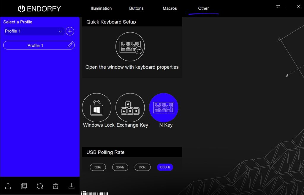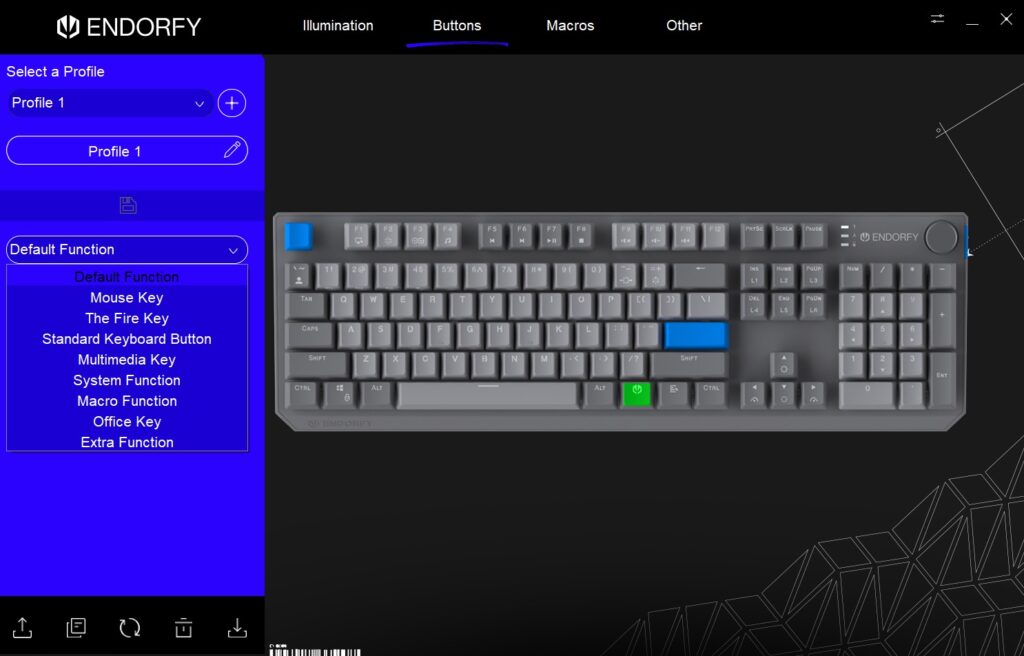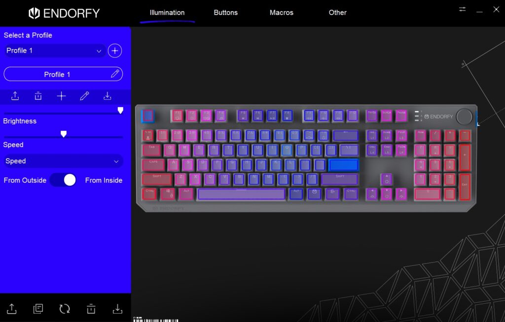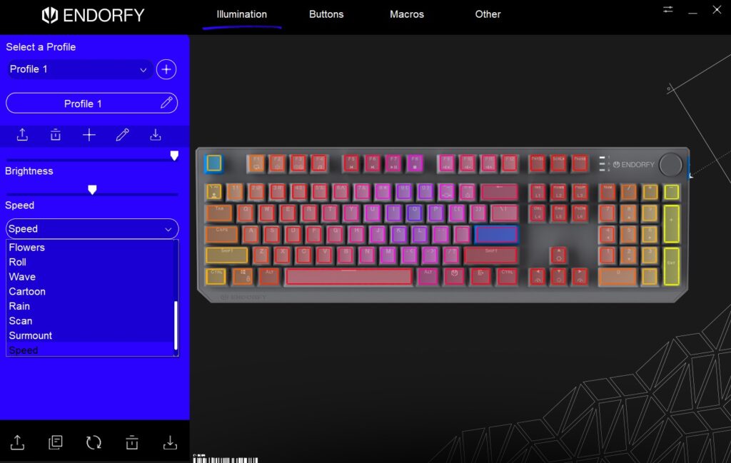 De Endorfy‑software voor de Thock V2 Wireless biedt de bekende basisfuncties: het aanpassen van RGB‑verlichting, het maken van macro’s, het herprogrammeren van toetsen en het bijwerken van de firmware. Dit werkt zowel bedraad als via de 2.4 GHz-ontvanger. De mogelijkheden zijn echter minder uitgebreid dan bij de grotere merken en het is bijvoorbeeld niet mogelijk om onder de FN‑toets extra functies toe te wijzen, iets wat andere merken vaak wel ondersteunen.
