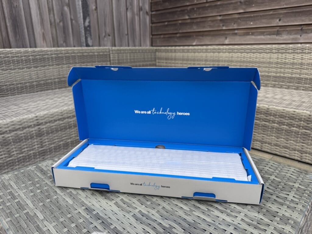 De verpakking volgt het vertrouwde patroon dat we bij bijna alle toetsenborden zien: een rechthoekige doos van stevig karton. De doos heeft een matte afwerking, waarbij de foto’s van het product glanzend zijn afgewerkt.