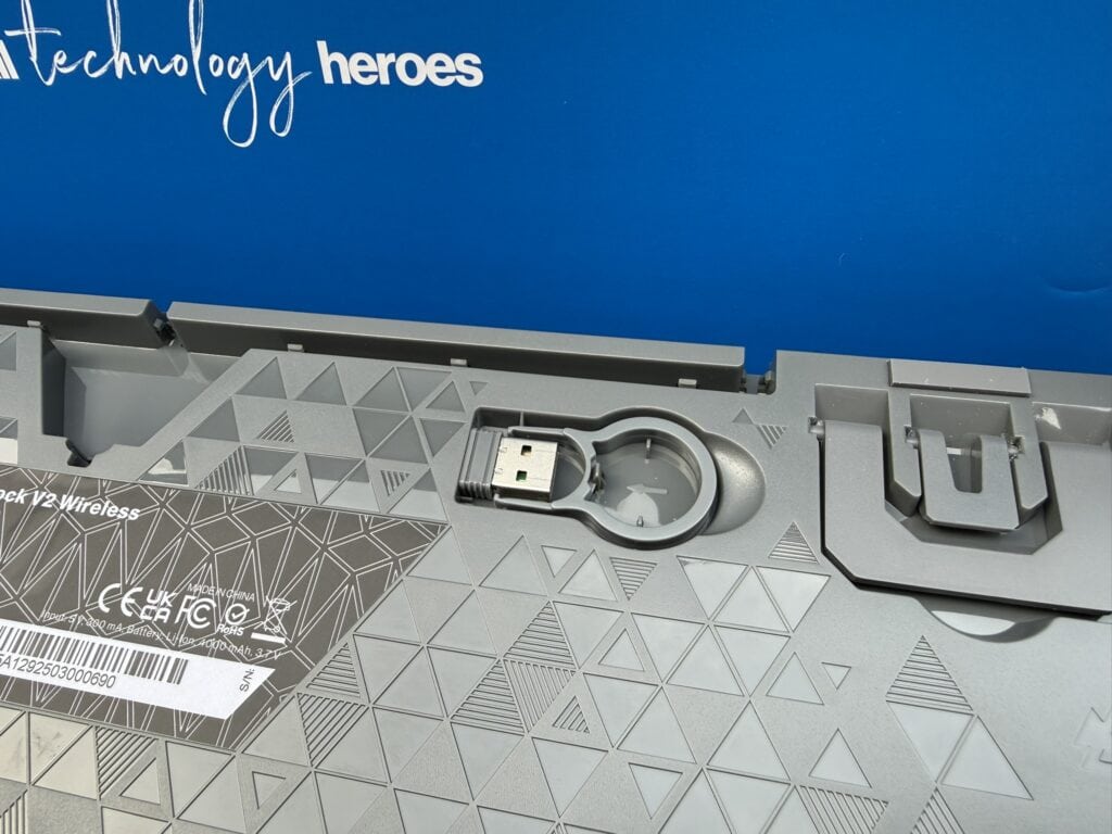 Aan de onderzijde is een patroon in het kunststof verwerkt dat futuristisch oogt. Vijf rubberen voetjes zorgen voor stabiliteit op het bureau, en de verstelbare pootjes maken het mogelijk om het toetsenbord in meerdere hoeken te plaatsen. Hier aan de onderzijde vinden we ook een keycap puller en de 2.4 GHz-ontvanger, die magnetisch bevestigd is. Voor wie het toetsenbord liever bedraad gebruikt of wanneer opladen nodig is, kan de kabel via inkepingen op drie verschillende punten uit het toetsenbord worden geleid.
