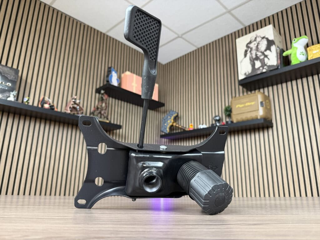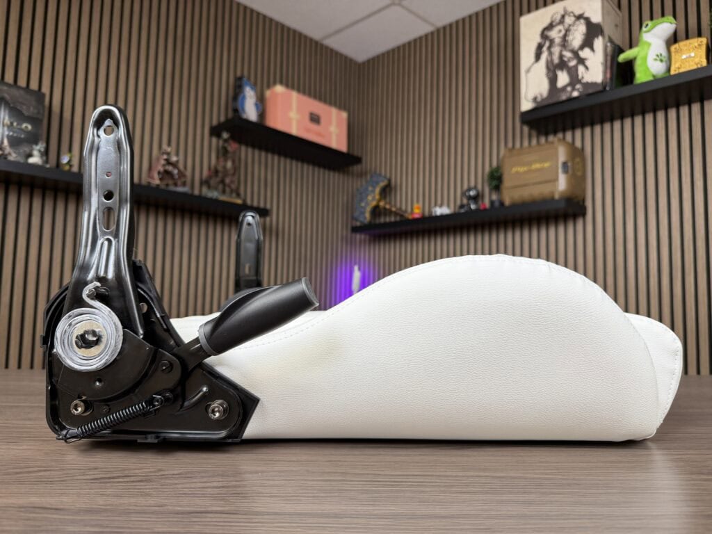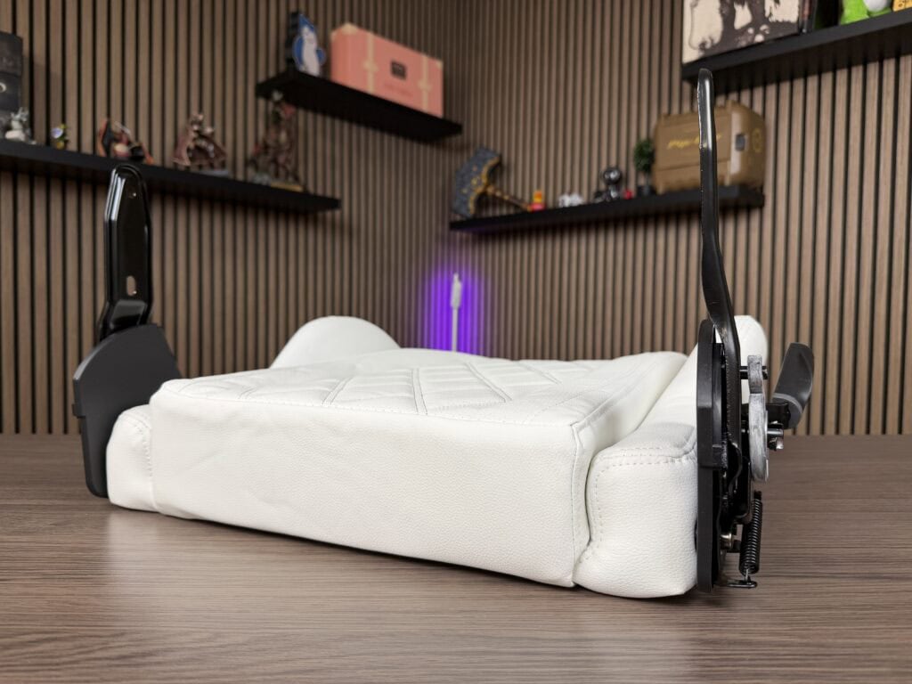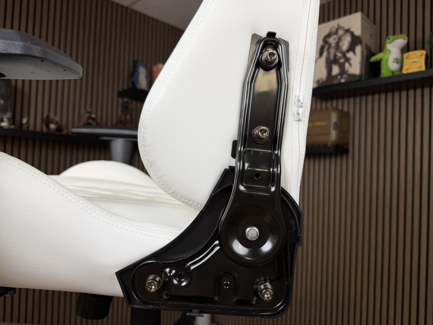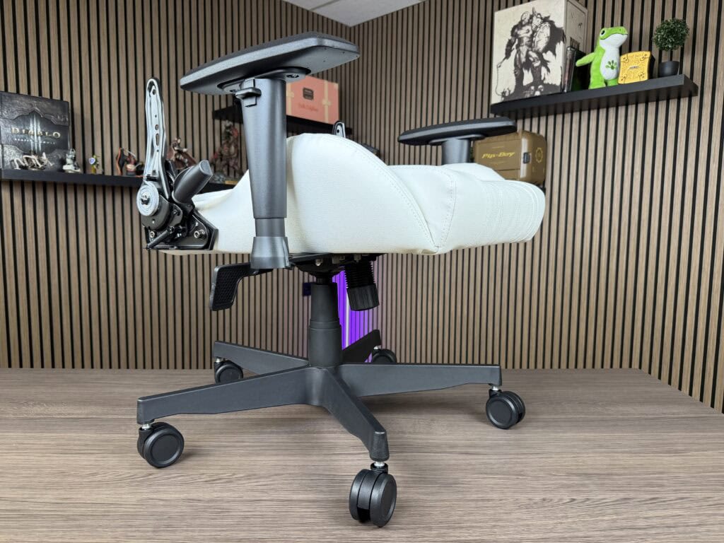 De zuiver witte kleur op het zitvlak springt er heerlijk uit. De stoel valt op kantoor erg op tussen de veelal met zwart beklede stoelen. Aan de linkerzijde is de hendel voor de kantelfunctie te vinden. De Darkside 3 is kantelbaar tot 170 graden, wat best indrukwekkend is. We komen veel gamestoelen tegen die tot 125 graden kantelbaar zijn.