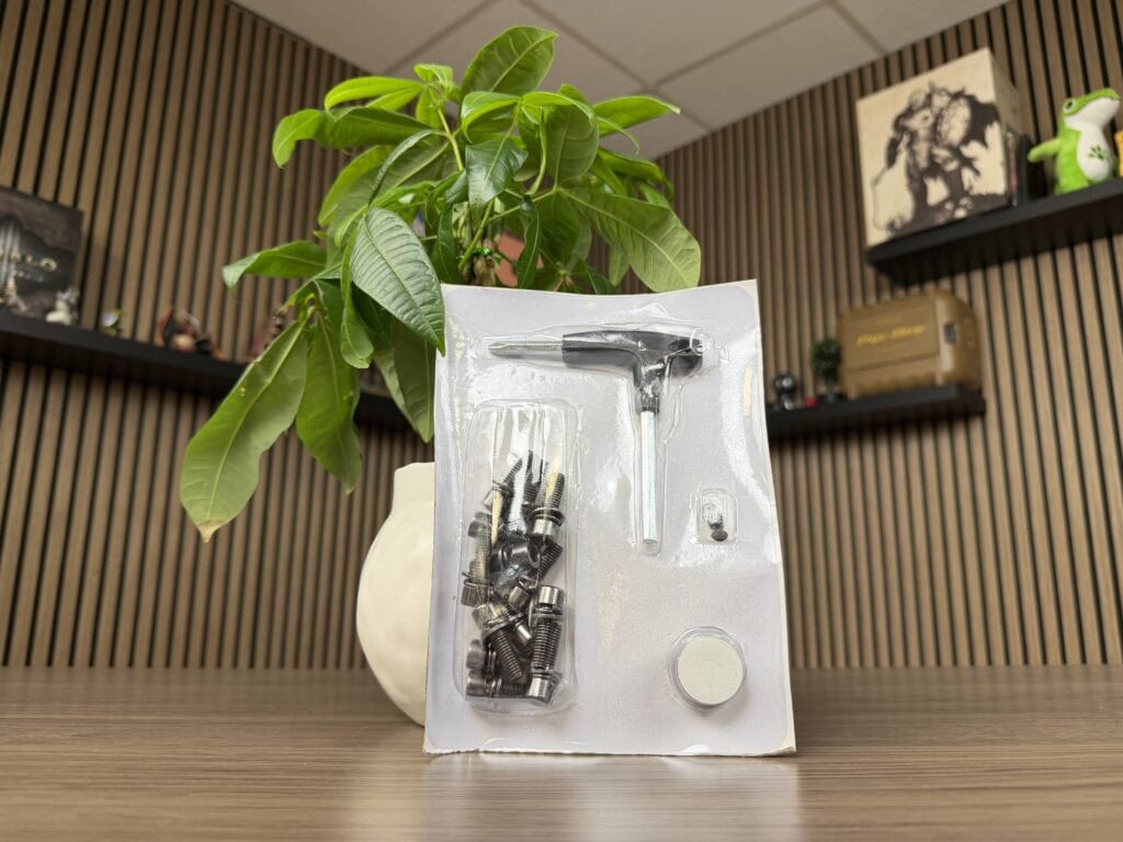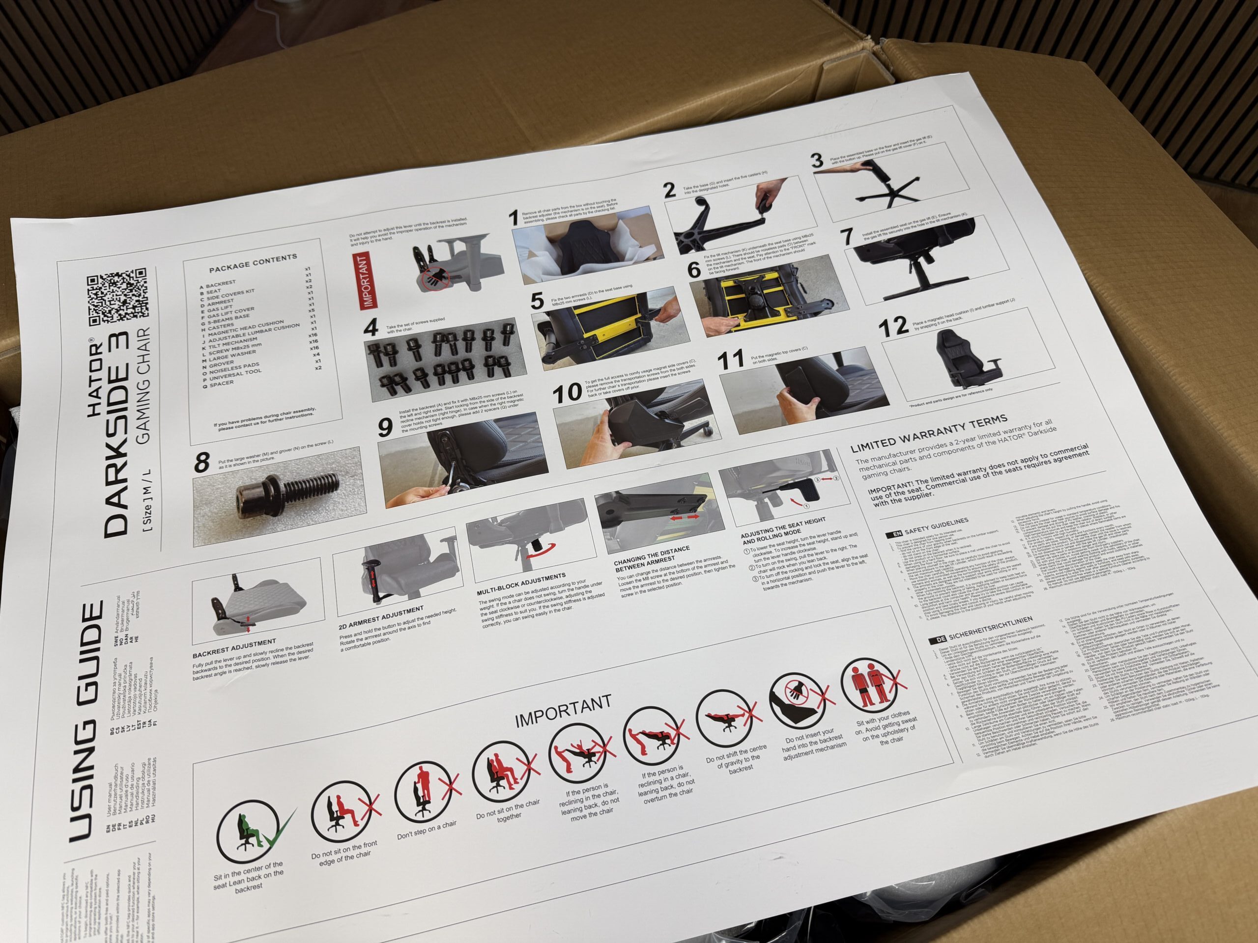 De Darkside 3 komt met twee losse armsteunen, een klasse 4-gasveer, smeermiddel, een gasveer-cover, de stoelbasis, een inbussleutel met schroeven, 65mm-wielen en een kunststof wielbasis.