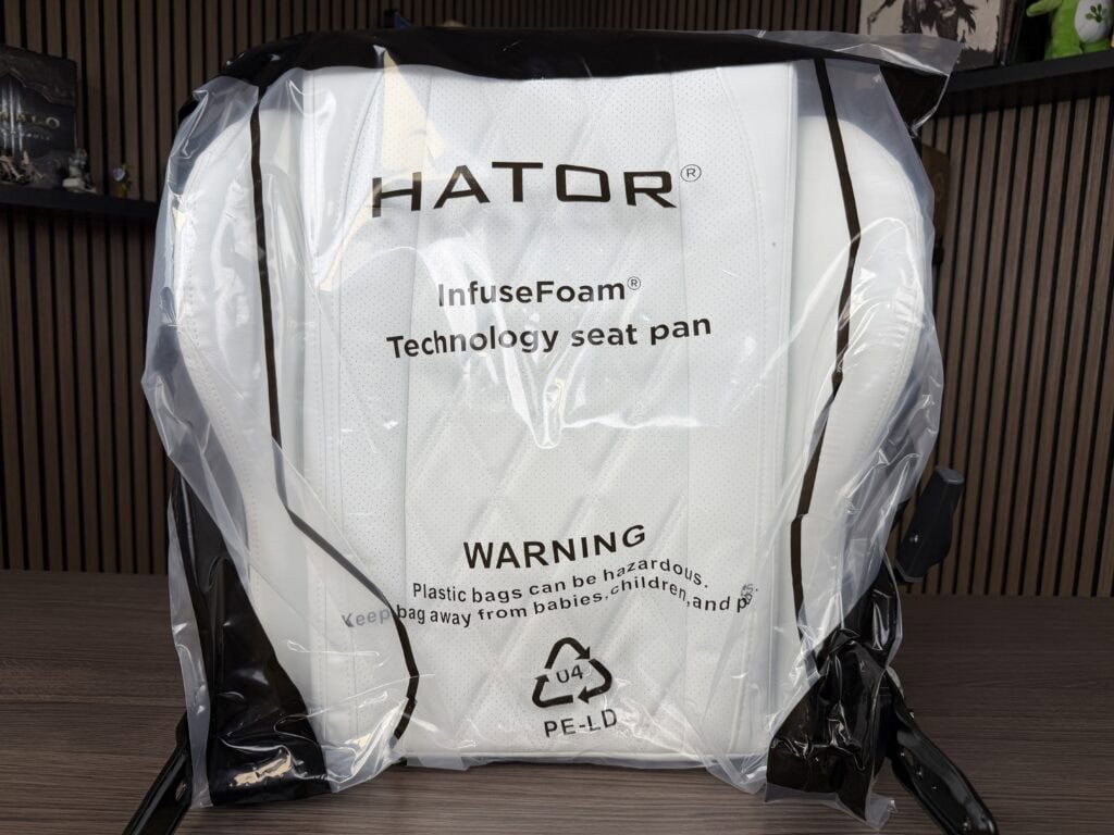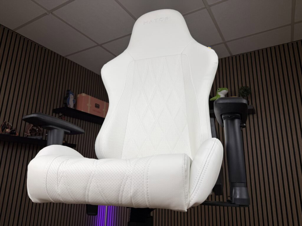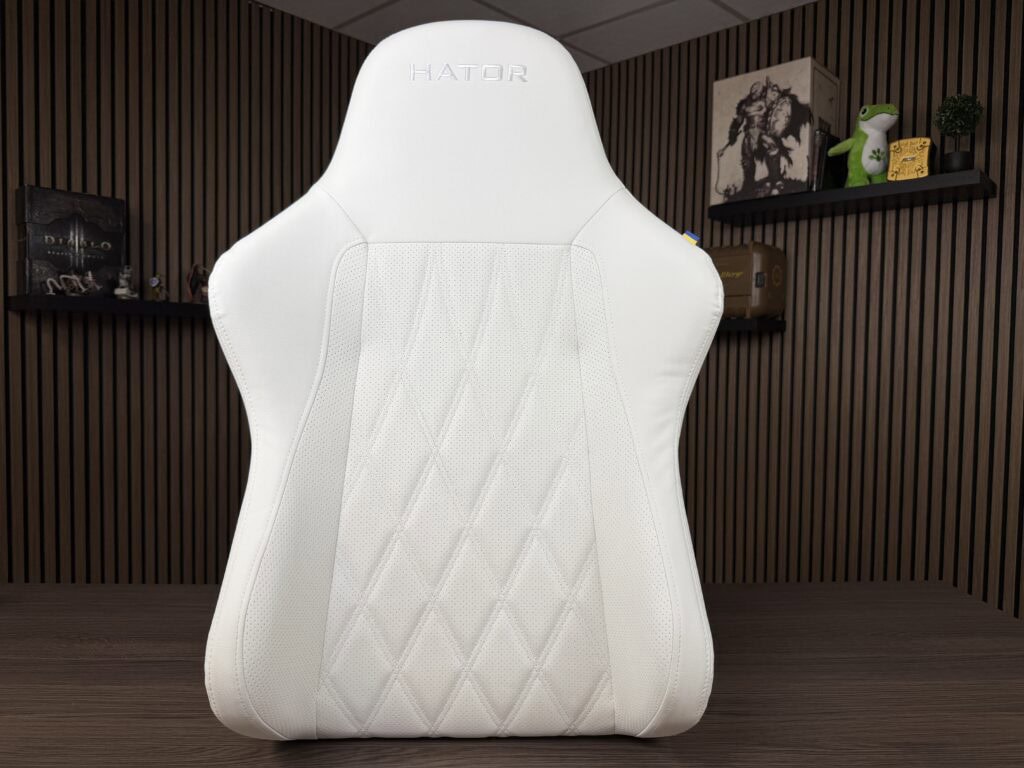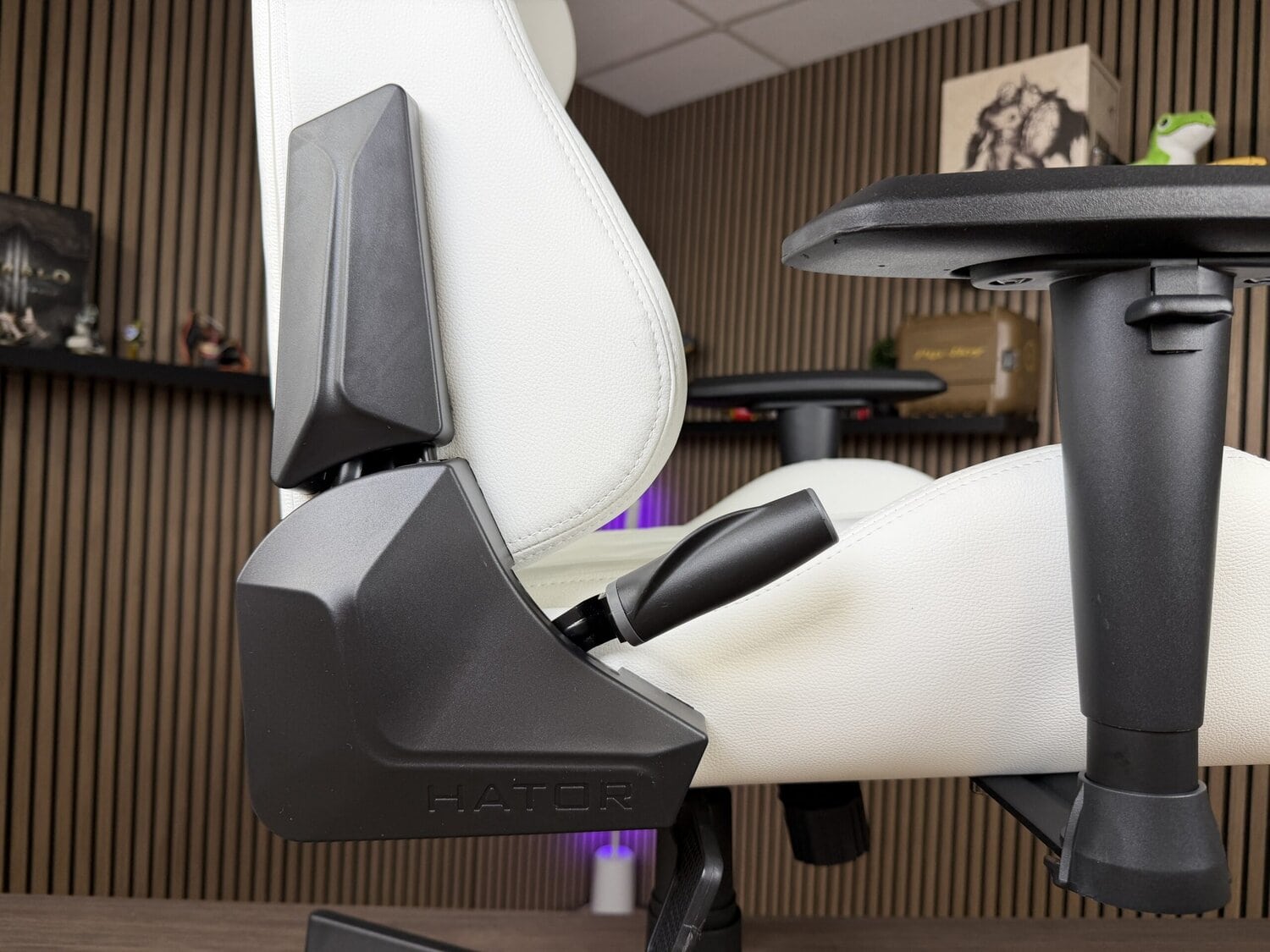 De rugsteun heeft een deftige stiksel afwerking. Ter hoogte van de hoofdsteun vinden we het Hator-woordmerk. Aan de achterzijde zit een NFC-chip. Hiermee kan je meer leren over deze gamestoel en volledig eigen maken.