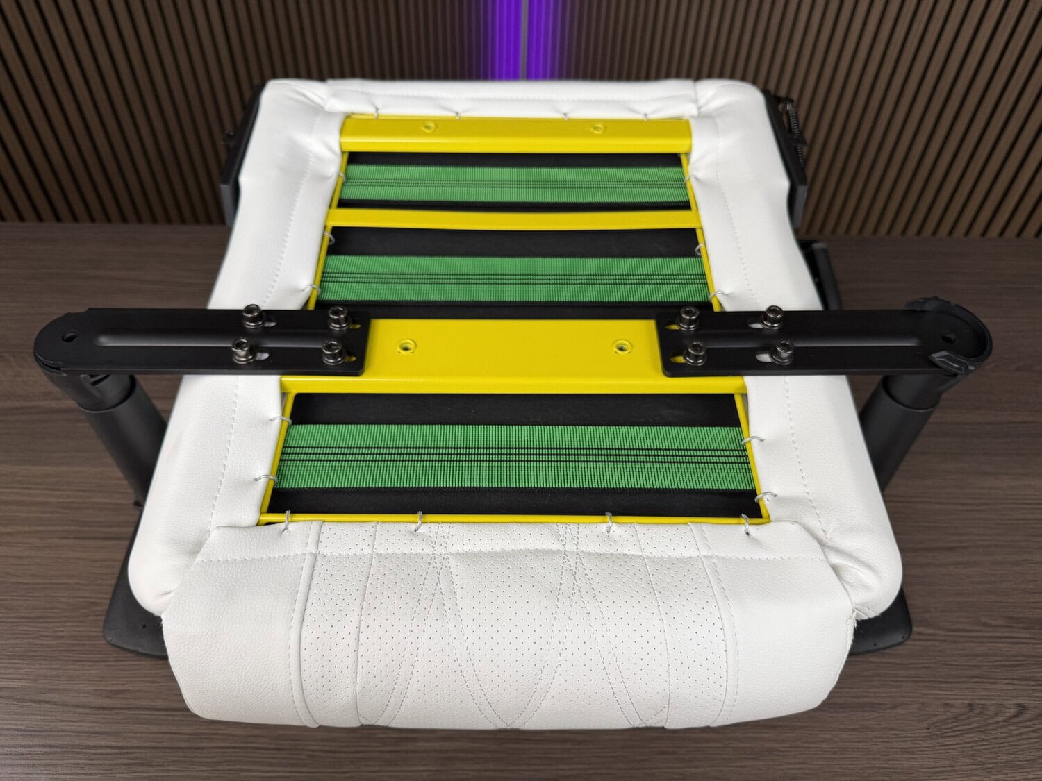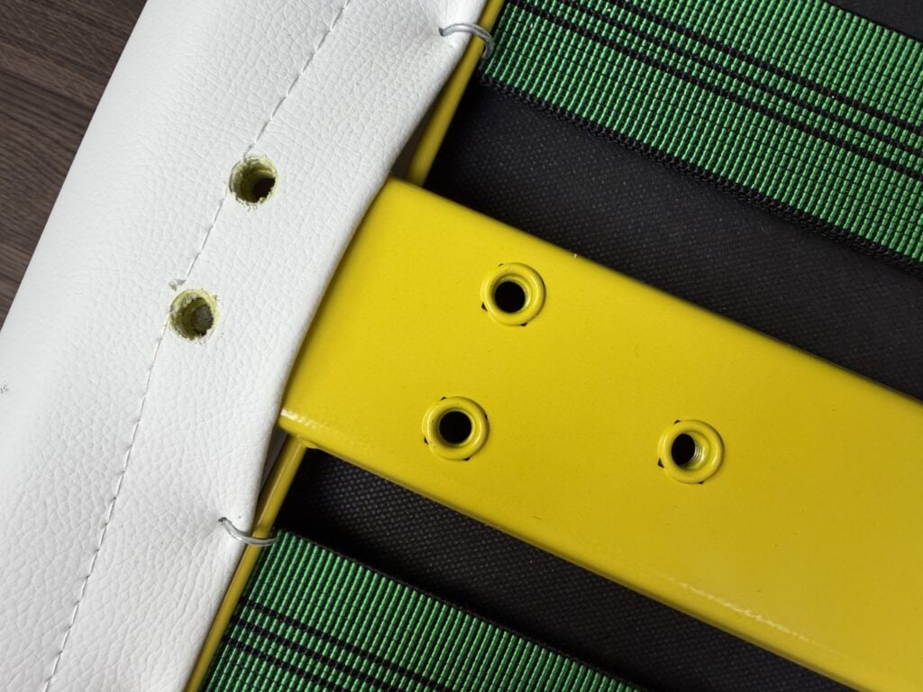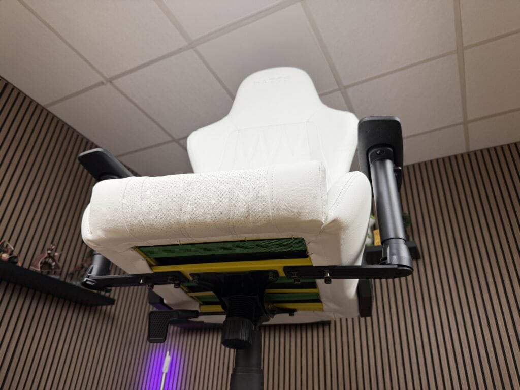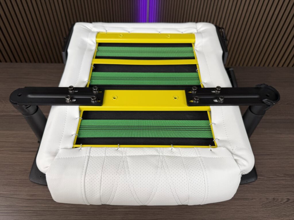 Het zitvlak is op de onderzijde voorzien van een groen met gele kleursamenstelling. De schroefgaten voor de armsteunen en stoelbasis zijn zichtbaar. Het plaatsen van de armsteunen verloopt eenvoudig met de meegeleverde inbussleutel en bijhorende schroeven. Iedere armsteun verlangt vier schroeven, waarna deze volledig gemonteerd is.