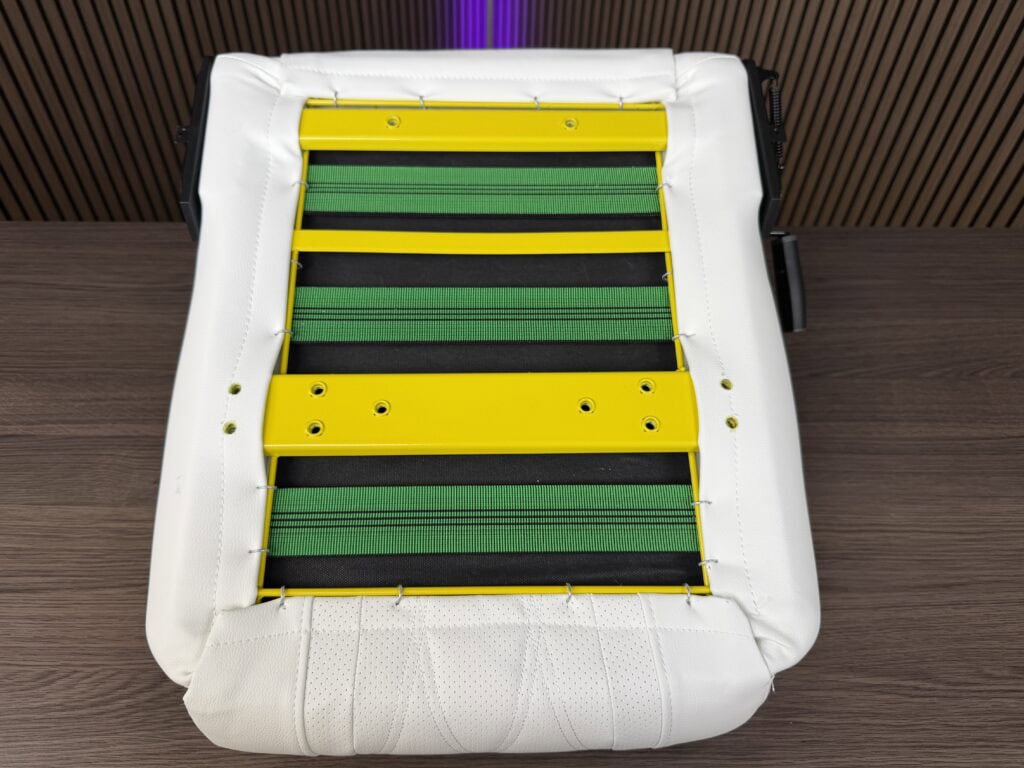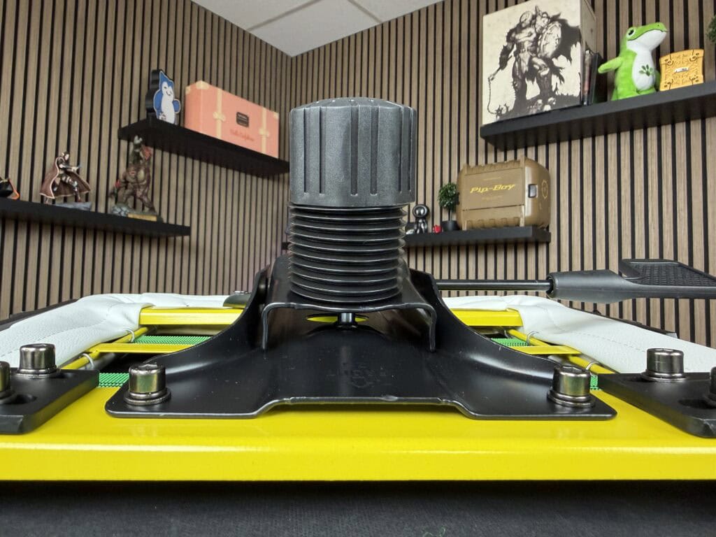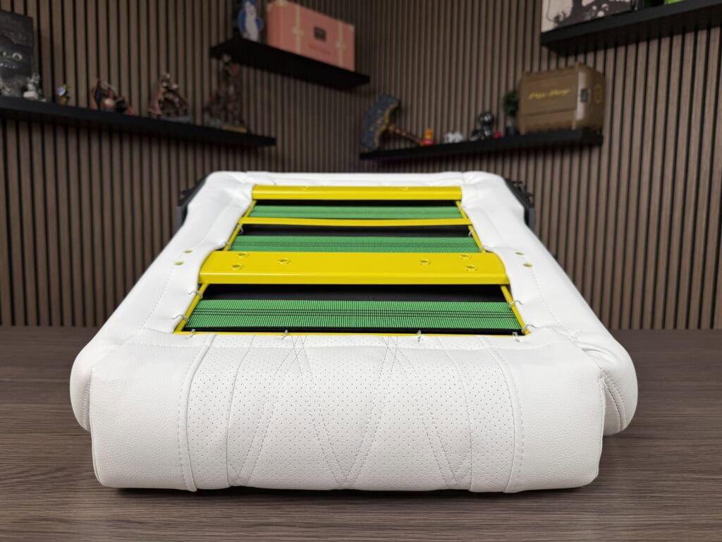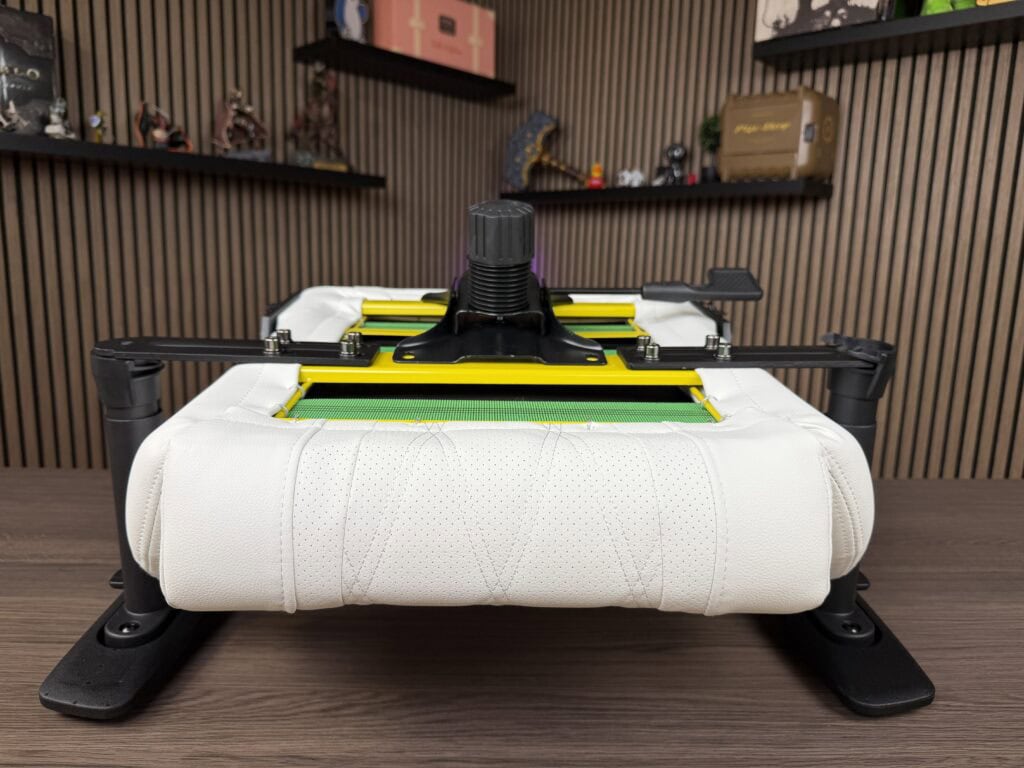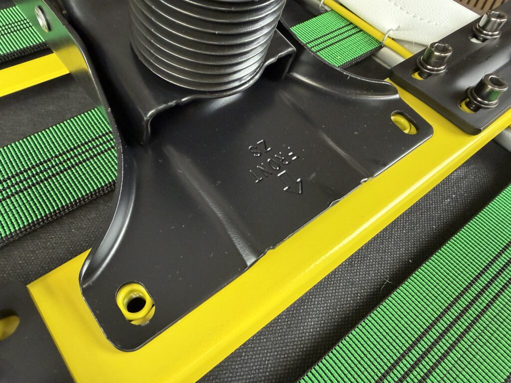 Het zitvlak is op de onderzijde voorzien van een groen met gele kleursamenstelling. De schroefgaten voor de armsteunen en stoelbasis zijn zichtbaar. Het plaatsen van de armsteunen verloopt eenvoudig met de meegeleverde inbussleutel en bijhorende schroeven. Iedere armsteun verlangt vier schroeven, waarna deze volledig gemonteerd is.